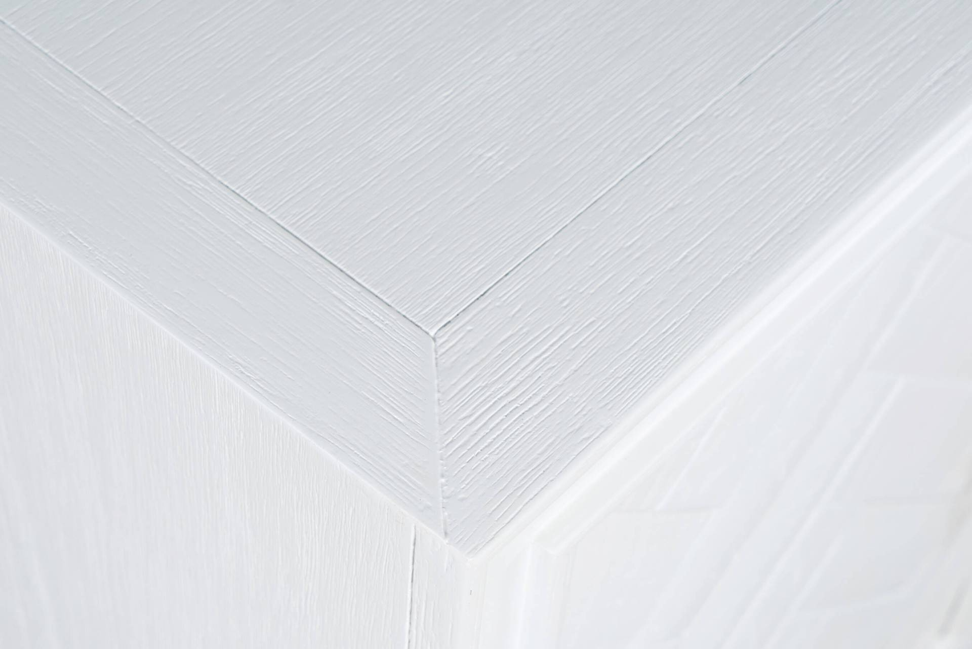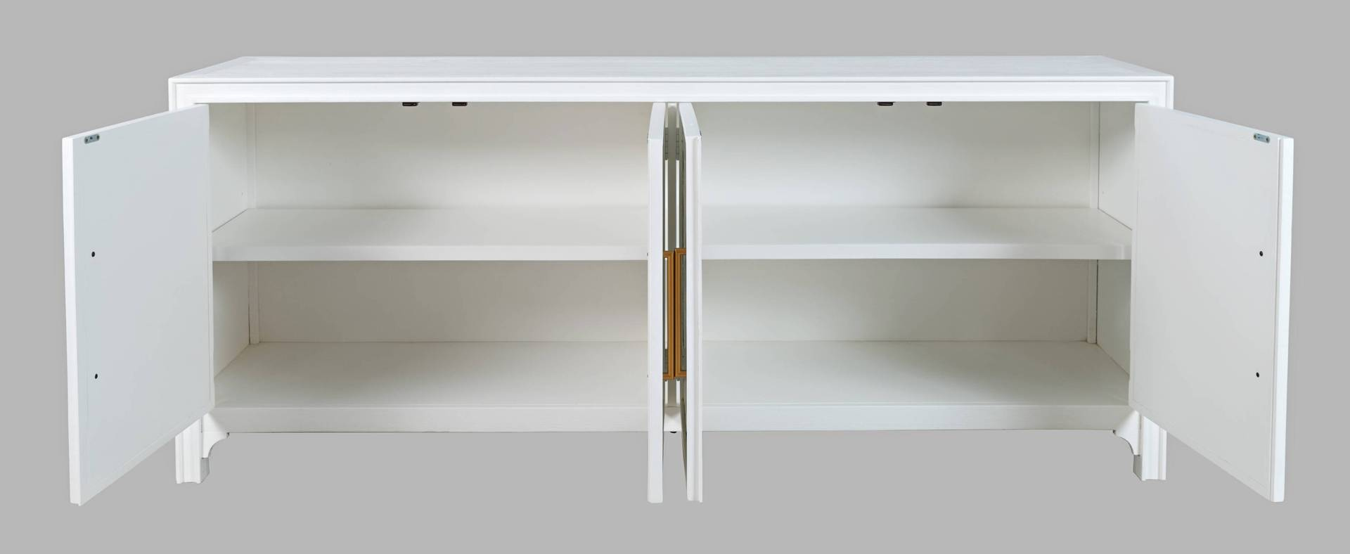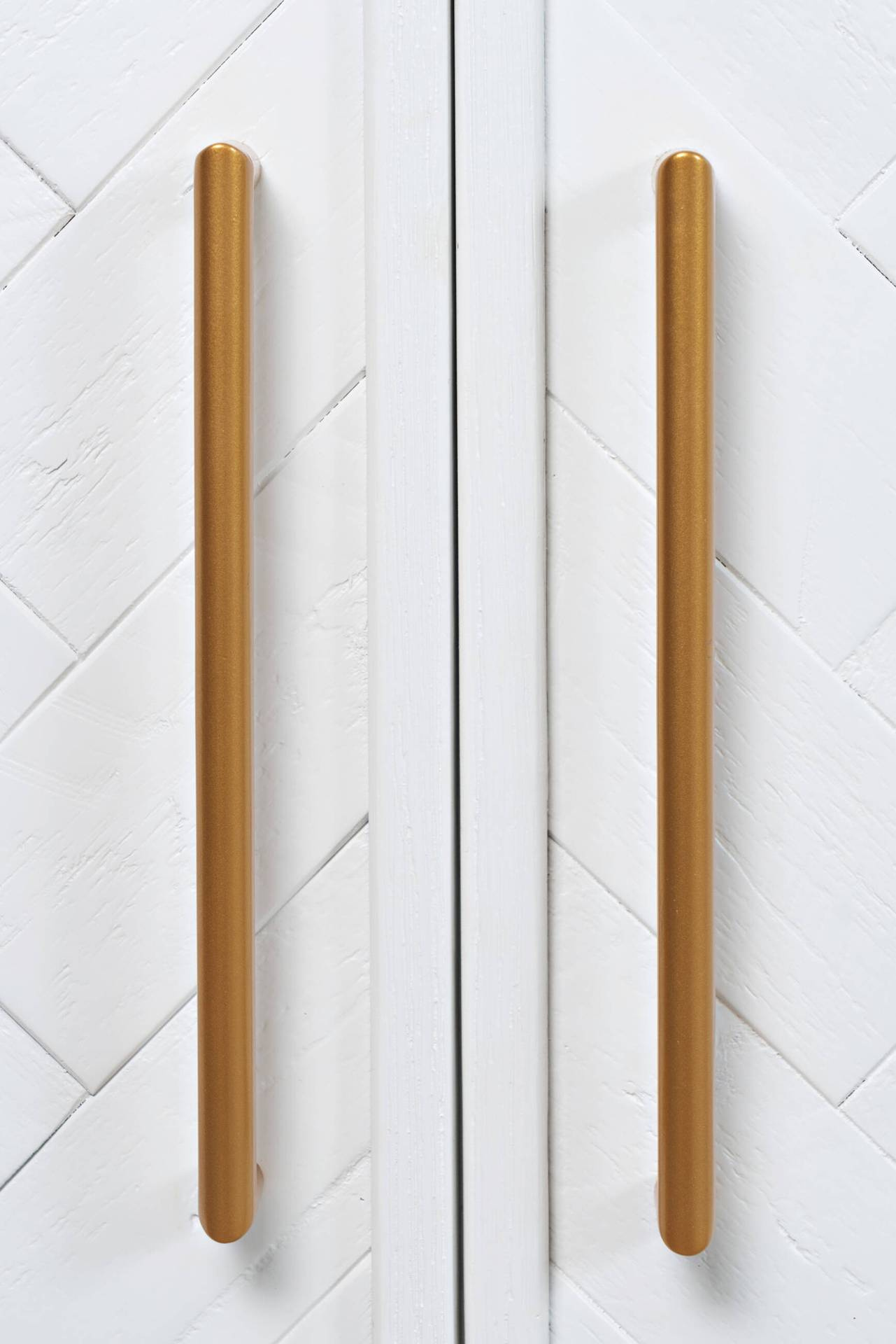 - Elegancka biała komoda z czworgiem drzwiczek z intarsją i dwiema półkami. Wykonana z drewna akacji, posiada metalowe uchwyty w kolorze złotym, niejednolitą strukturę oraz postarzenia w postaci przetarć.