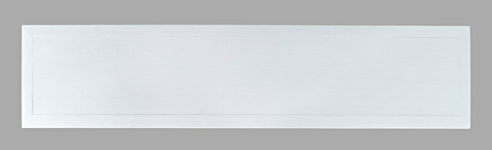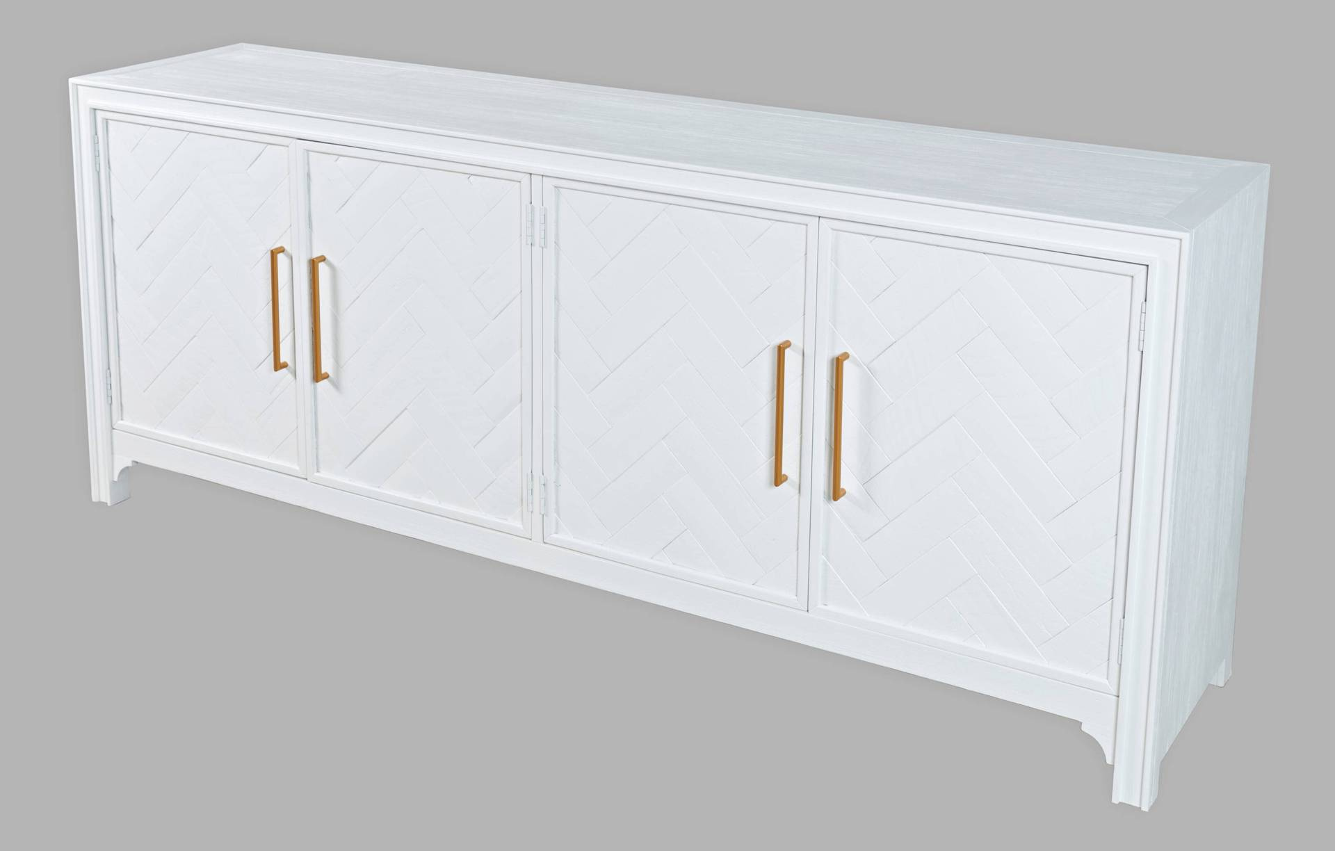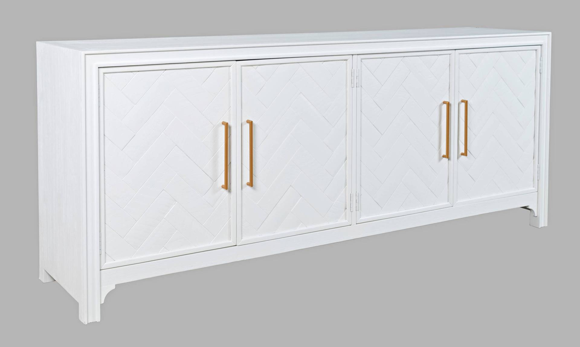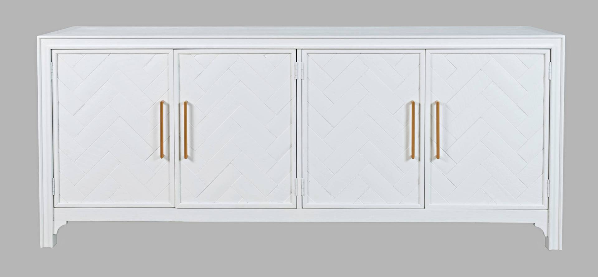 - Elegancka biała komoda z czworgiem drzwiczek z intarsją i dwiema półkami. Wykonana z drewna akacji, posiada metalowe uchwyty w kolorze złotym, niejednolitą strukturę oraz postarzenia w postaci przetarć.