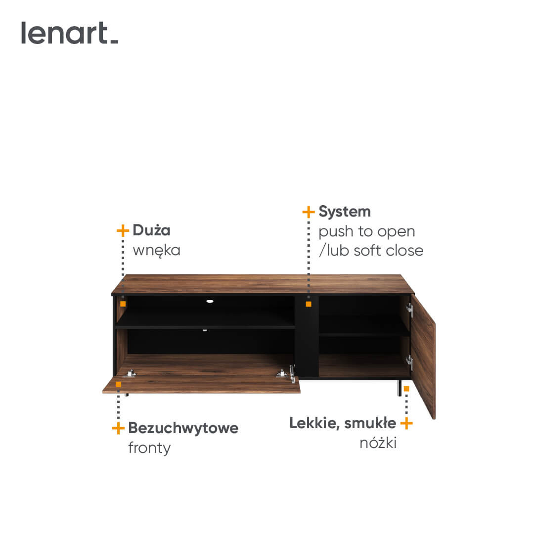 Szafka RTV BORGA BG-03 łączy elegancję z funkcjonalnością w nowoczesnym wydaniu. Czarny korpus w połączeniu z frontem w odcieniu dębu catania, system "push to open"/"soft close", praktyczne wnęki i organizacja kabli.