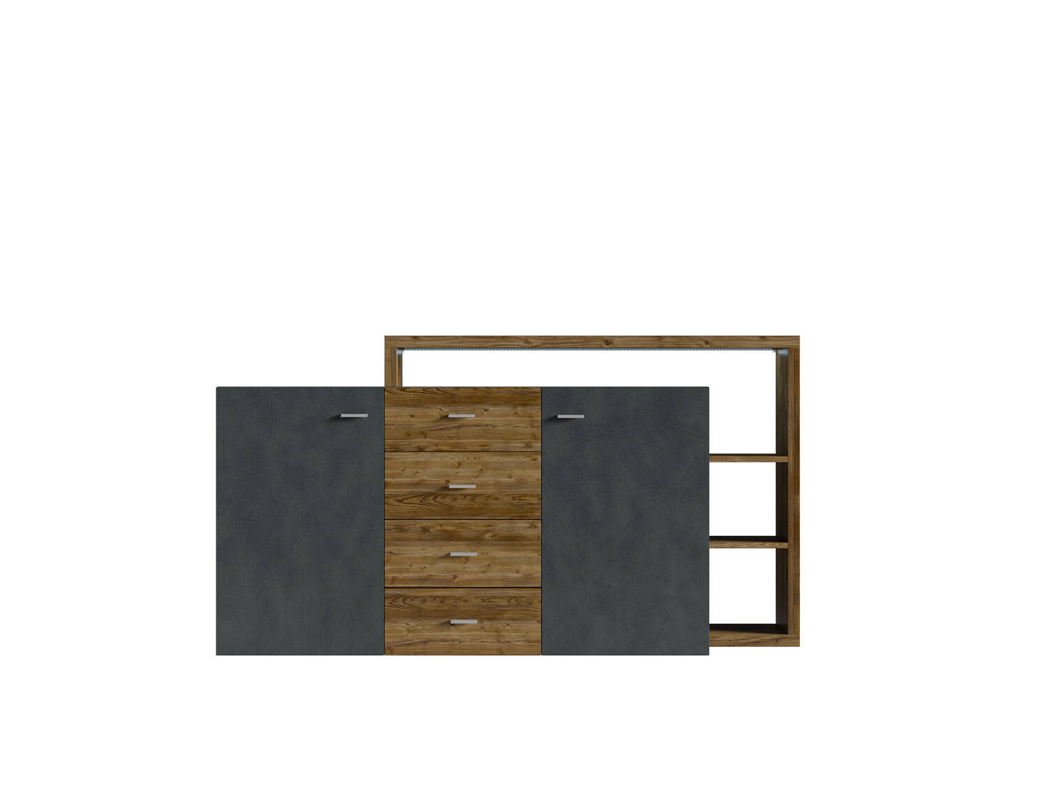 - Komoda Bota 2D4S to połączenie funkcjonalności i nowoczesnego designu. Oferuje przestrzenne szuflady, dwudrzwiową szafkę oraz otwarte półki, wykończone w kontrastowych odcieniach białego i betonu Colorado.