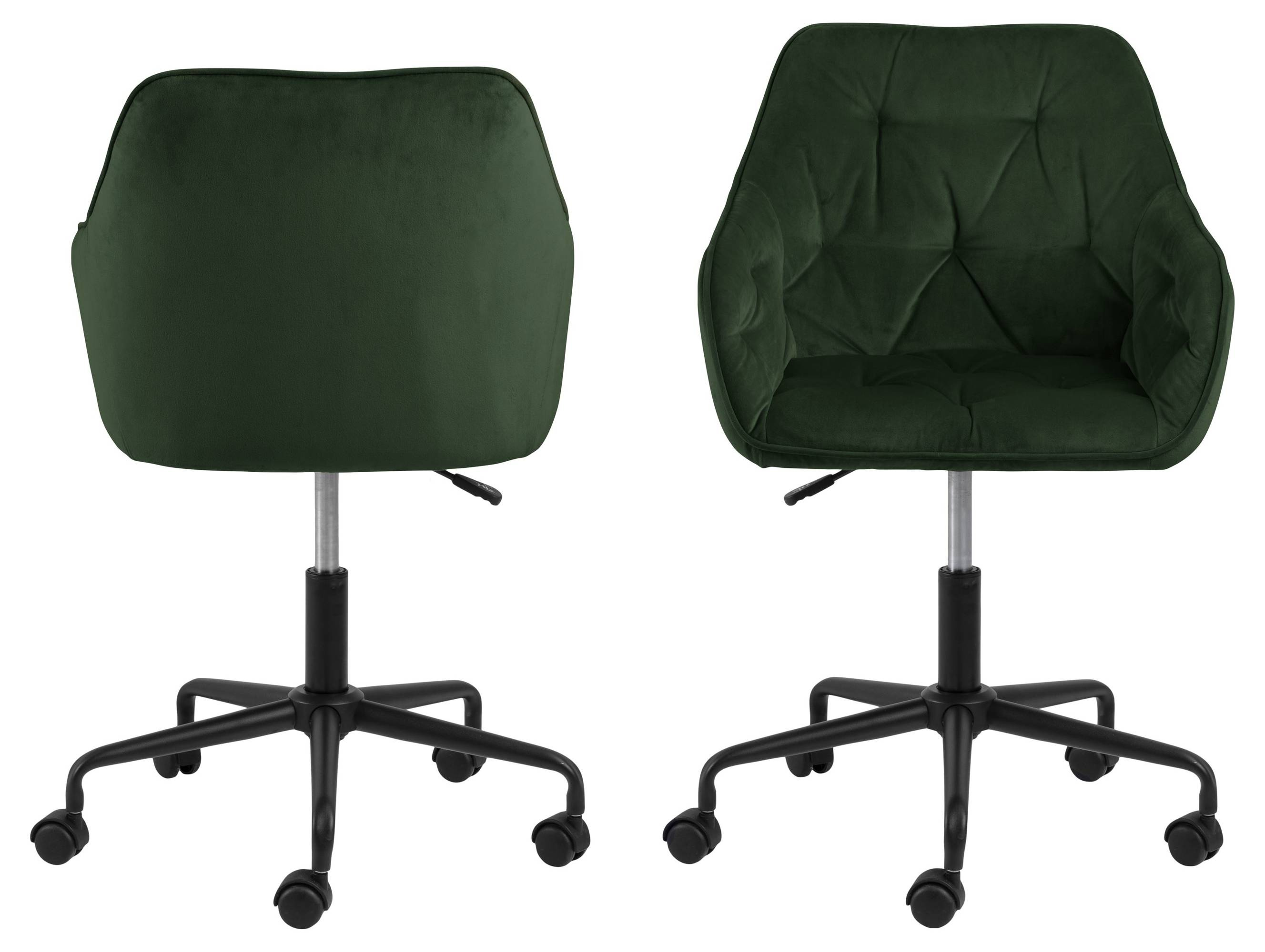 • Brooke krzesło do biurka, tkanina VIC leśna zieleń 68AC, podstawa metalowa matowa czarna szorstka malowana proszkowo, z kółkami z hamulcem, podnośnikiem gazowym, obrotowym i tapicerką.