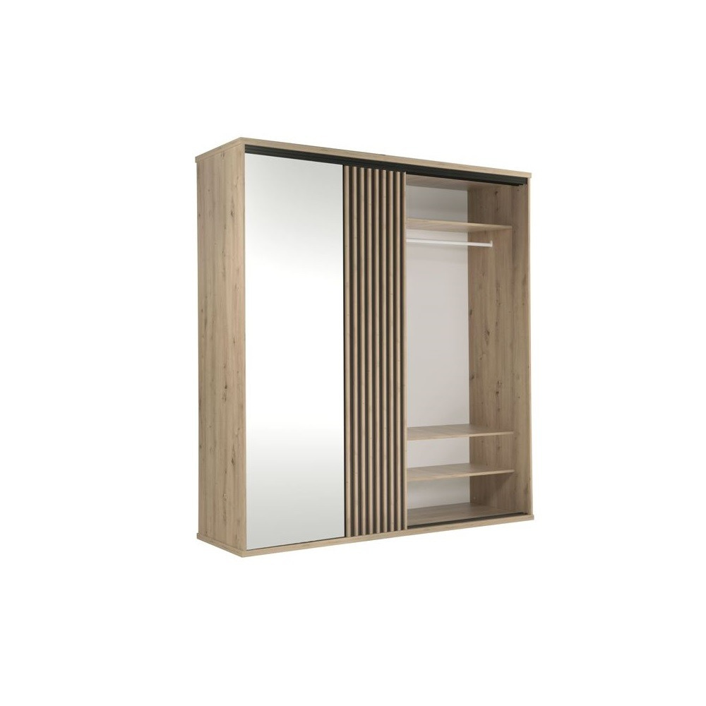 Odkryj nowoczesną szafę CALI-15 z przesuwnymi drzwiami w stylu loftowym. Naturalny odcień Artisan z czarnymi dodatkami i elegancką lamelą prezentuje się wyjątkowo. Duże lustro optycznie powiększa przestrzeń, zapewniając funkcjonalność i estetykę.
