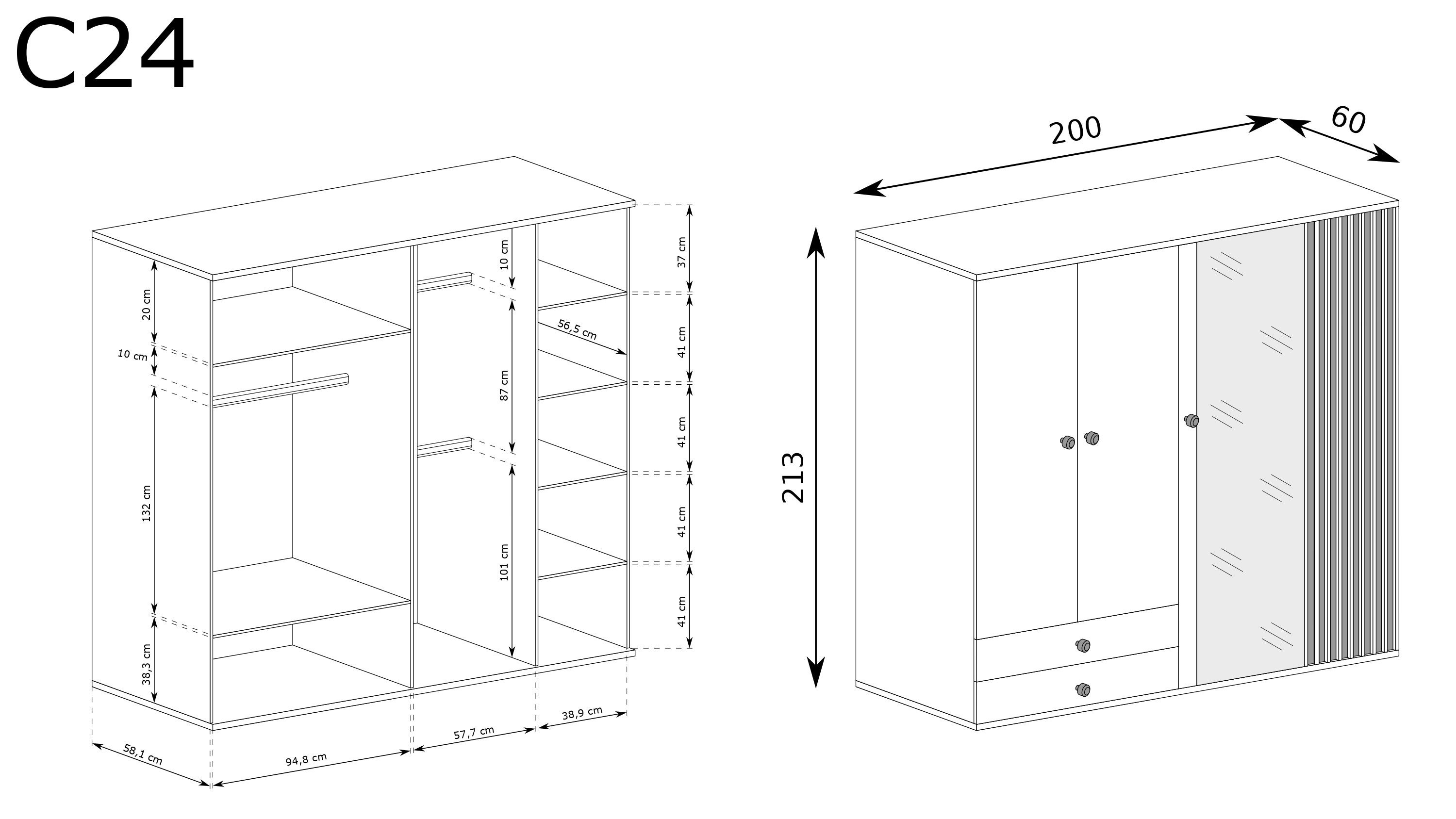 Szafa CALI-24 została starannie zaprojektowana, aby w maksymalny sposób wykorzystać przestrzeń, oferując jednocześnie wiele miejsca do przechowywania. Jej pojemne wnętrze umożliwia uporządkowanie ubrań oraz dodatków, co przylega do estetyki i praktyczności, której wszyscy szukamy w meblach. Dodatkowo, cichy domyk zawiasów sprawia, że korzystanie z szafy staje się komfortowe i bezproblemowe.