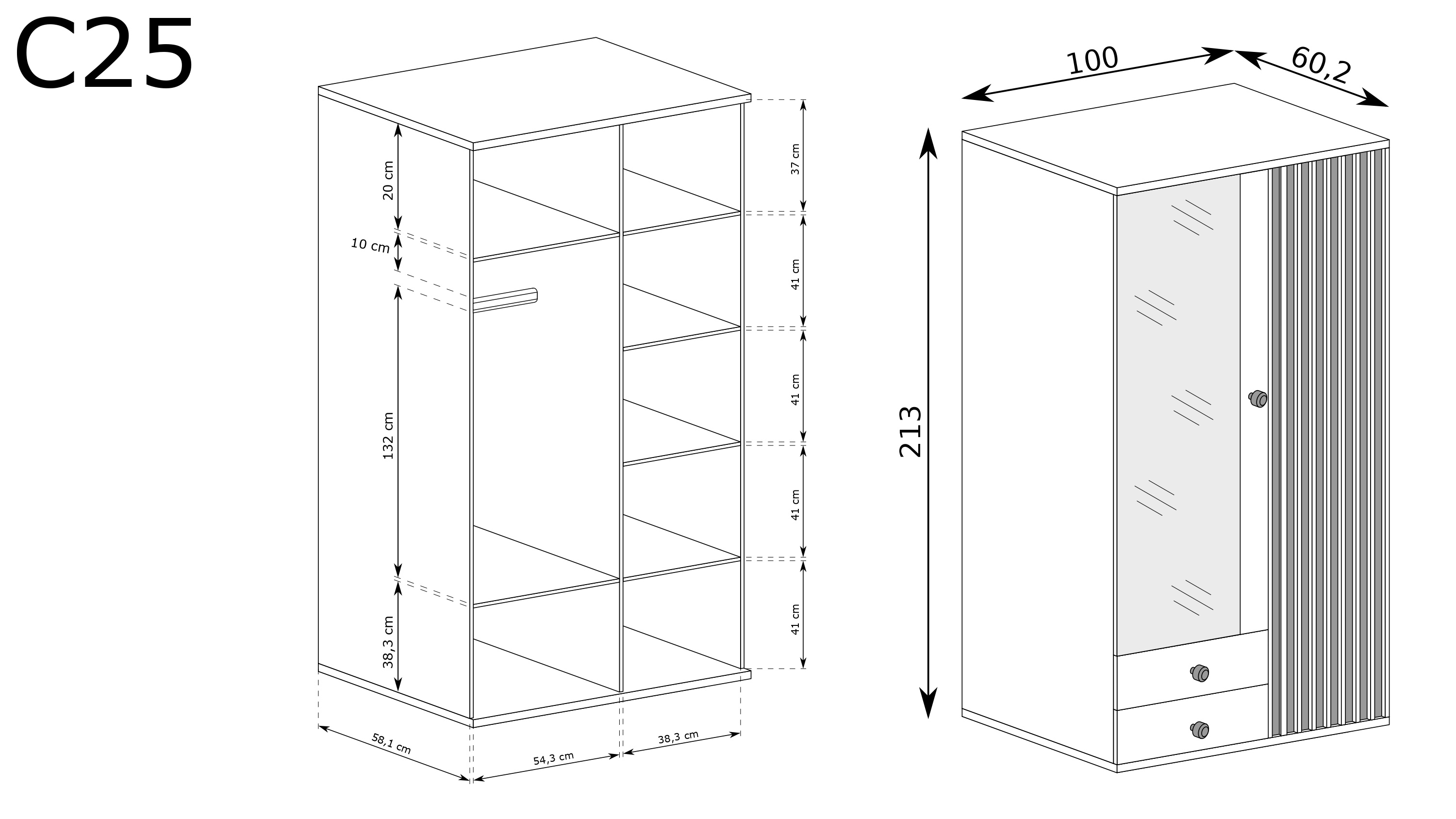 Dzięki samodzielnemu montażowi, możesz dostosować szafę do swoich potrzeb i gustów. To idealne rozwiązanie dla osób ceniących sobie niezależność oraz możliwość aranżacji przestrzeni według własnych preferencji. Szafa CALI-25 to połączenie stylu, funkcjonalności i wygody, które wpisuje się w najnowsze trendy wnętrzarskie, a jednocześnie zachowuje swój unikatowy charakter.