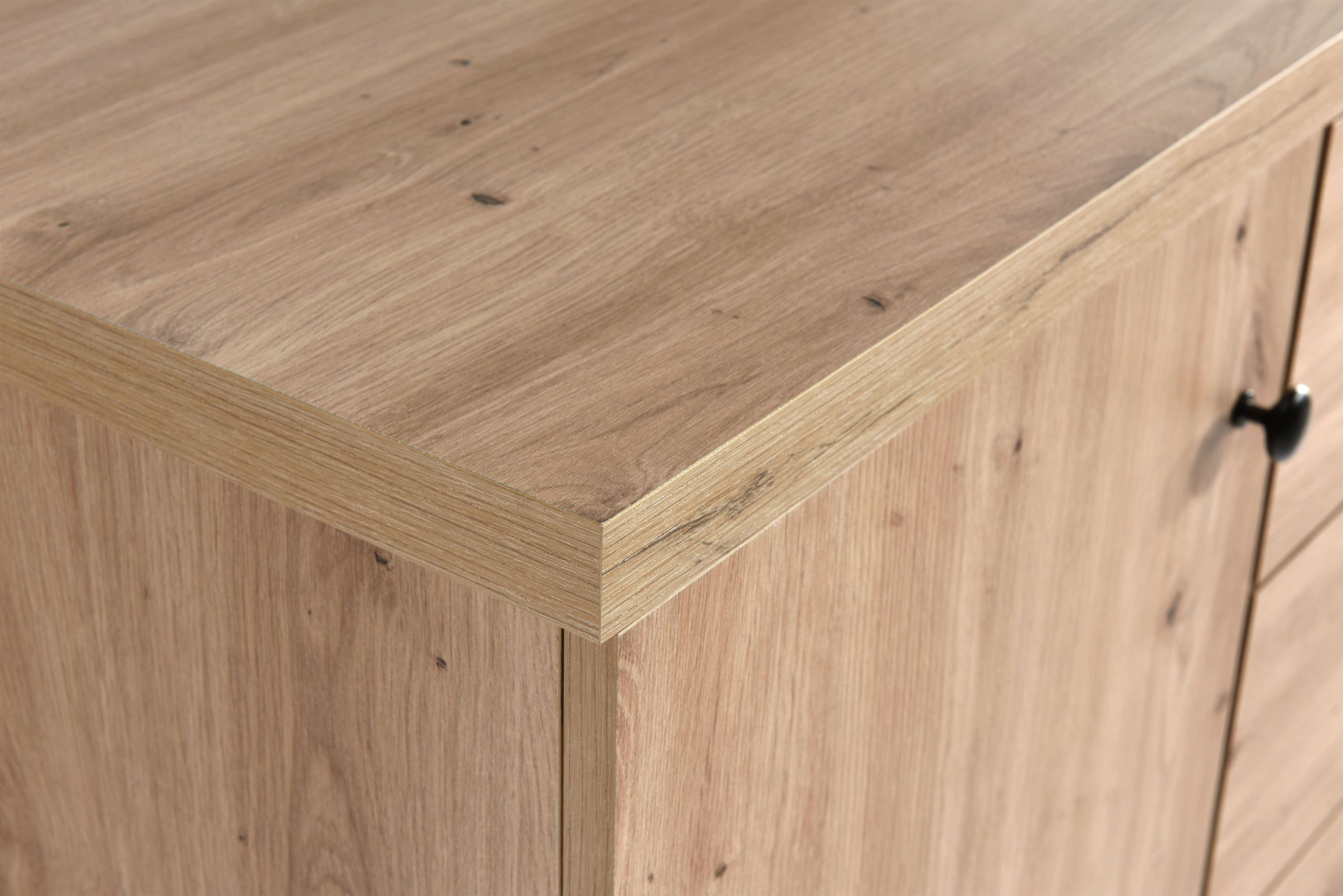 Komoda RTV CALI-6czarny front z lamelami, co nadaje jej niepowtarzalnego stylu. Wykonana z laminowanej płyty w kolorze Artisan, komoda emanuje ciepłem i naturalnym charakterem, co tworzy przytulną atmosferę w Twoim salonie.