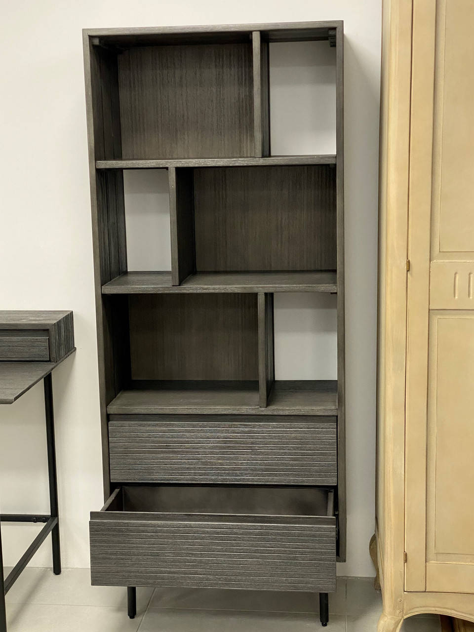 - Nowoczesny regał z 2 szufladami i 3 półkami w stylu retro w pięknym odcieniu szarości.