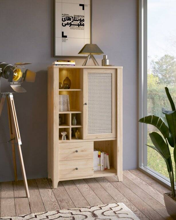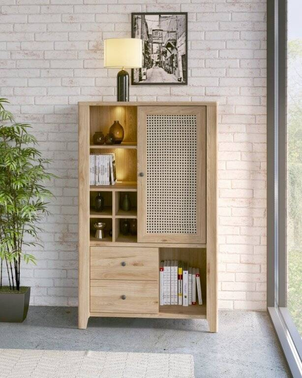 Mebel ten pasuje zarówno do salonu, jadalni, domowego gabinetu, jak i pokoju młodzieżowego, łącząc w sobie elementy stylu boho. Oferuje zarówno półki otwarte, jak i zamknięte, za pełnym frontem, dzięki czemu możesz zdecydować, co chcesz wyeksponować, a co dyskretnie schować.