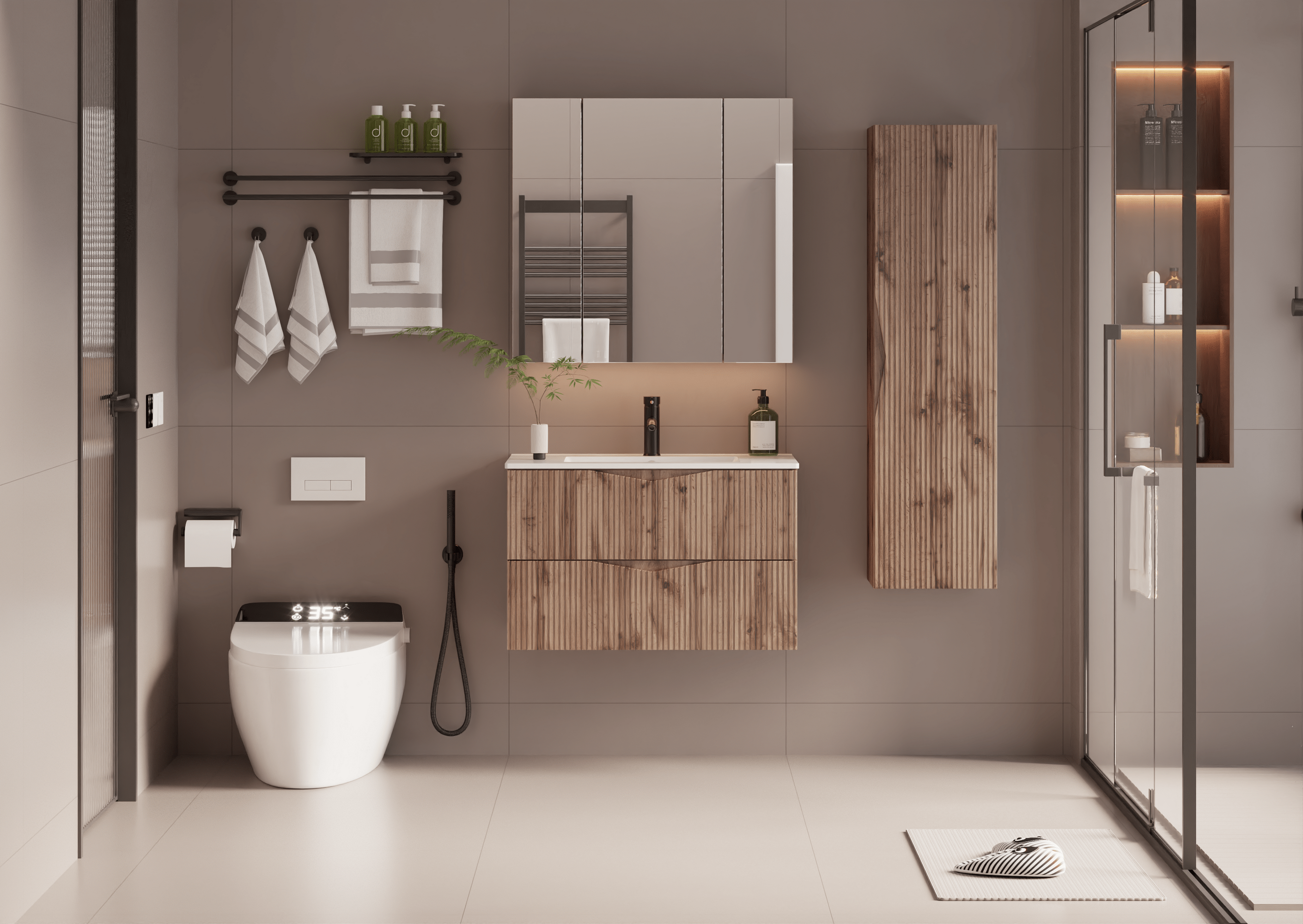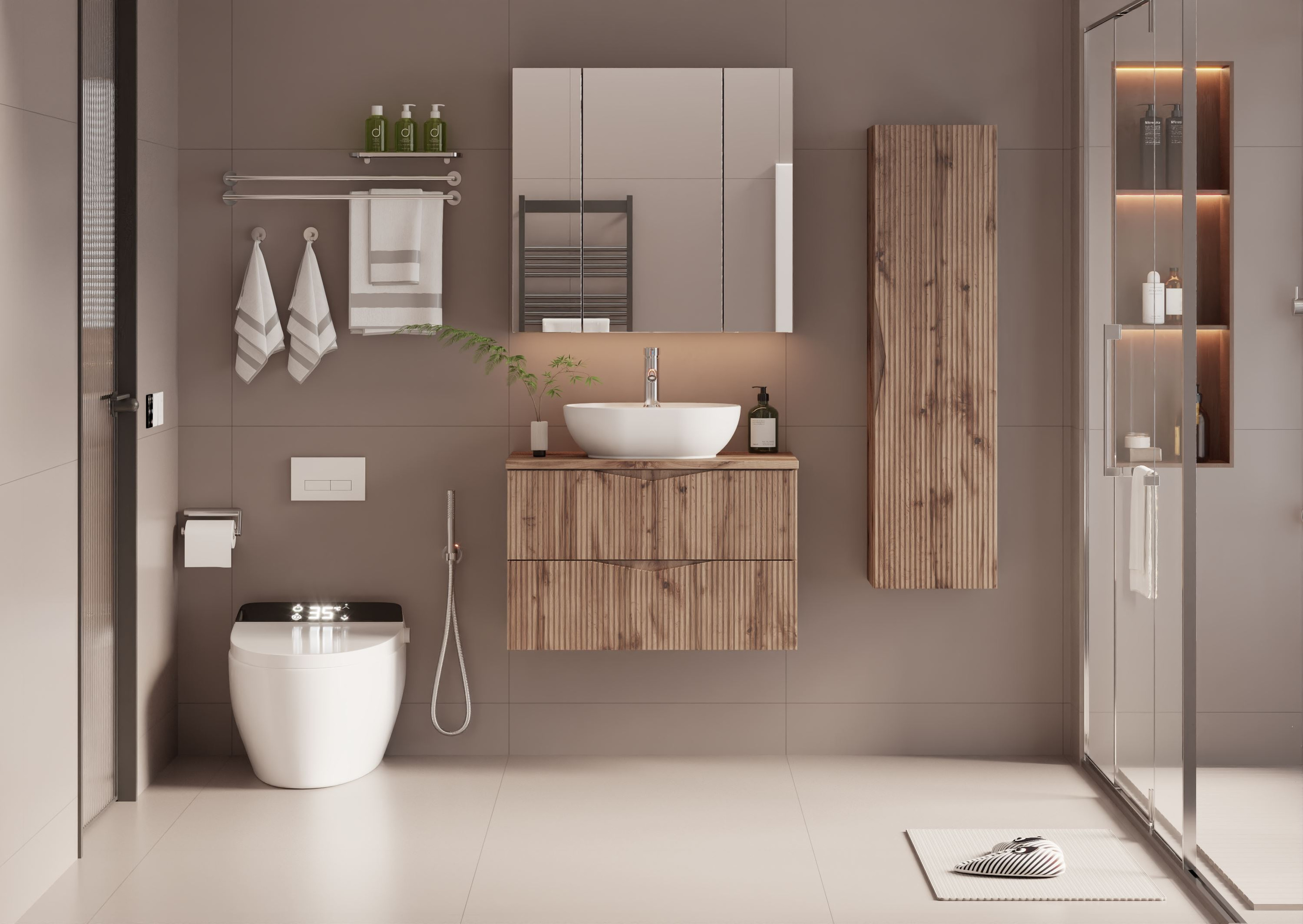 Praktyczność i estetyka idą w parze w modelu CLEO-01. Mimo niewielkich wymiarów, szafka oferuje wystarczająco dużo miejsca na wszystko, czego potrzebujesz w łazience - od kosmetyków, po środki czystości. Jej montaż na ścianie nie tylko ułatwia utrzymanie porządku, ale także optycznie powiększa przestrzeń, co jest istotnym atutem w małych pomieszczeniach.