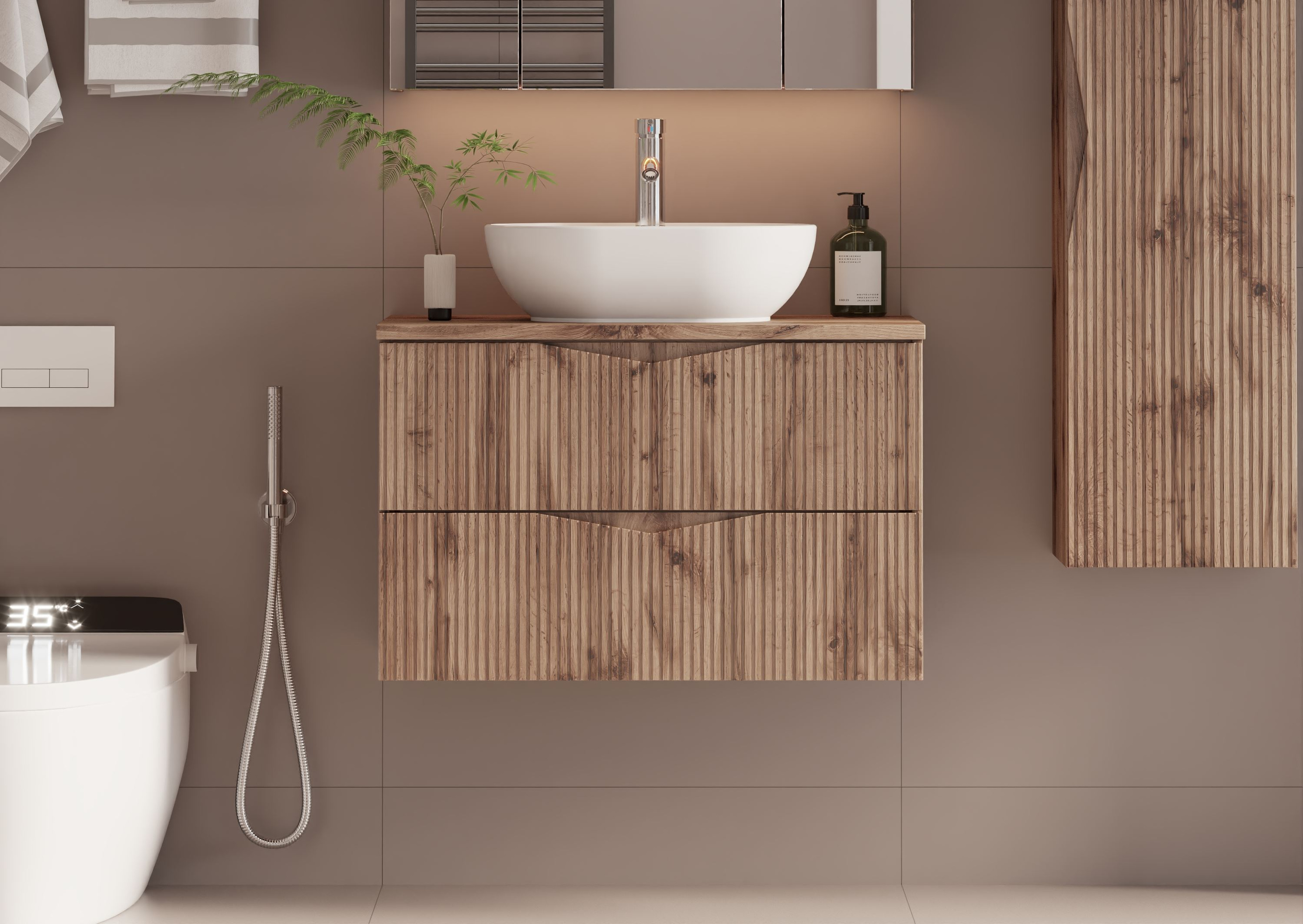 Szafka pod umywalkę CLEO-01 to idealne połączenie nowoczesnego designu i funkcjonalności, które wpasuje się w każde wnętrze łazienkowe. Dzięki zastosowaniu eleganckiego odcienia Dębu Wotan, mebel ten wprowadza do pomieszczenia przytulną atmosferę, a jednocześnie dodaje mu stylowego charakteru. Szerokość 80 cm sprawia, że można go łatwo zaaranżować, nawet w mniejszych przestrzeniach.