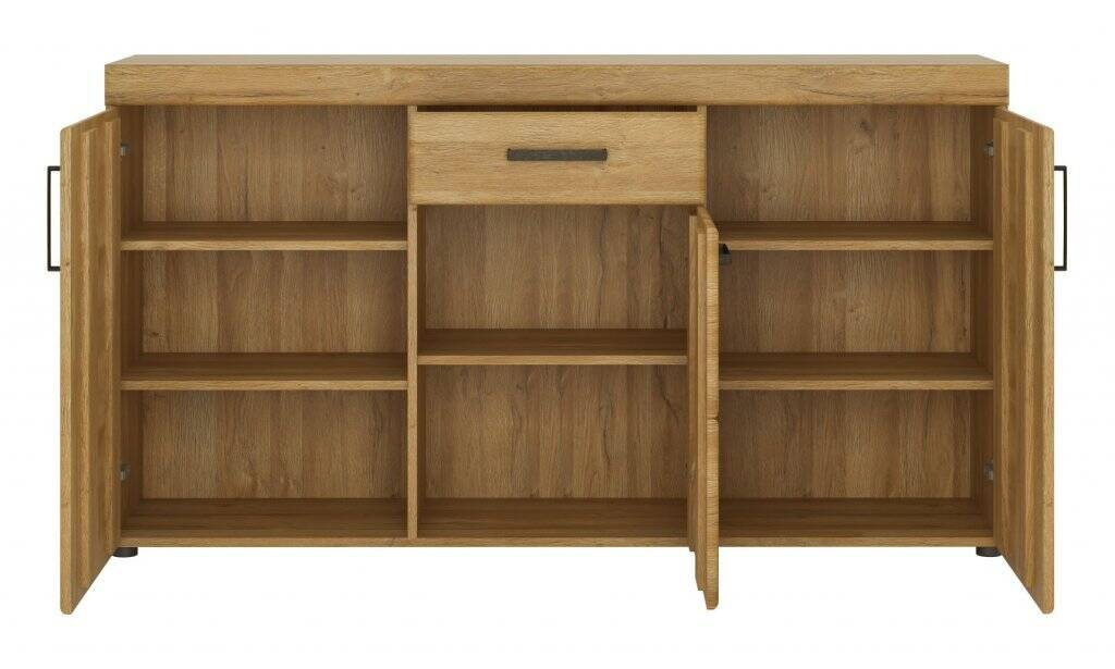 - Komoda Cortina 3D1S w kolorze dębu Grandson to elegancki mebel z 3 drzwiami i szufladą wyposażony w system cichego domykania. Pojemne wnęki i wytrzymałe wykonanie z płyty MDF i laminowanej zapewniają funkcjonalność i trwałość.