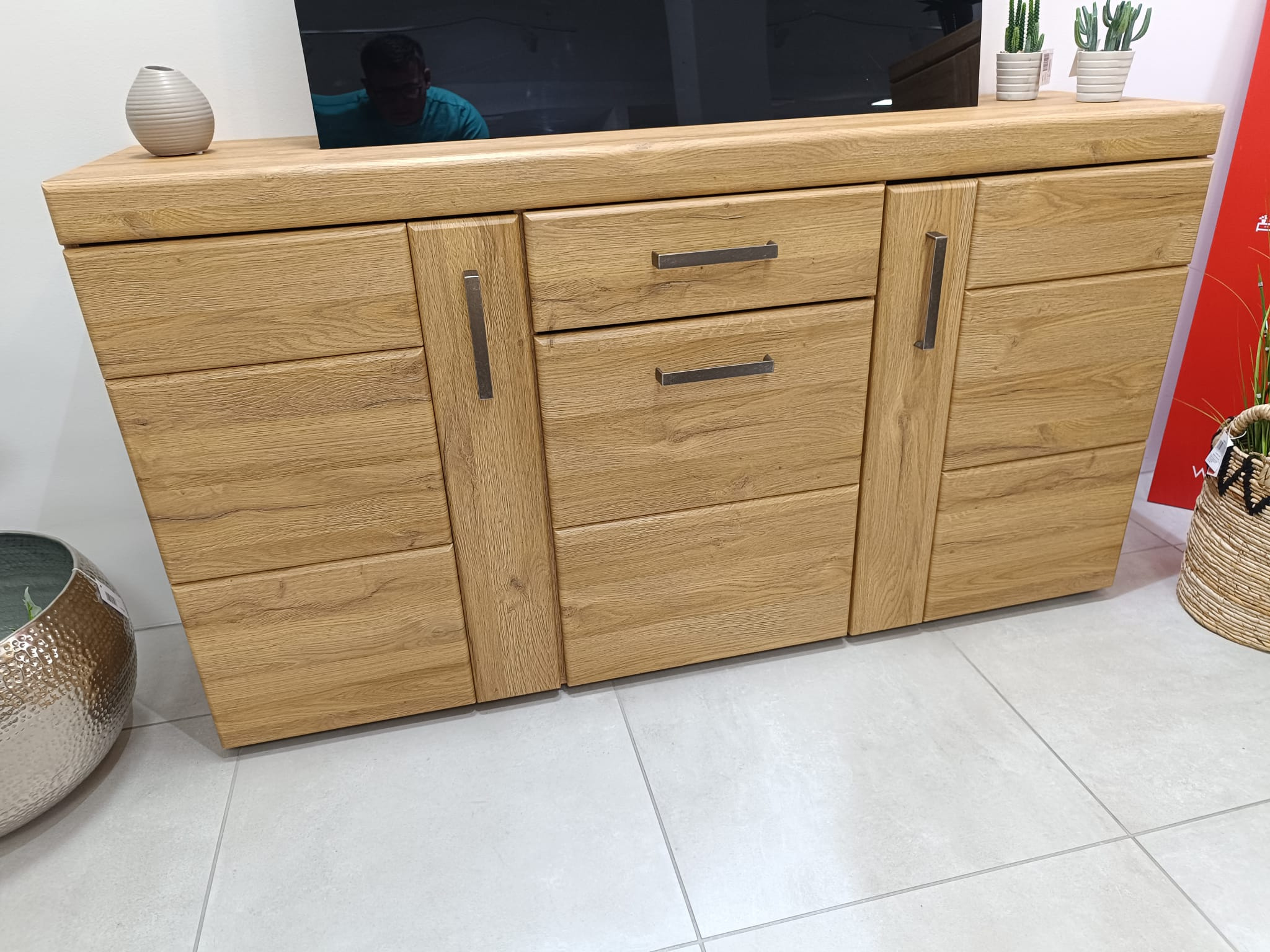 Wymiary komody (156,8 cm szerokość x 86 cm wysokość x 40,9 cm głębokość) są przemyślane, aby wykorzystać każdy centymetr przestrzeni. Przestronne wnęki i funkcjonalna szuflada z łatwością pomieszczą zarówno dekoracje, jak i niezbędne przedmioty codziennego użytku. Rozmiary komody sprawiają, że idealnie wpisuje się ona zarówno do przestronnych salonów, jak i przytulnych sypialni.