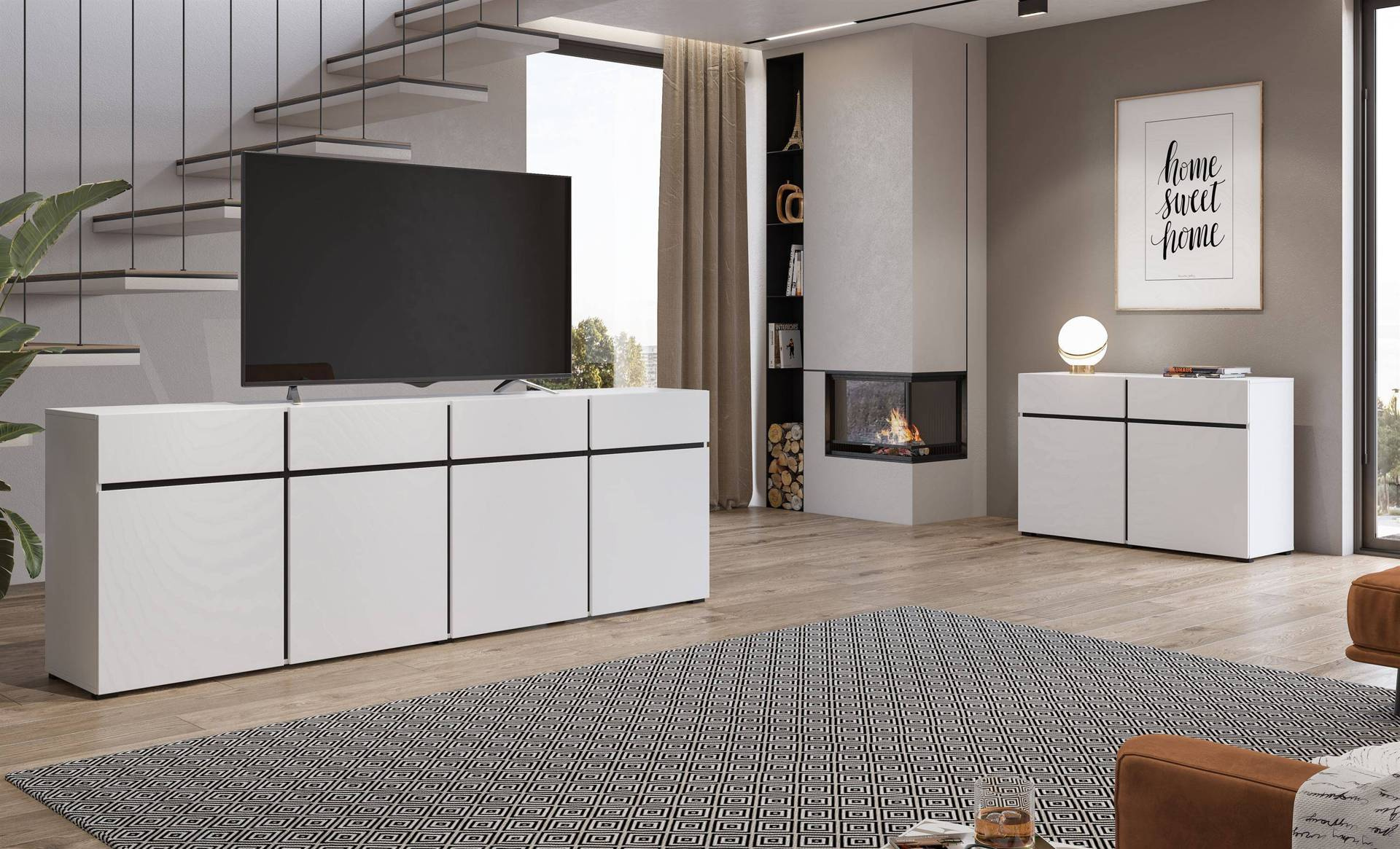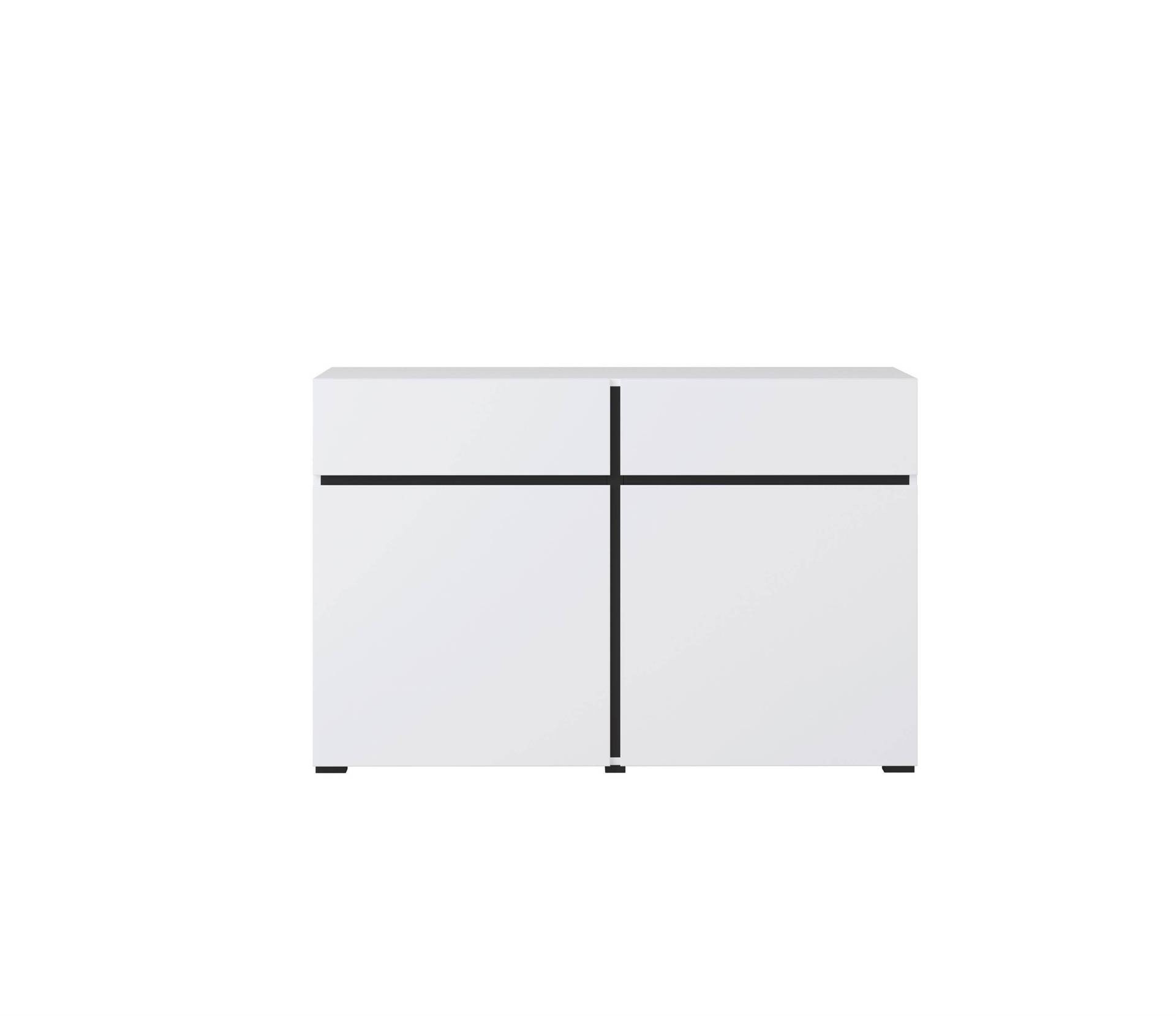 Nowoczesna komoda Cross od Helvetia to stylowe połączenie białego i czarnego matu. Wykonana z trwałych płyt laminowanych, oferuje 2 drzwi i 2 szuflady z prowadnicami rolkowymi. Idealna do każdego wnętrza, zapewnia funkcjonalność i elegancję.
