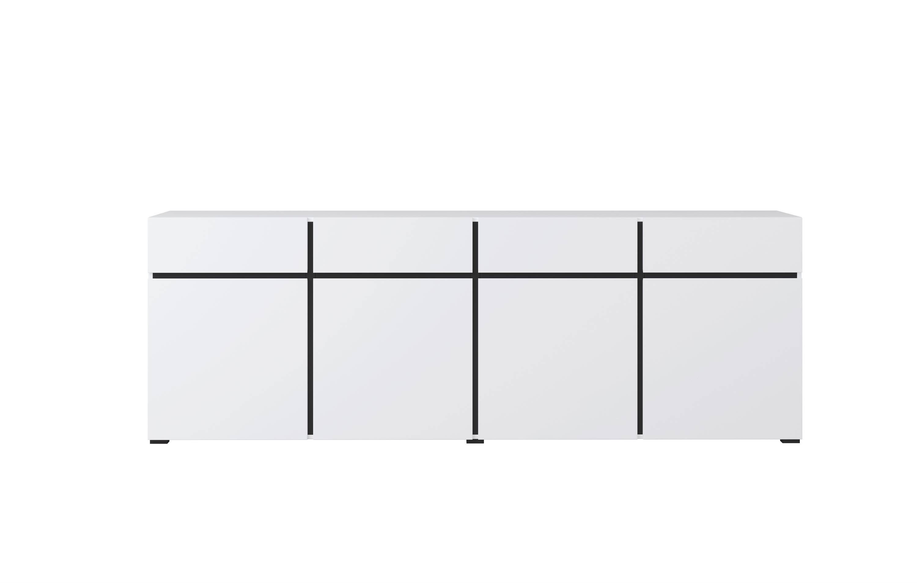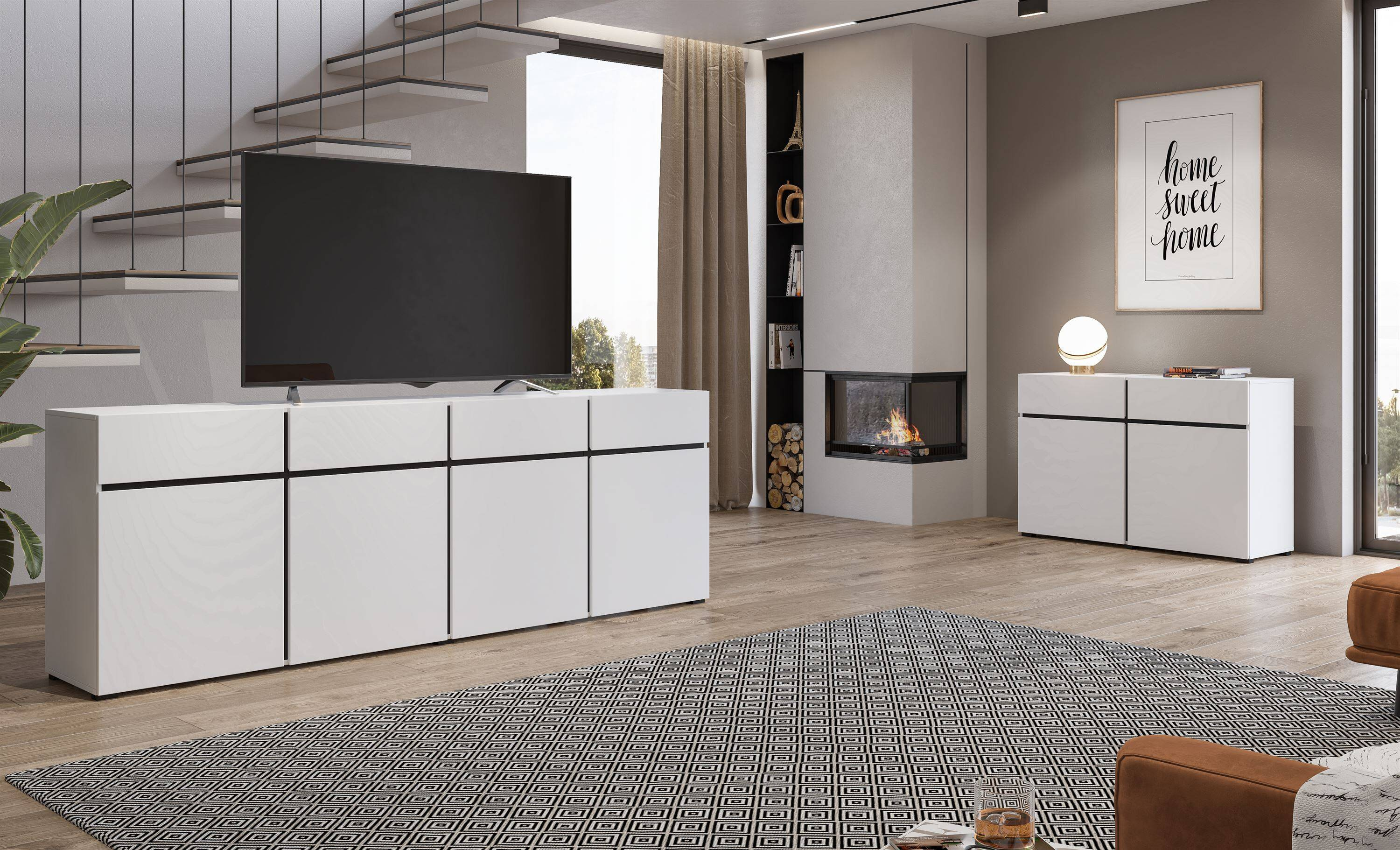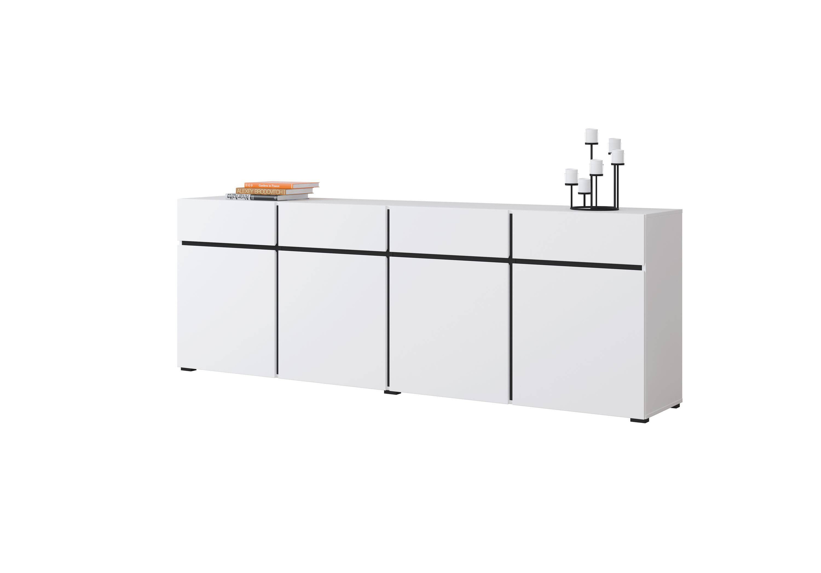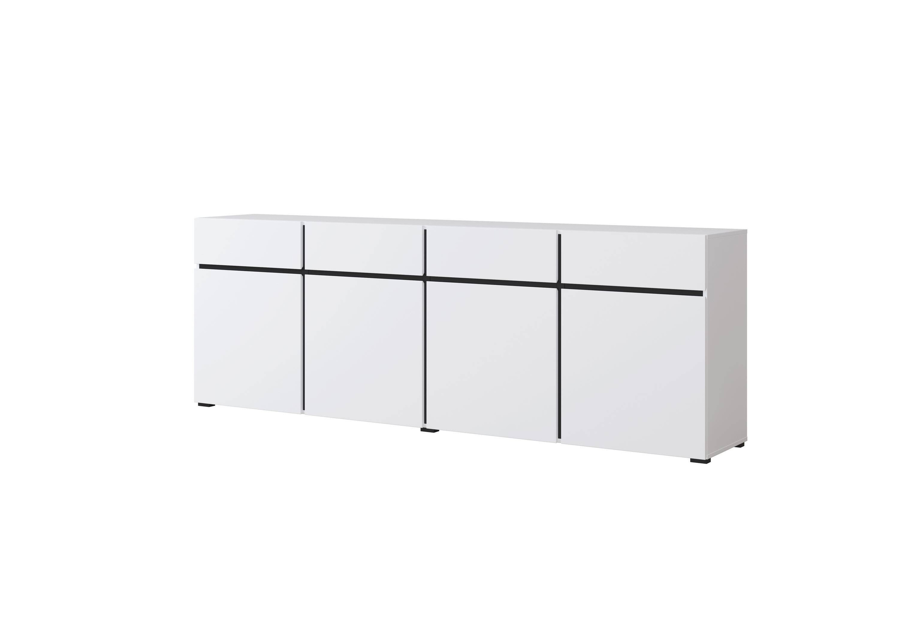 Komoda Cross od Helvetia to elegancki wybór do nowoczesnych wnętrz. Biały i czarny matowy front z płyty laminowanej dodaje jej szyku. Posiada cztery drzwi i cztery szuflady, oferując dużo miejsca na przechowywanie. Łatwy montaż samodzielny.