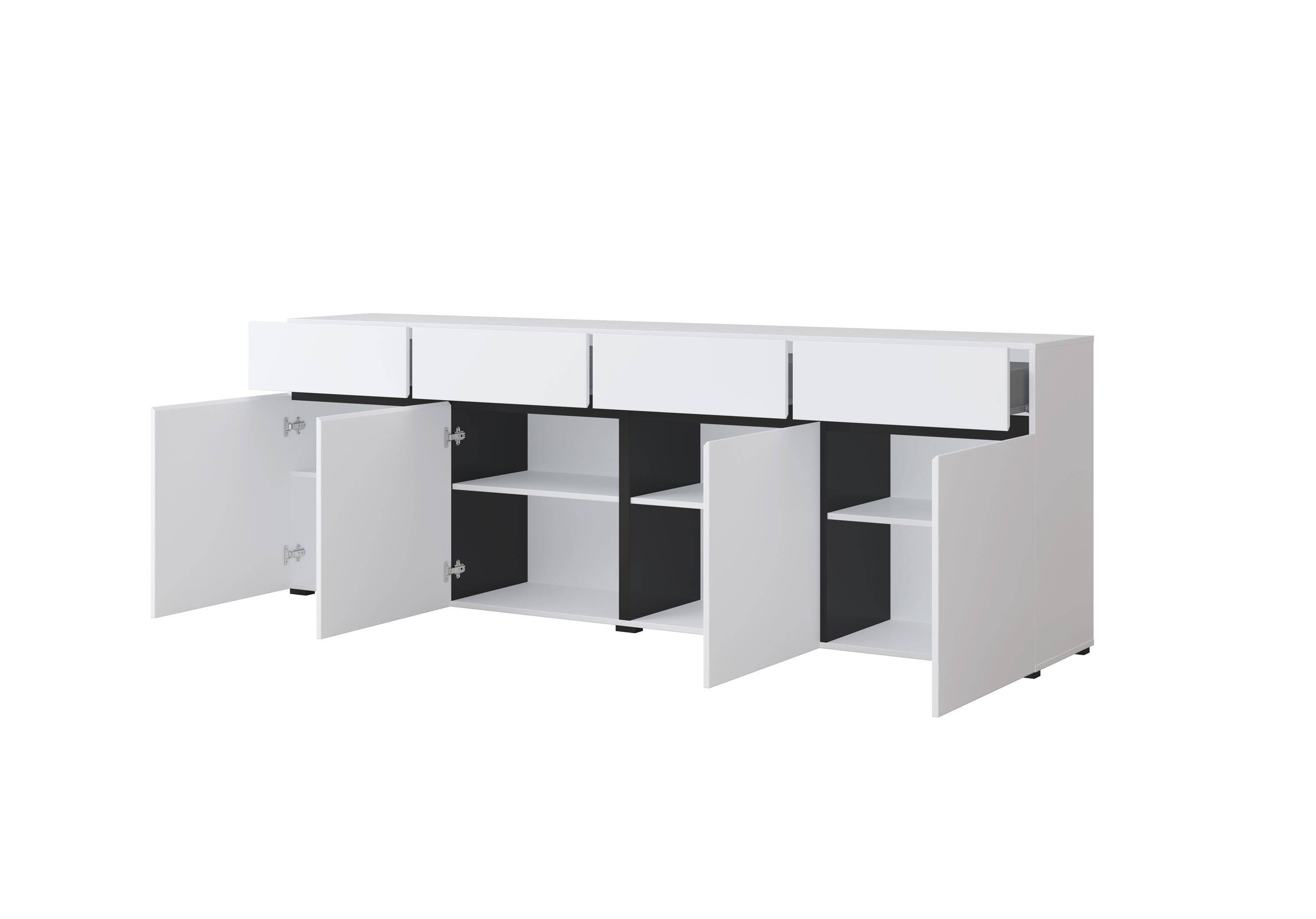 Stylowy wygląd to nie wszystko – komoda Cross oferuje także praktyczne rozwiązania, które zadowolą nawet najbardziej wymagających użytkowników. Dzięki czterem drzwiom i czterem szufladom, masz do dyspozycji mnóstwo miejsca na przechowywanie wszelkiego rodzaju przedmiotów, od odzieży po dokumenty. Organizacja przestrzeni nigdy nie była łatwiejsza!