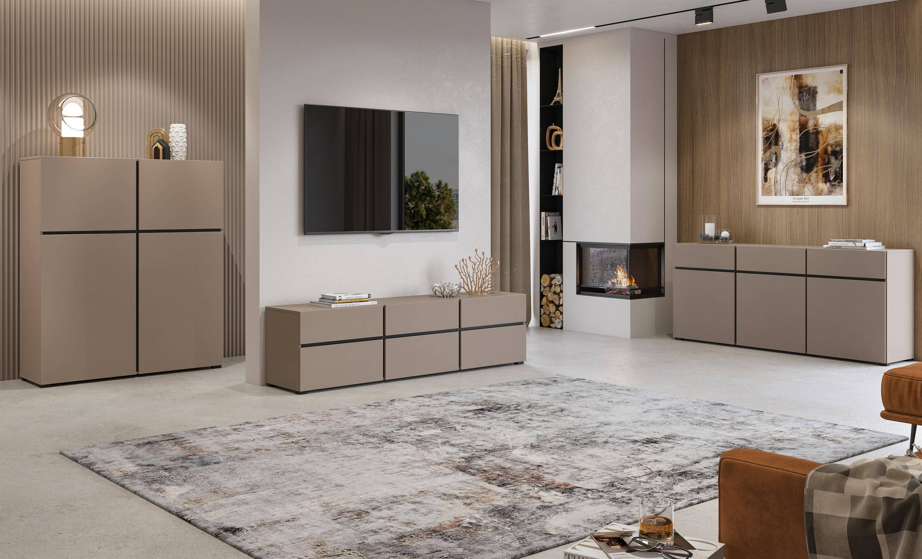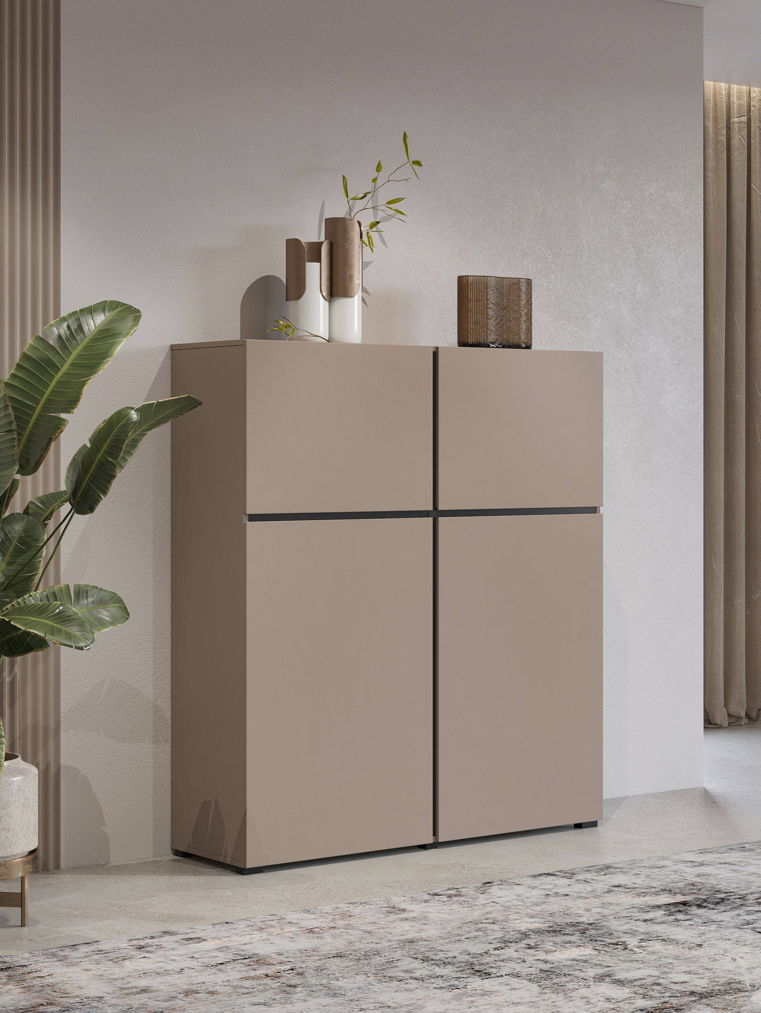 Elegancka komoda Cross od Helvetia w czarnym macie z unikalnym wykończeniem Congo. Posiada 4 drzwi, idealna do przechowywania, łącząca nowoczesny styl z praktycznością. Wykonana z trwałej płyty laminowanej, doskonała do różnych wnętrz.