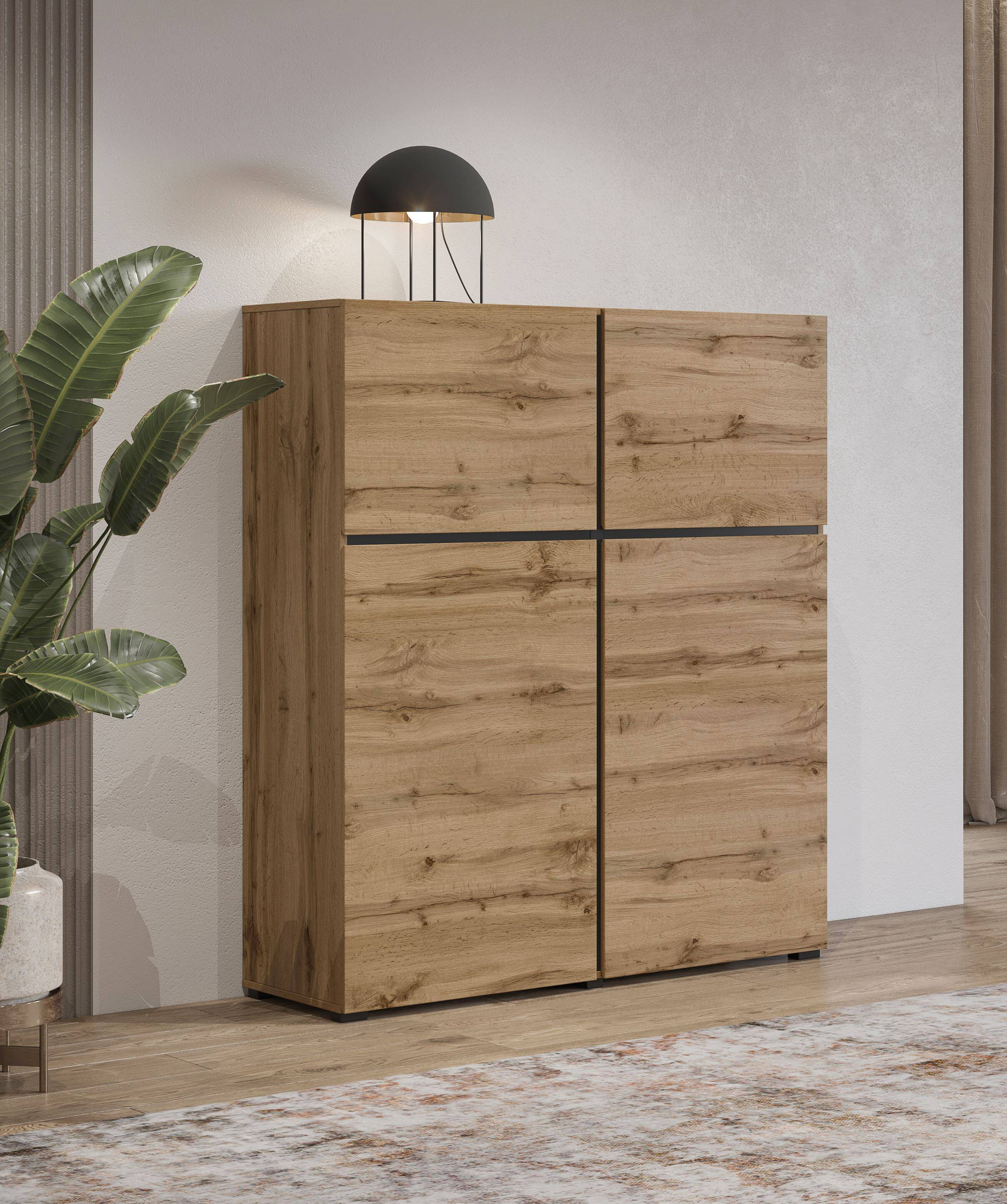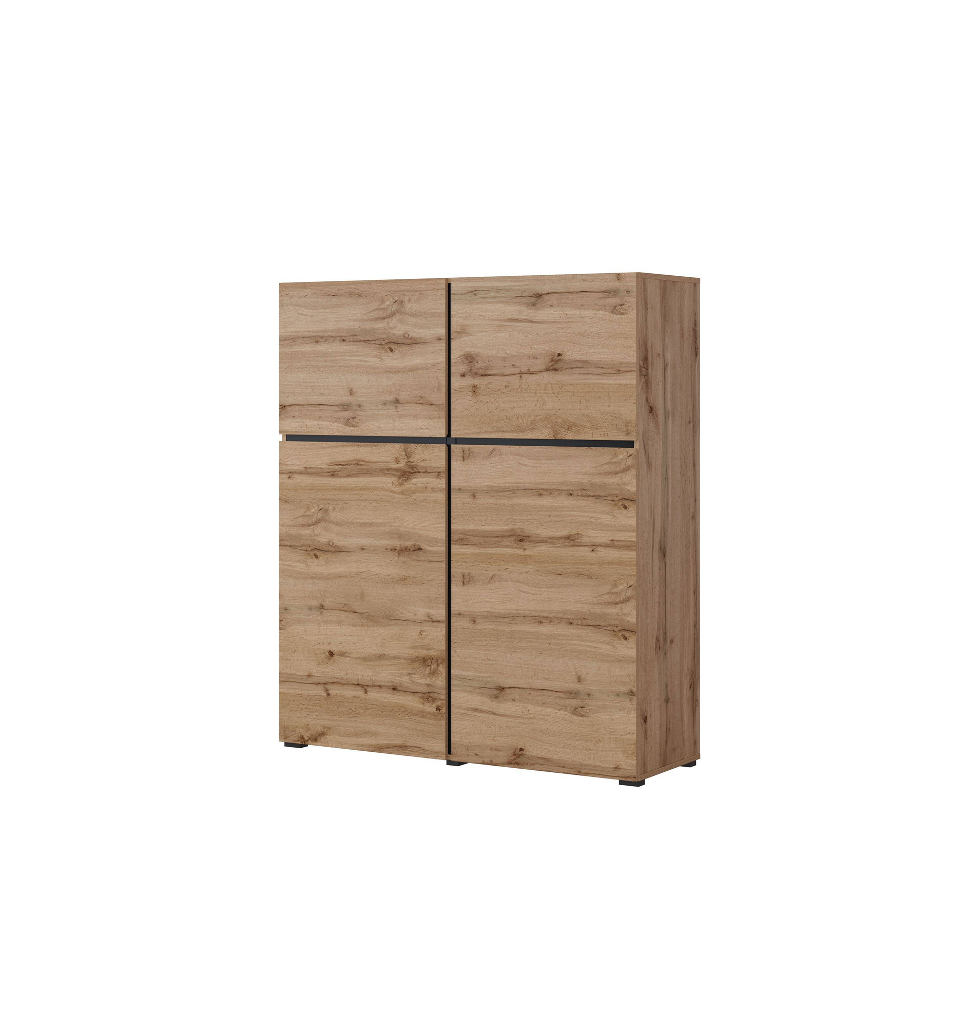 Funkcjonalność tej komody przekształca aranżację każdego pokoju, łącząc elegancję z praktycznością, dzięki czemu możesz cieszyć się harmonią i porządkiem w swoim otoczeniu. Wysoka forma i cztery drzwi oferują mnóstwo miejsca, które pozwala na przechowywanie wszelkich niezbędnych przedmiotów. Niezależnie czy potrzebujesz schować książki, dokumenty, czy inne domowe skarby, ta komoda stanie na wysokości zadania.
