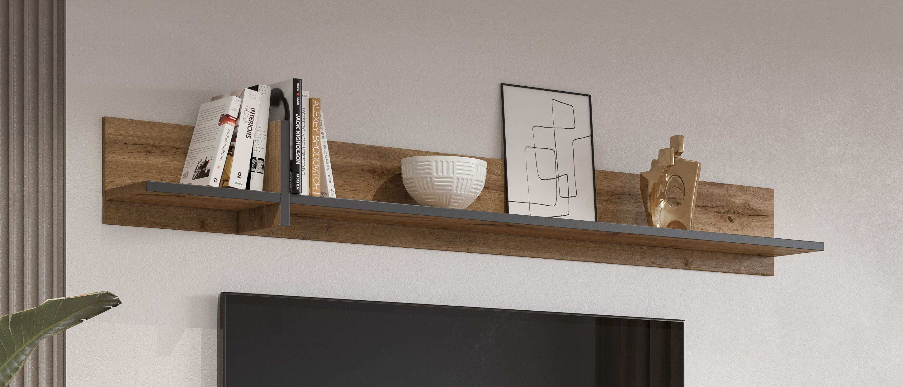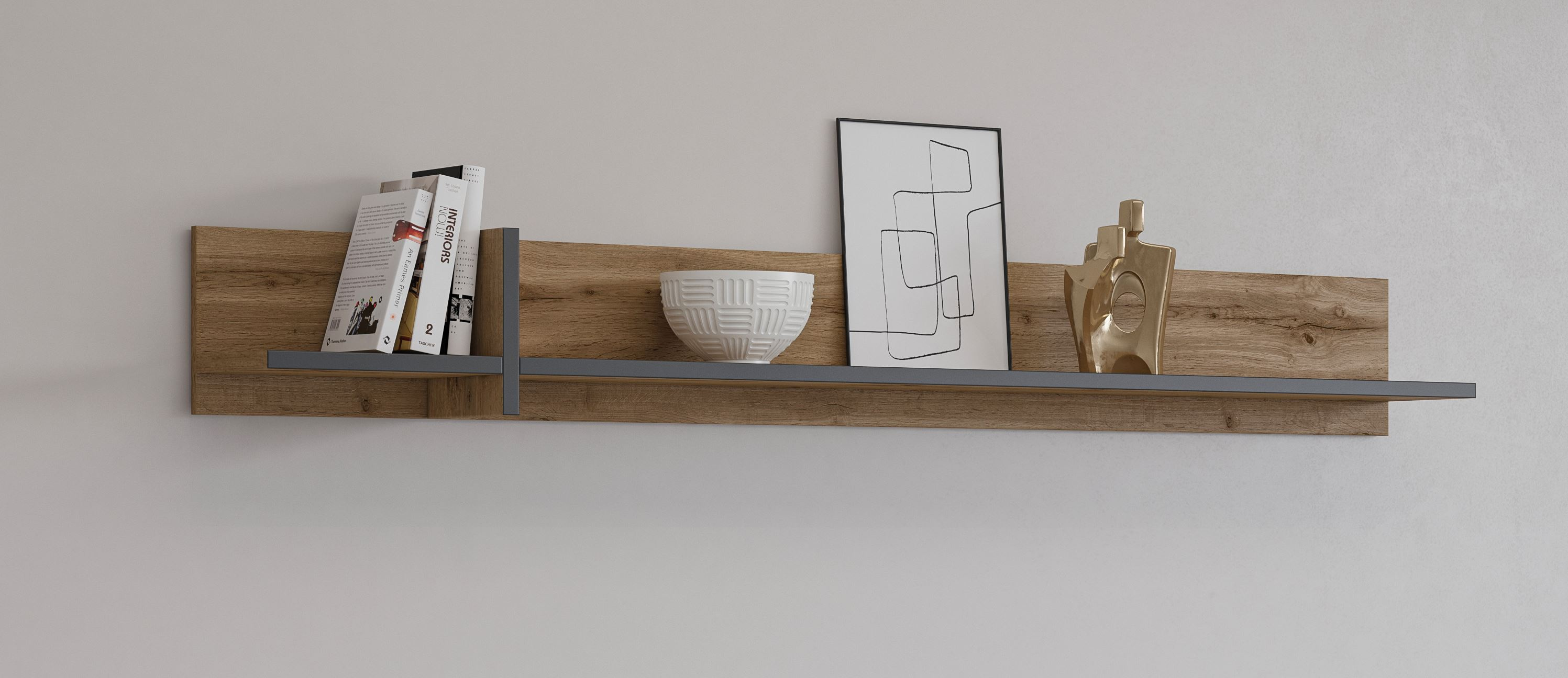 Odkryj półkę wiszącą Cross w kolorze Dąb Wotan z czarnym matowym akcentem, która doda Twojemu wnętrzu nowoczesnego charakteru. Jej minimalistyczny design sprawia, że idealnie wpisuje się w różnorodne stylizacje, od industrialnych po skandynawskie. Dzięki połączeniu naturalnych odcieni drewna z eleganckim czarnym matowym wykończeniem, półka staje się nie tylko funkcjonalnym elementem wyposażenia, ale także efektowną dekoracją ściany.