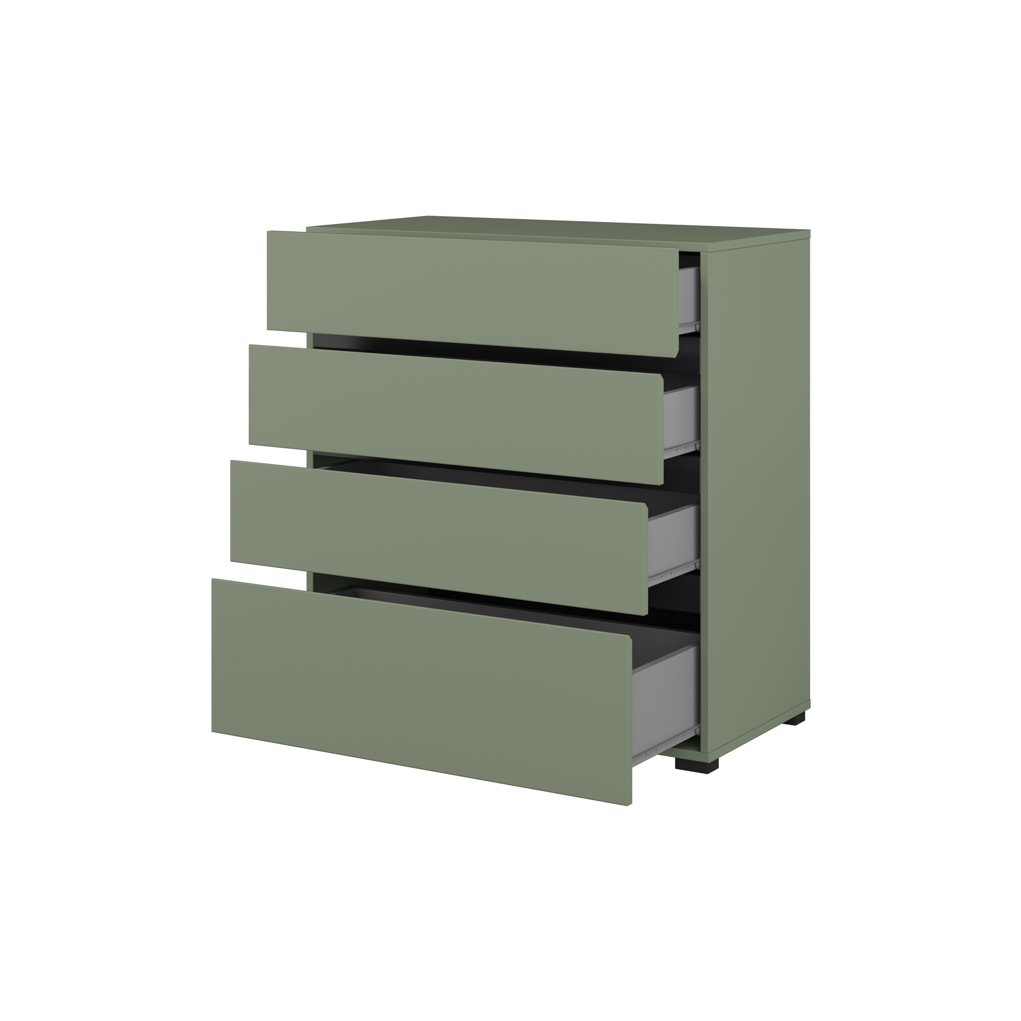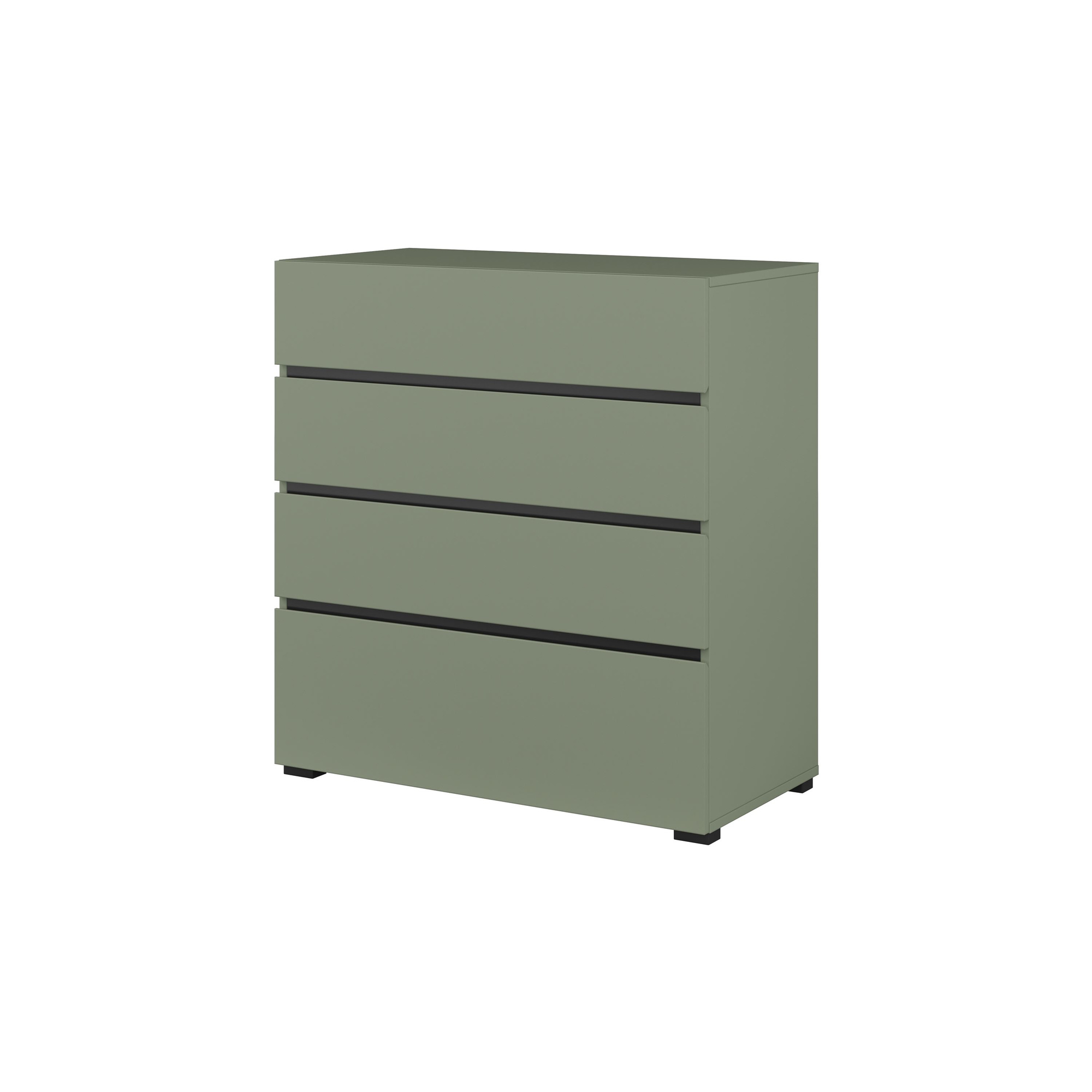 - Komoda Cross S to elegancki mebel w zgaszonej zieleni, doskonały do każdego wnętrza. Oferuje cztery pojemne szuflady na prowadnicach rolkowych, co zapewnia wygodny dostęp do przechowywanych rzeczy. Stabilne nogi w kolorze czarnym dodają nowoczesnego stylu