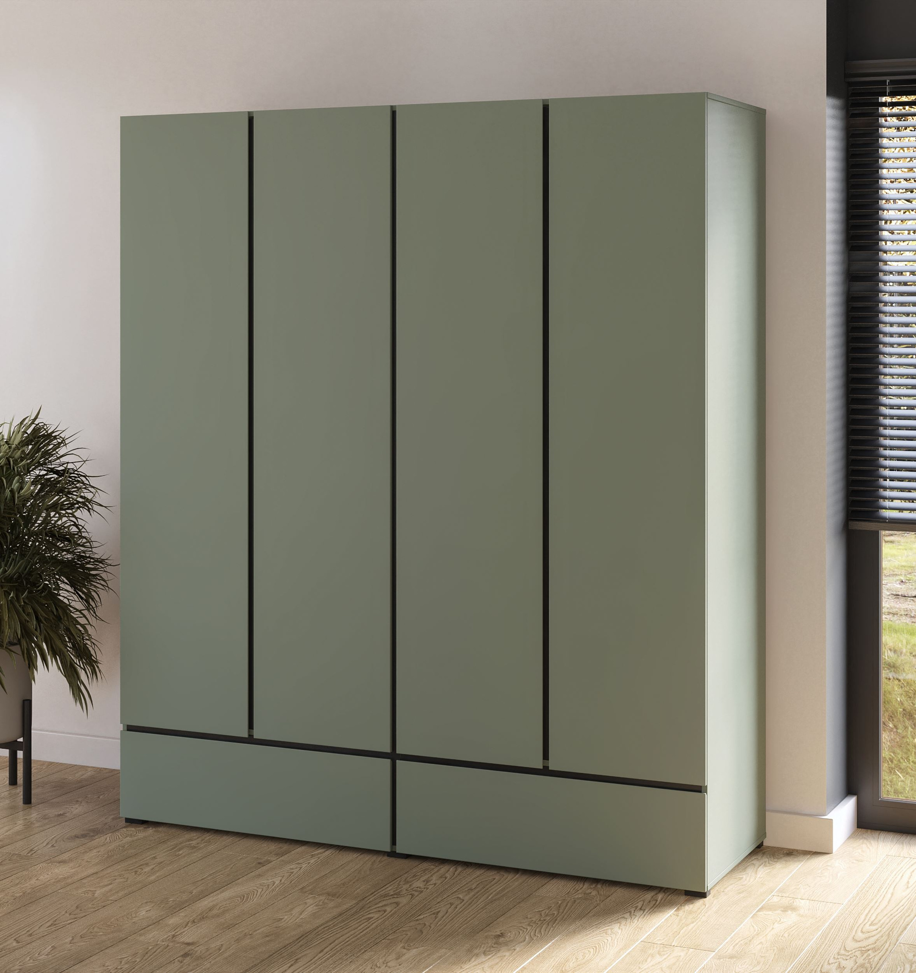 Szafa Cross S w eleganckim odcieniu zgaszonej zieleni z czarnymi akcentami to idealne połączenie stylu i funkcjonalności. Cztery drzwi oraz dwie szuflady zapewnią mnóstwo miejsca na przechowywanie. Solidna konstrukcja z płyty laminowanej, łatwy montaż.