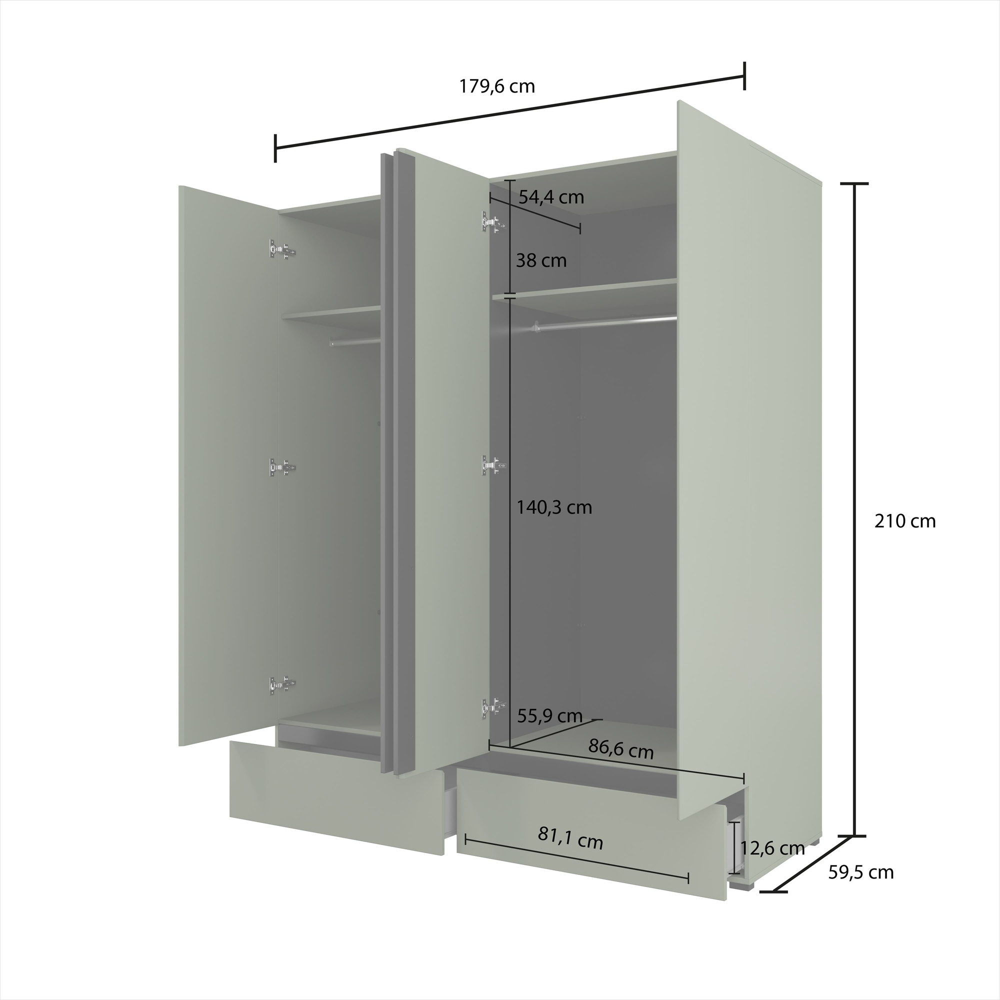 Przyjemność użytkowania szafy Cross S z pewnością zaspokoi nawet najbardziej wymagających. Jej imponujące wymiary – wysokość 210 cm i szerokość 180 cm – sprawiają, że pomieści wszystkie Twoje ubrania, dodatki oraz inne niezbędne przedmioty, jednocześnie nadając przestrzeni lekkości. Otwierane fronty w kolorze zgaszonej zieleni, zestawione z czarnymi detalami, tworzą spójną i elegancką całość, która przyciąga wzrok.