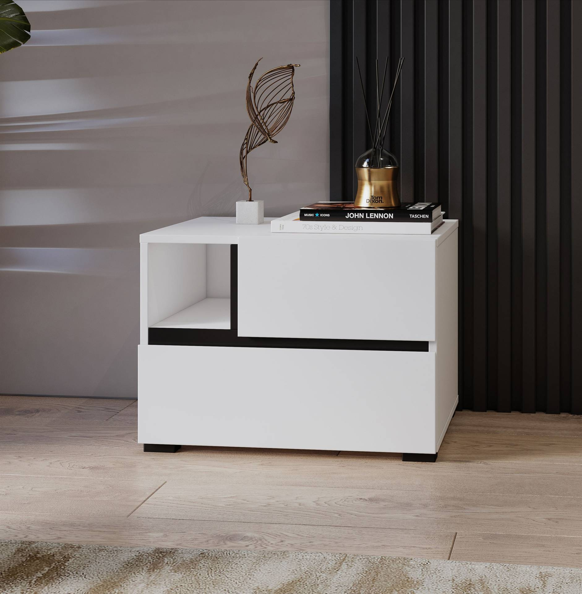 Szafka nocna Cross S łączy elegancję białego matu z nowoczesnym czarnym onyksem. Dwie praktyczne szuflady oferują wygodne przechowywanie, a solidne nogi dodają stabilności. Idealna do sypialni, łącząca funkcjonalność z minimalistycznym stylem.