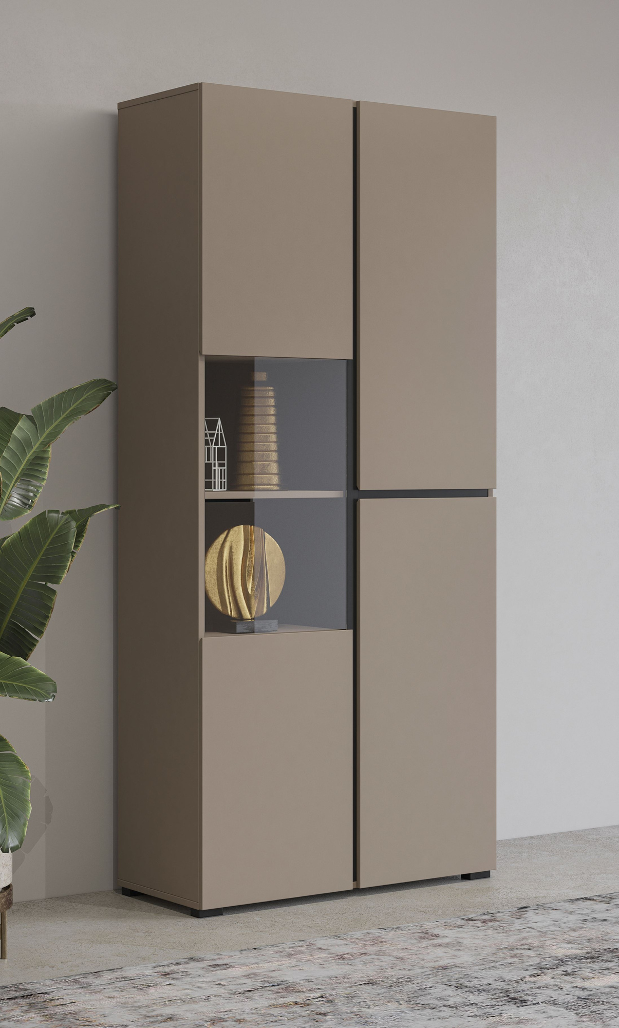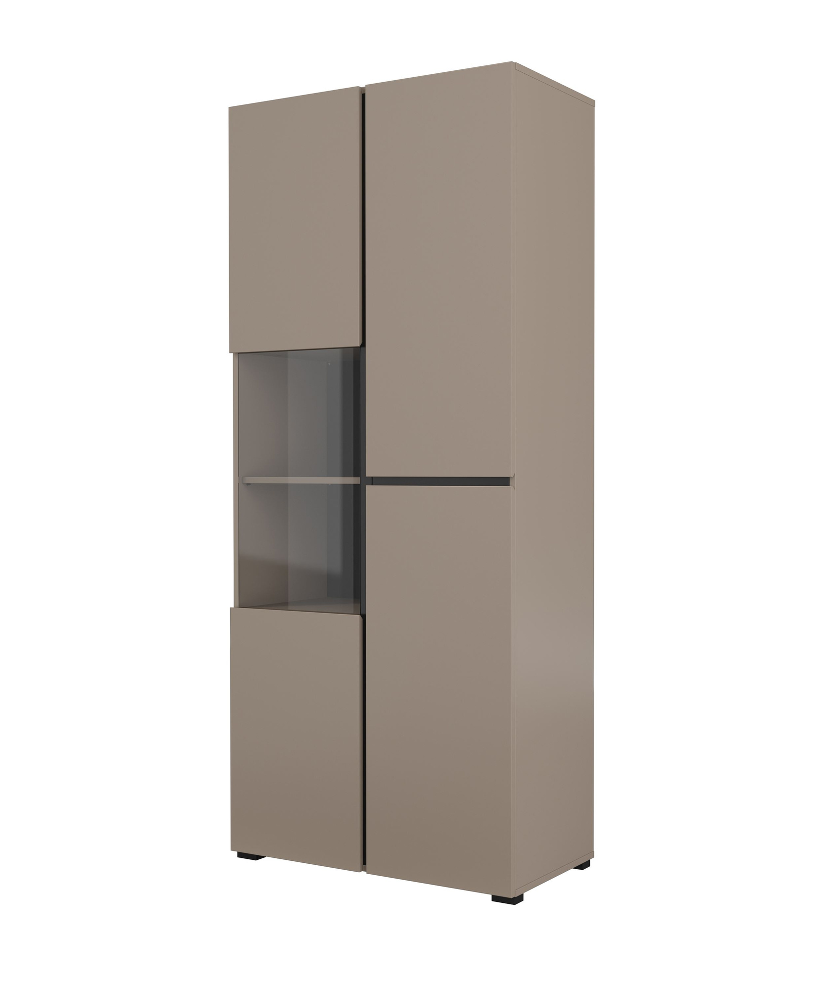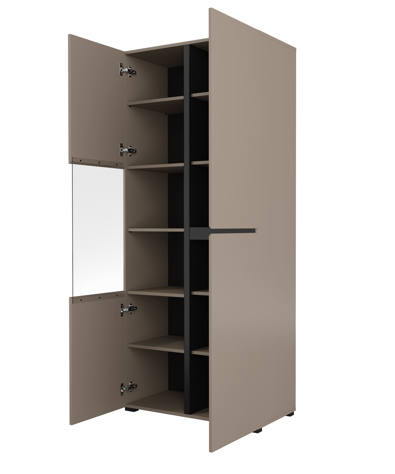 Witryna 3-drzwiowa Cross w kolorze matowego czarnego Congo łączy elegancję z funkcjonalnością. Wykonana z laminowanej płyty, idealnie wpasuje się w nowoczesne wnętrza. Metalowe zawiasy zapewniają trwałość. Stwórz unikalną przestrzeń z tym stylowym meblem!