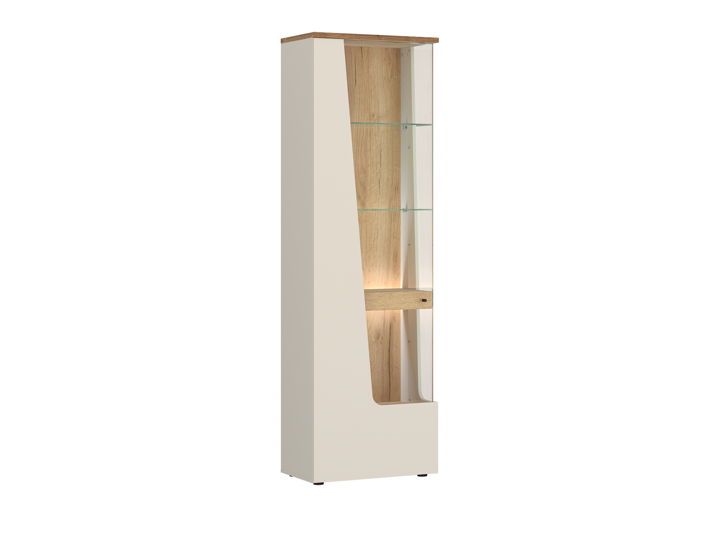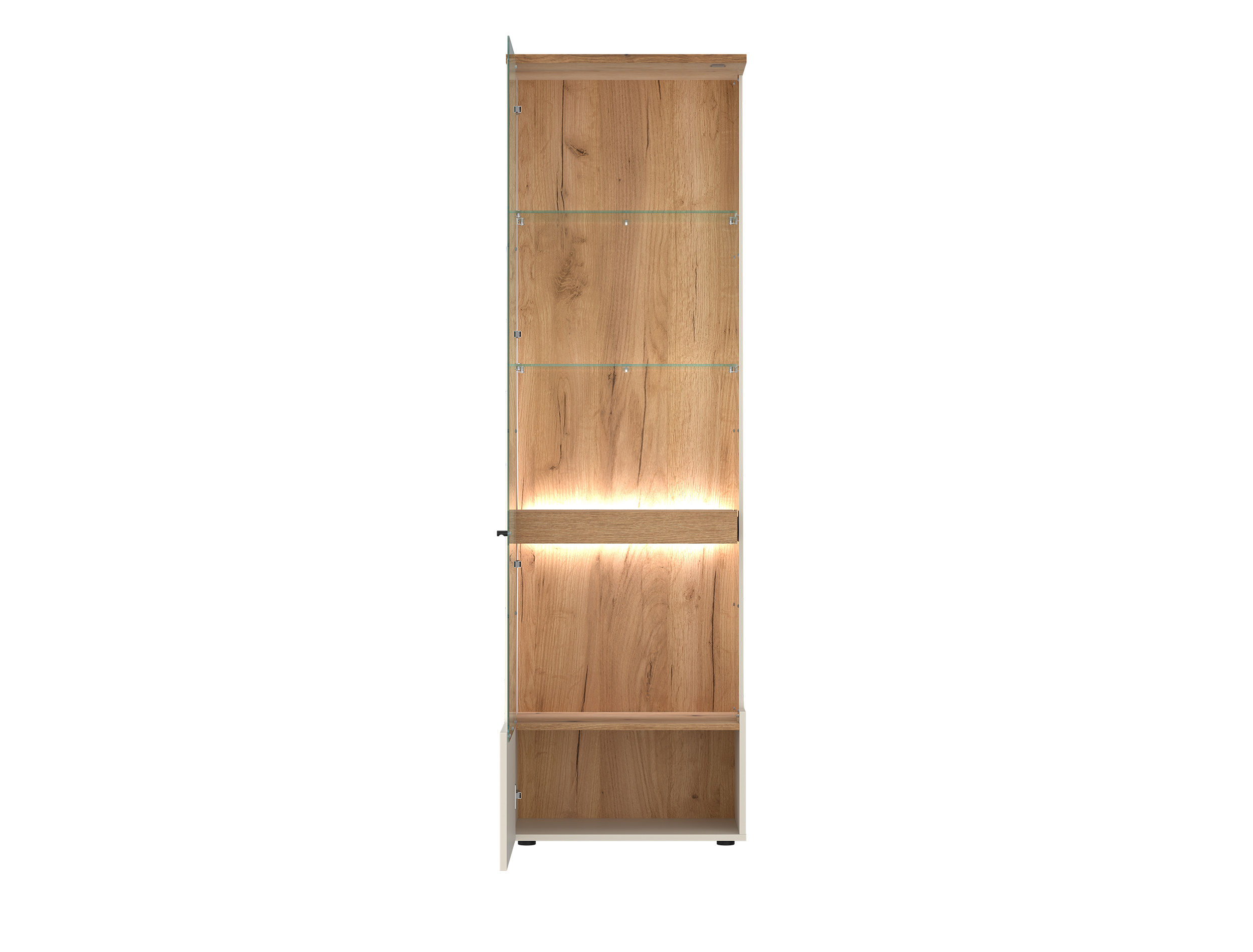 Witryna CUT OUT CTUV01L łączy nowoczesny design z praktycznością. Z dębowym wykończeniem w kolorze kaszmiru oraz eleganckim hartowanym szkłem, stanie się ozdobą każdego salonu czy jadalni. Oświetlenie LED podkreśla eksponowane przedmioty.