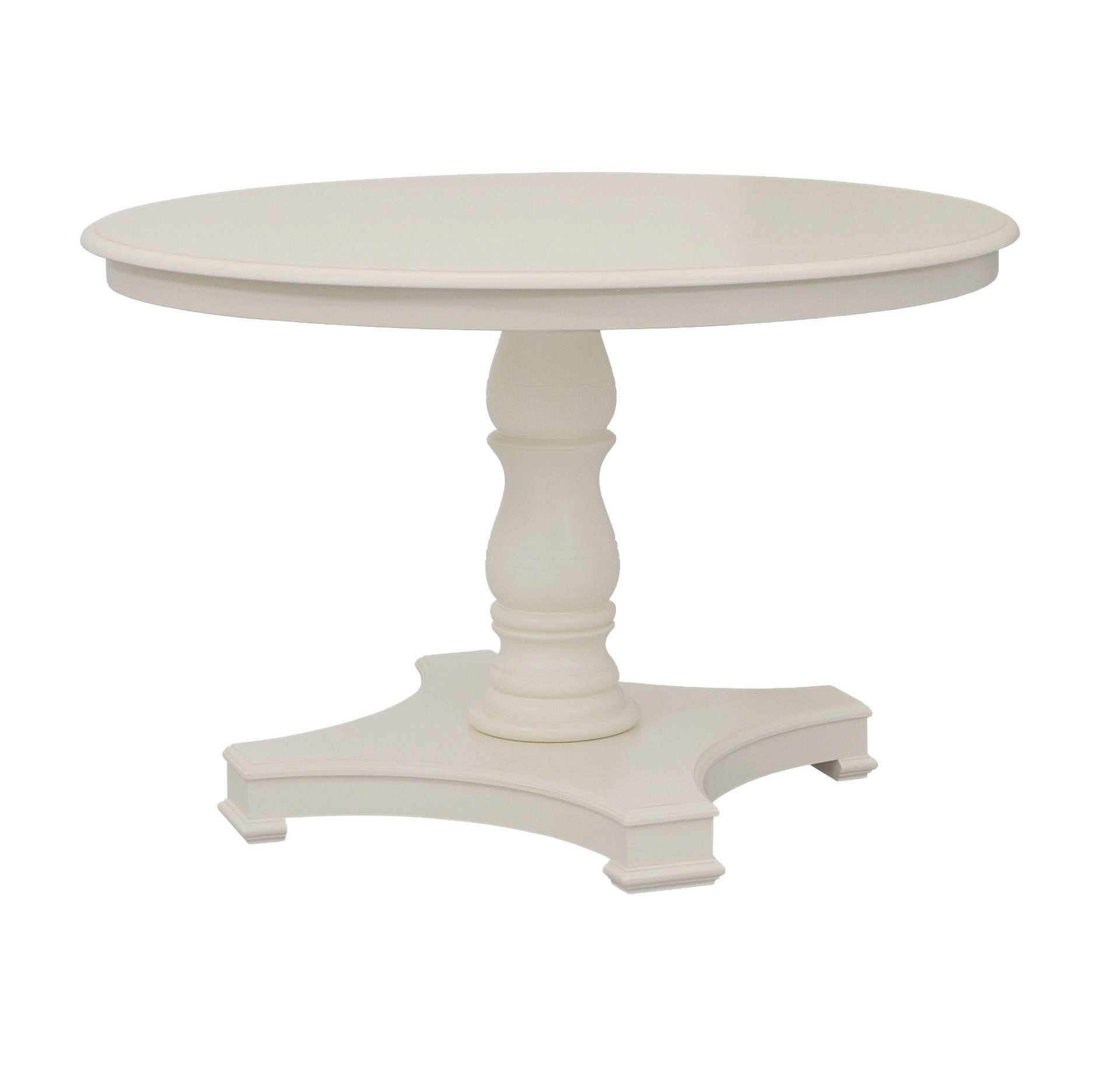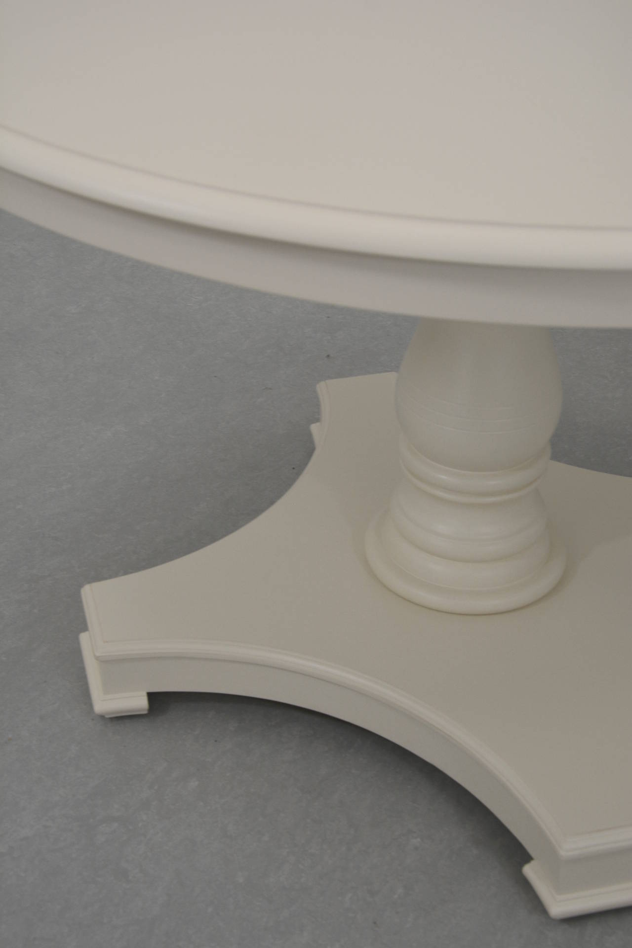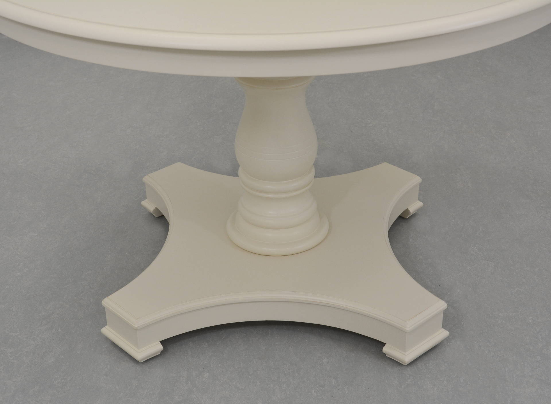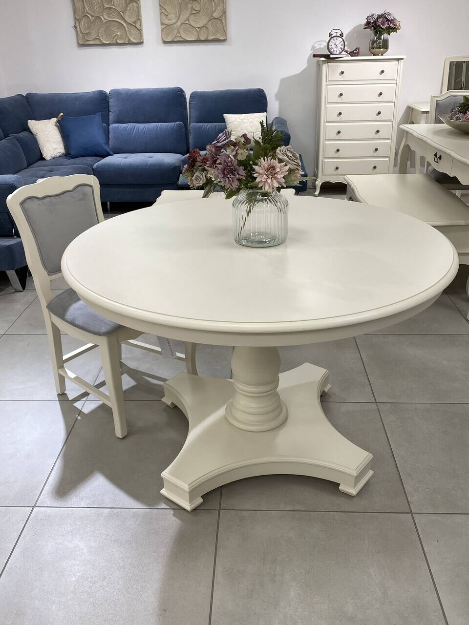 - Stół jadalniany w stylu prowansalskim z okrągłym blatem na jednej solidnej nodze wykonany z drewna w kolorze jasnokremowym.