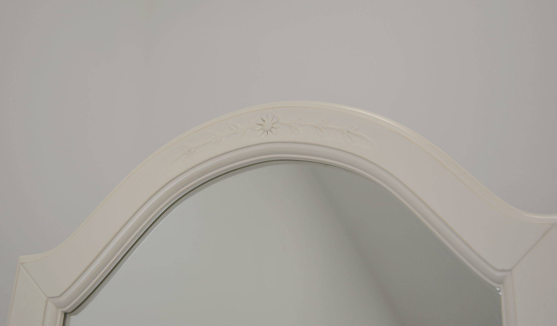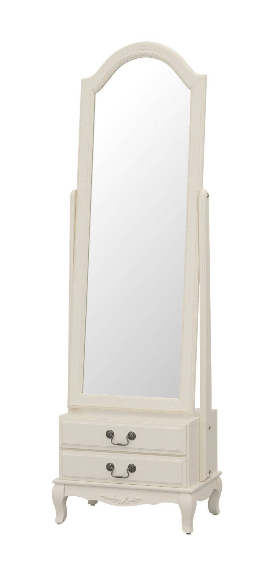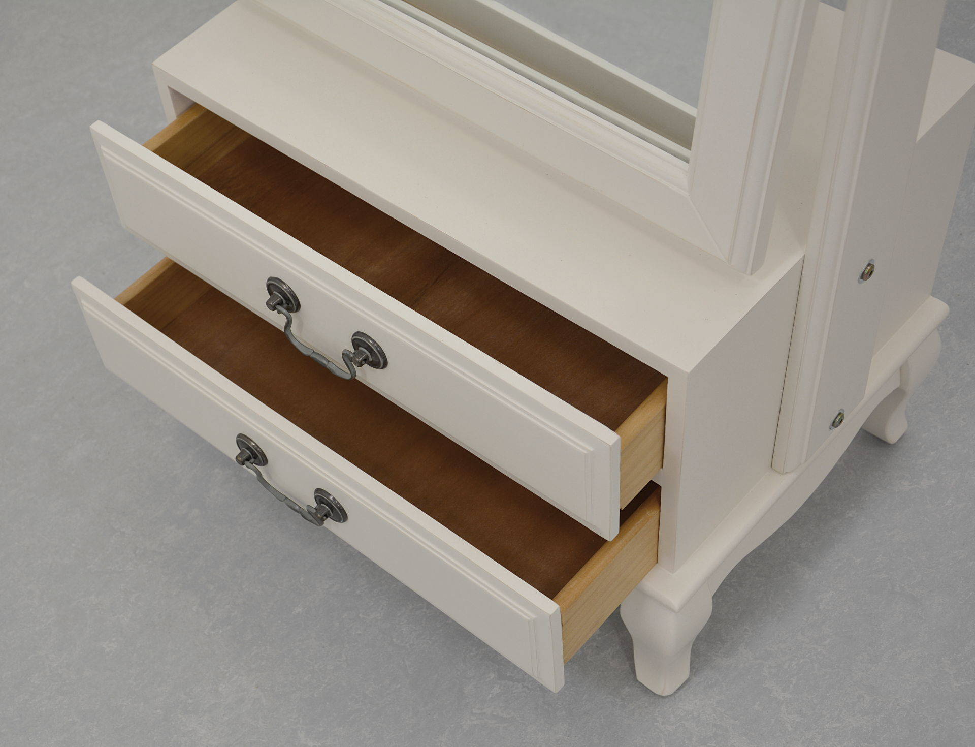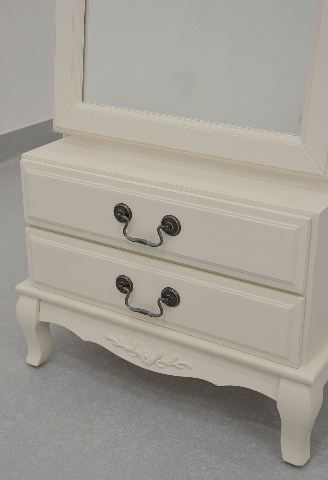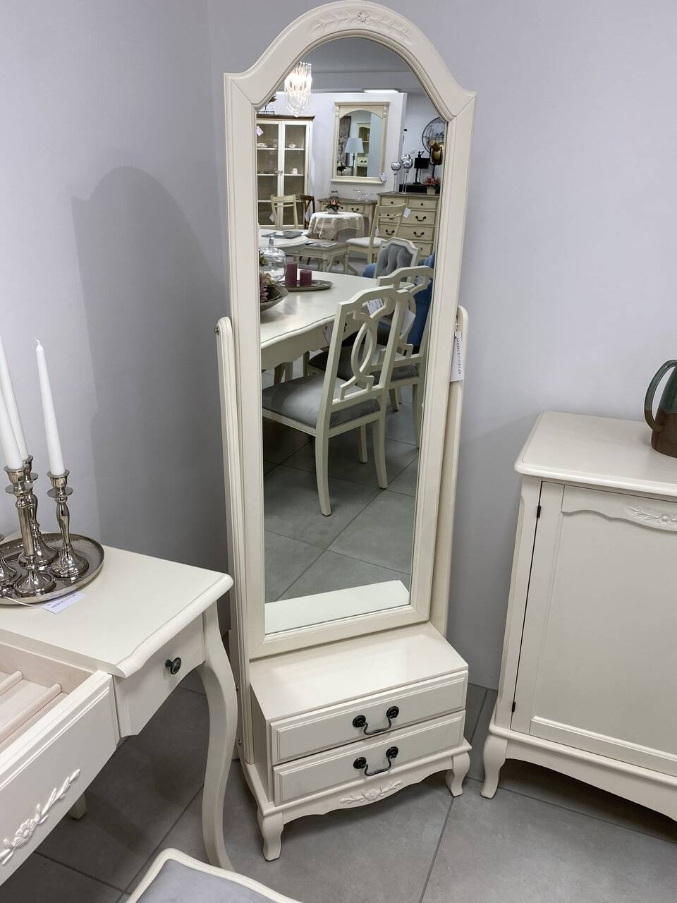 • Lustro stojące w stylu prowansalskim z dwiema szufladami na giętych nóżkach z możliwością regulacji kąta nachylenia lustra. Materiał wykonania to drewno w kolorze jasnokremowym.