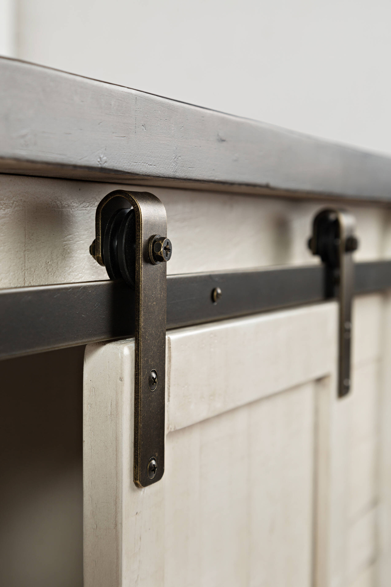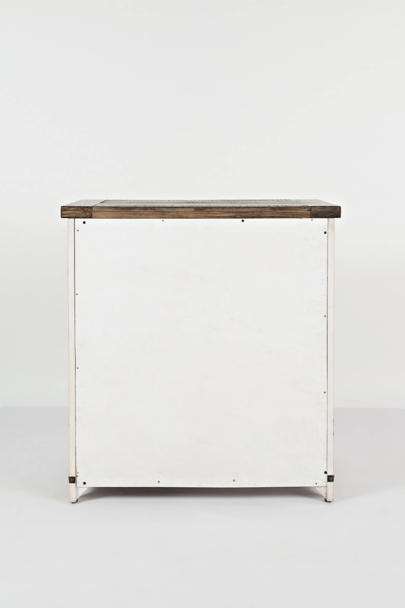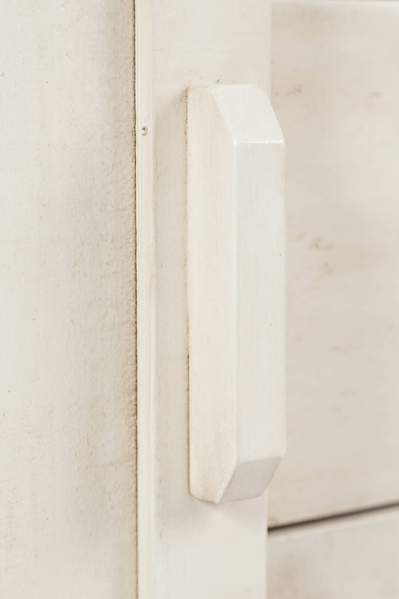 • Komoda z jednymi drzwiczkami, trzema szufladami i jedną półką wykonana z drewna sosnowego z recyklingu. Komoda w stylu rustykalnym w kolorze antycznej bieli z ciemnobrązowym blatem.
