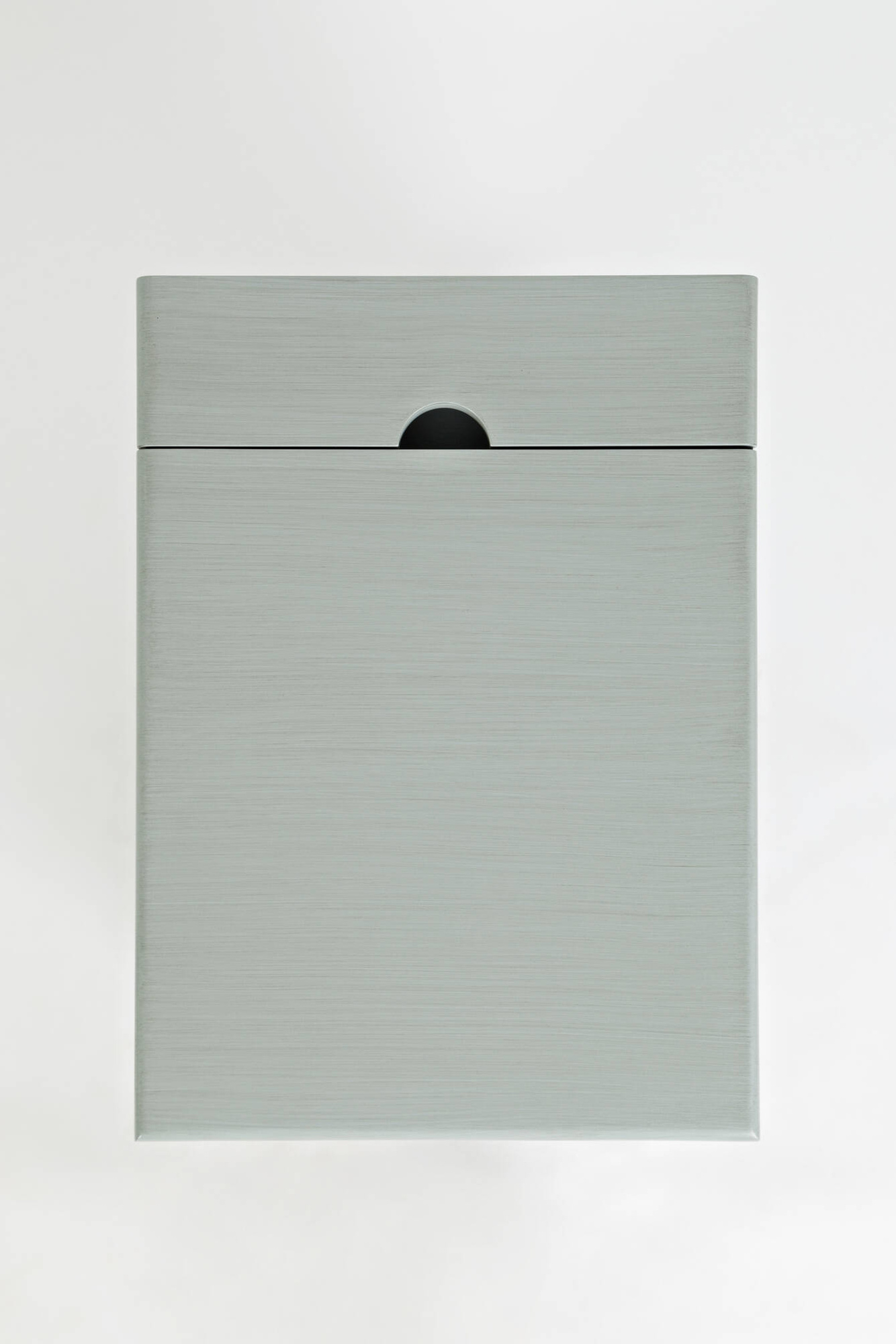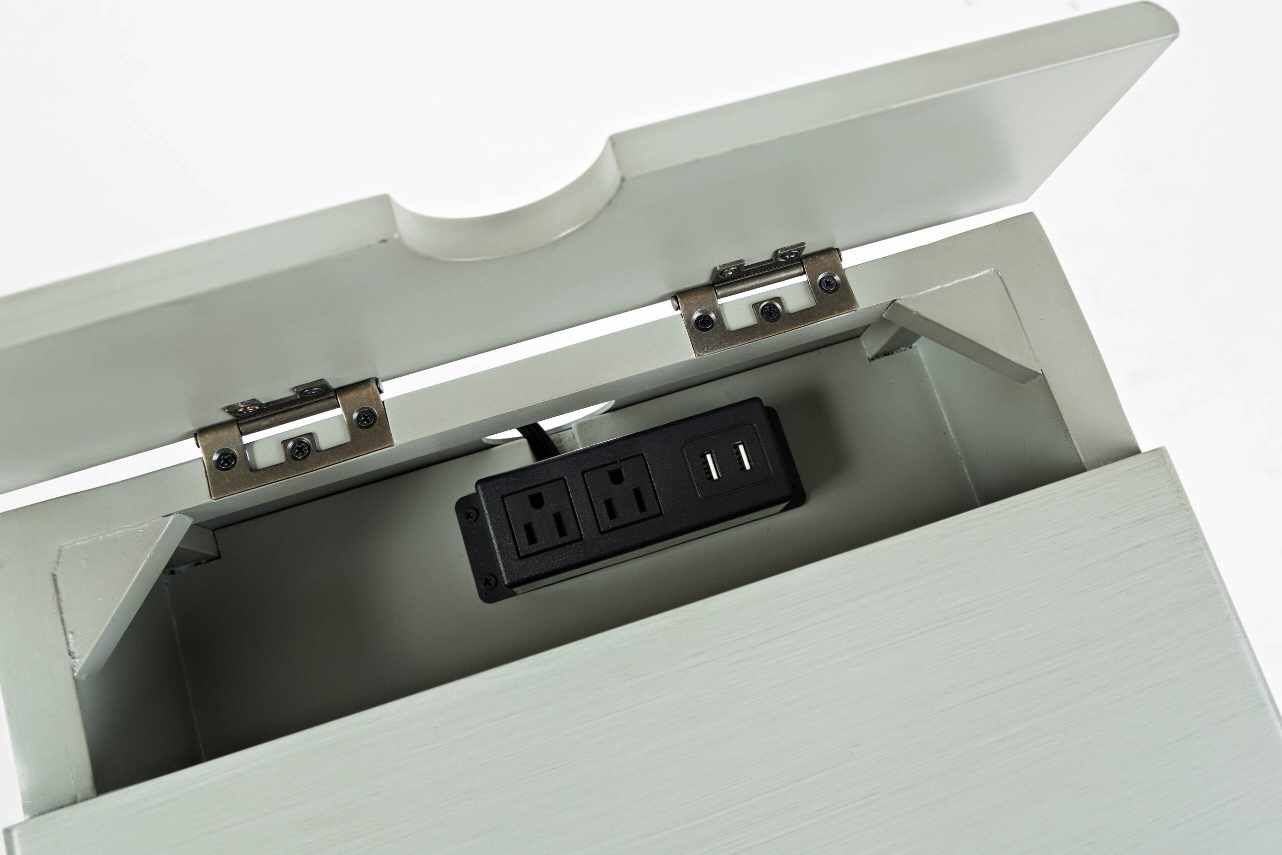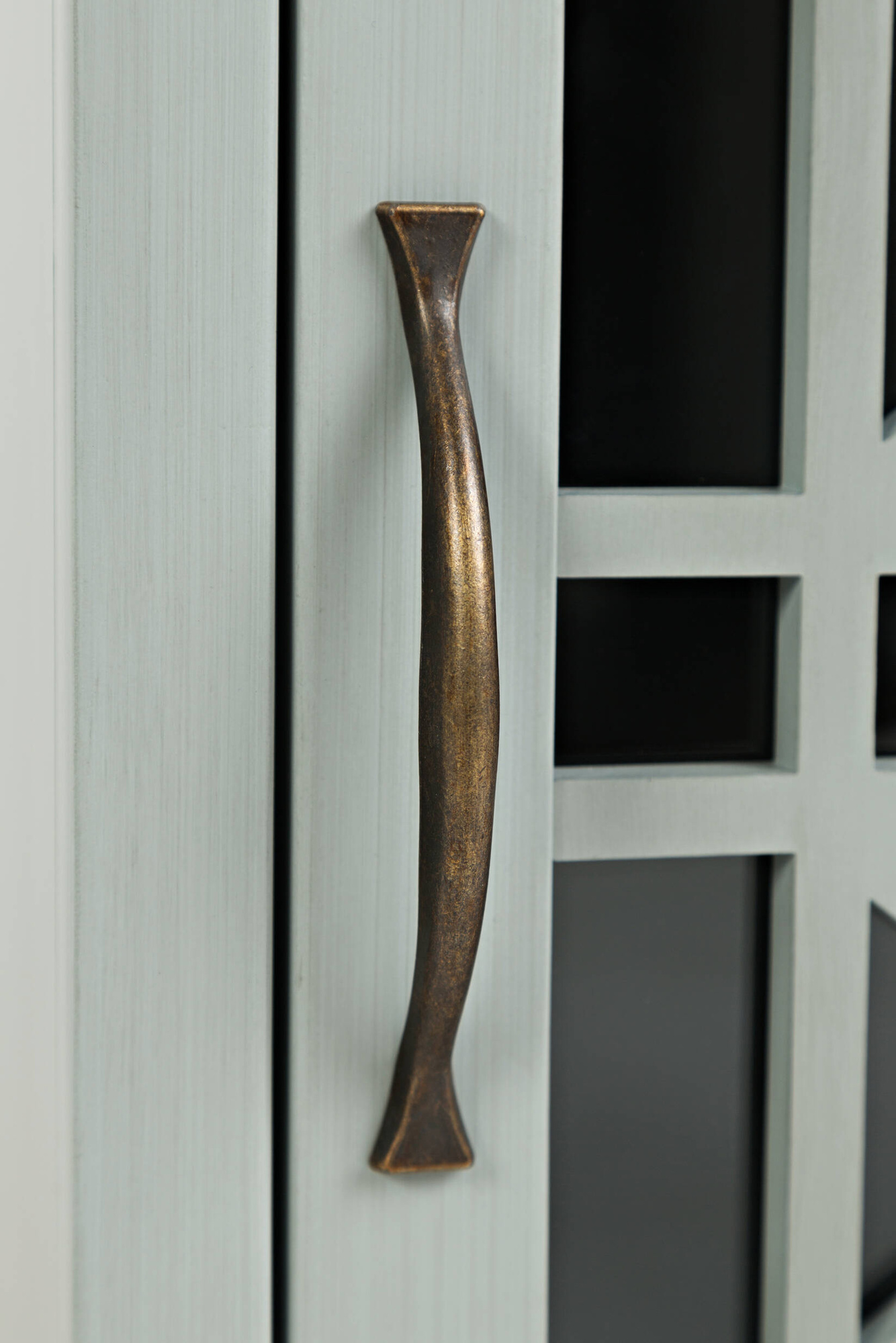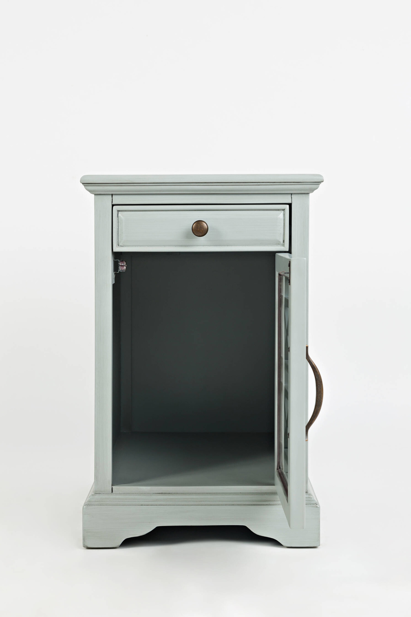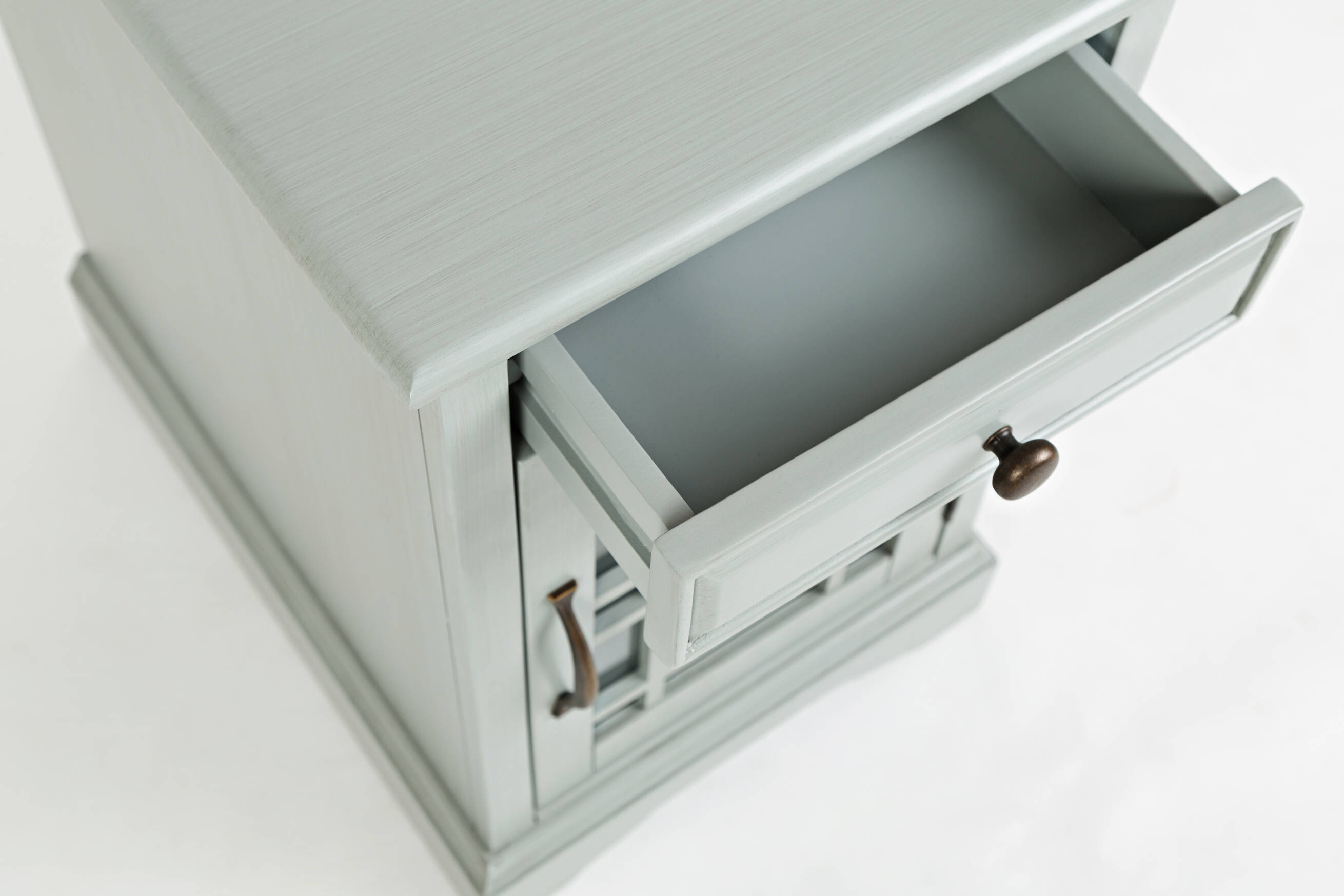 - Szafka nocna z jednymi przeszklonymi ażurowymi drzwiczkami i jedną półką. Wykonana z drewna akacji i MDF-u w kolorze szaro-miętowym z metalowymi uchwytami.