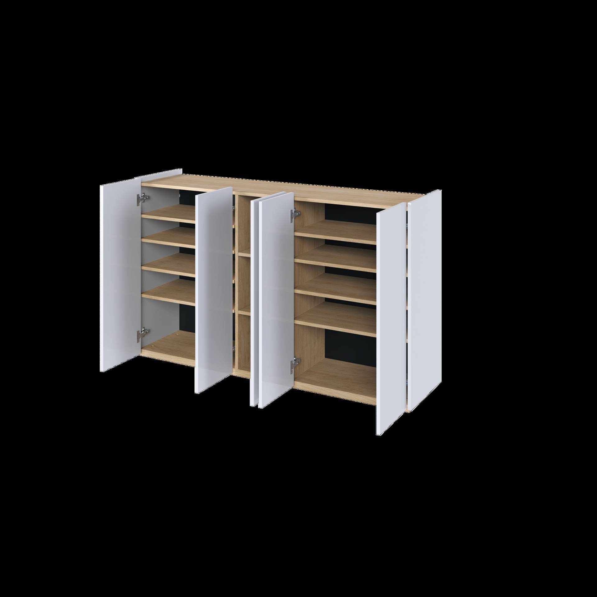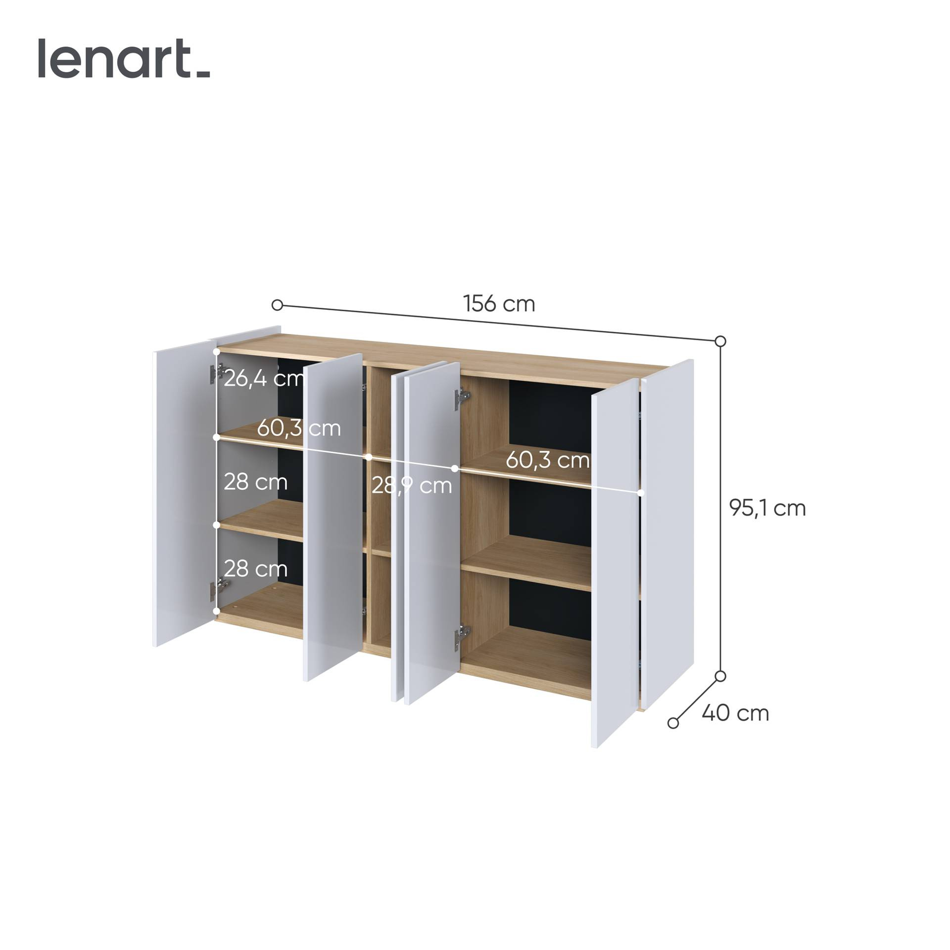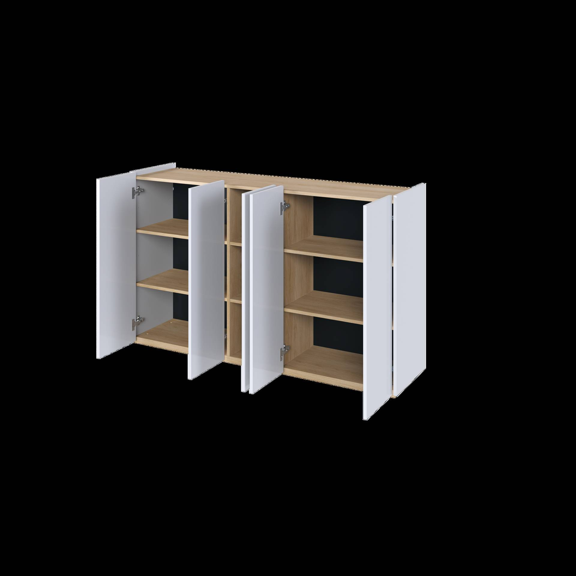 Elegancka komoda Easy EA-01 w kolorze biały połysk z elementami dębu Scandi, wyposażona w nowoczesne oświetlenie LED. Pięciodrzwiowa konstrukcja z funkcją Soft Close oferuje dużo miejsca do przechowywania, wnosząc styl i funkcjonalność do Twojego wnętrza.