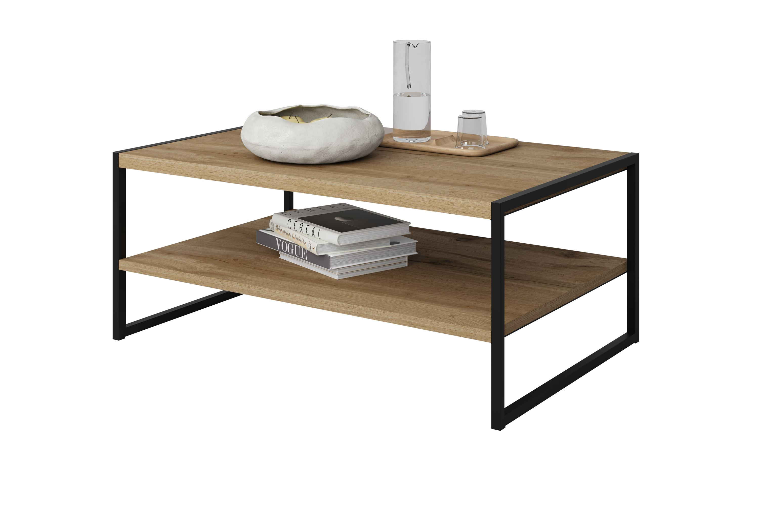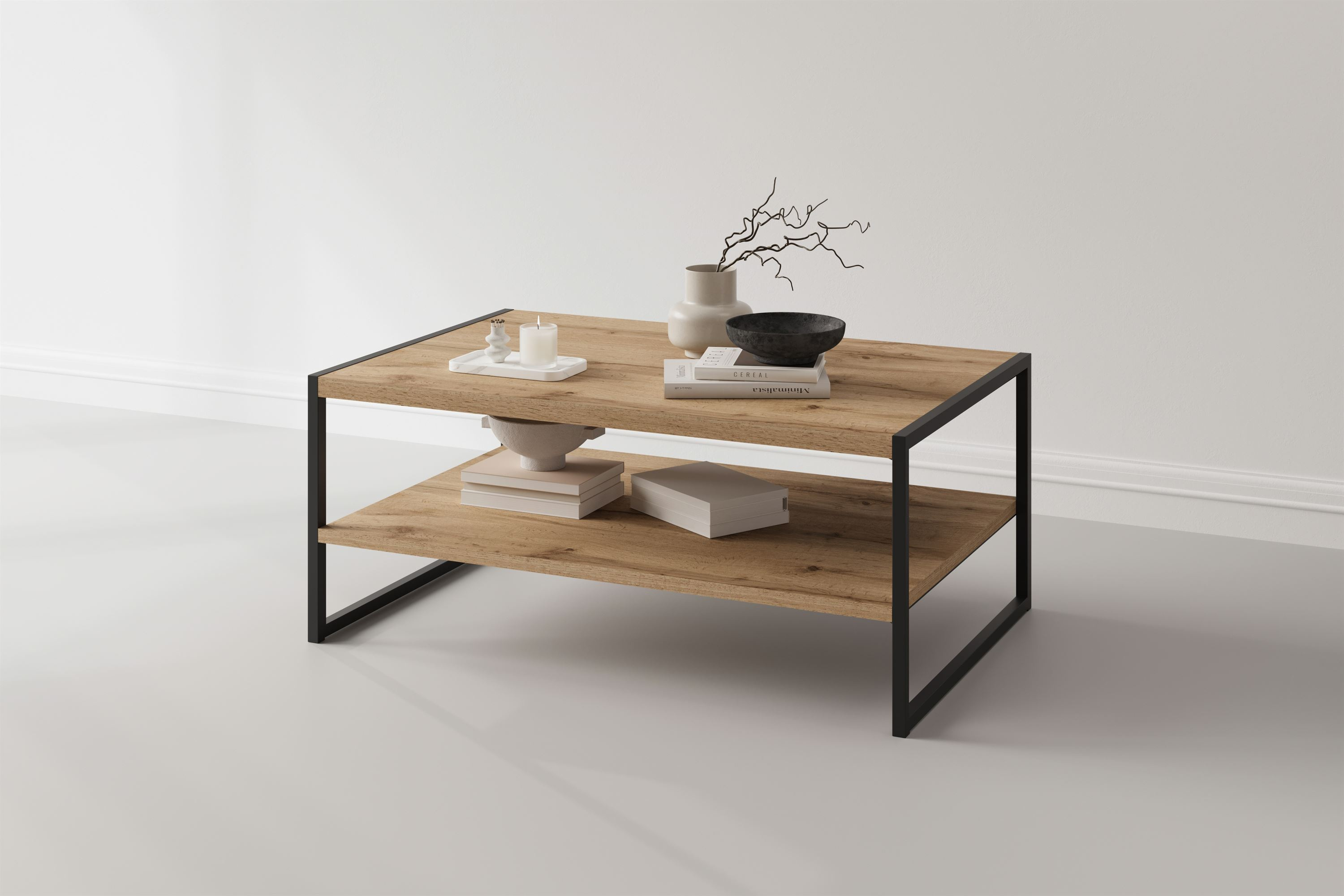 - Stolik kawowy prostokątny Eko w stylu skandynawskim łączy elegancki dąb Wotan z matowym czarnym metalem, tworząc nowoczesny akcent w Twoim salonie. Jego funkcjonalne półki zapewniają przestrzeń na książki i dekoracje. Idealny do samodzielnego montażu!