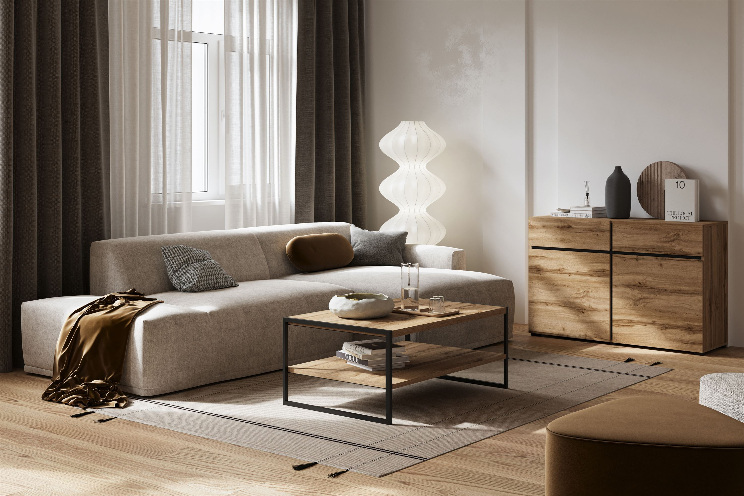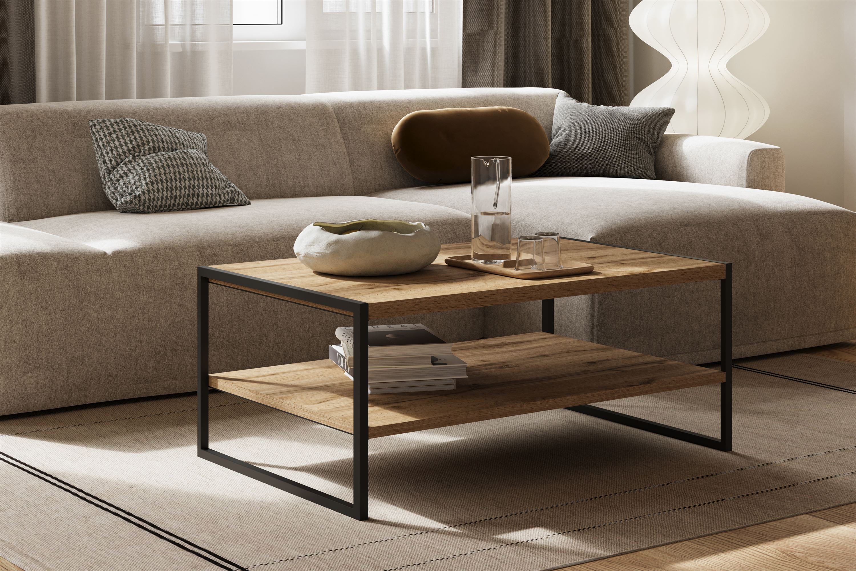 Kolor półek w odcieniu Dąb Wotan dodaje wnętrzu ciepła i przytulności, podczas gdy czarne nogi w matowym wykończeniu podkreślają nowoczesny charakter stolika. Połączenie tych dwóch kolorów sprawia, że stolik łatwo dopasować do różnych aranżacji - od skandynawskiej elegancji po loftowy urok. To idealny wybór dla osób, które pragną stworzyć stylową przestrzeń w swoim domu.