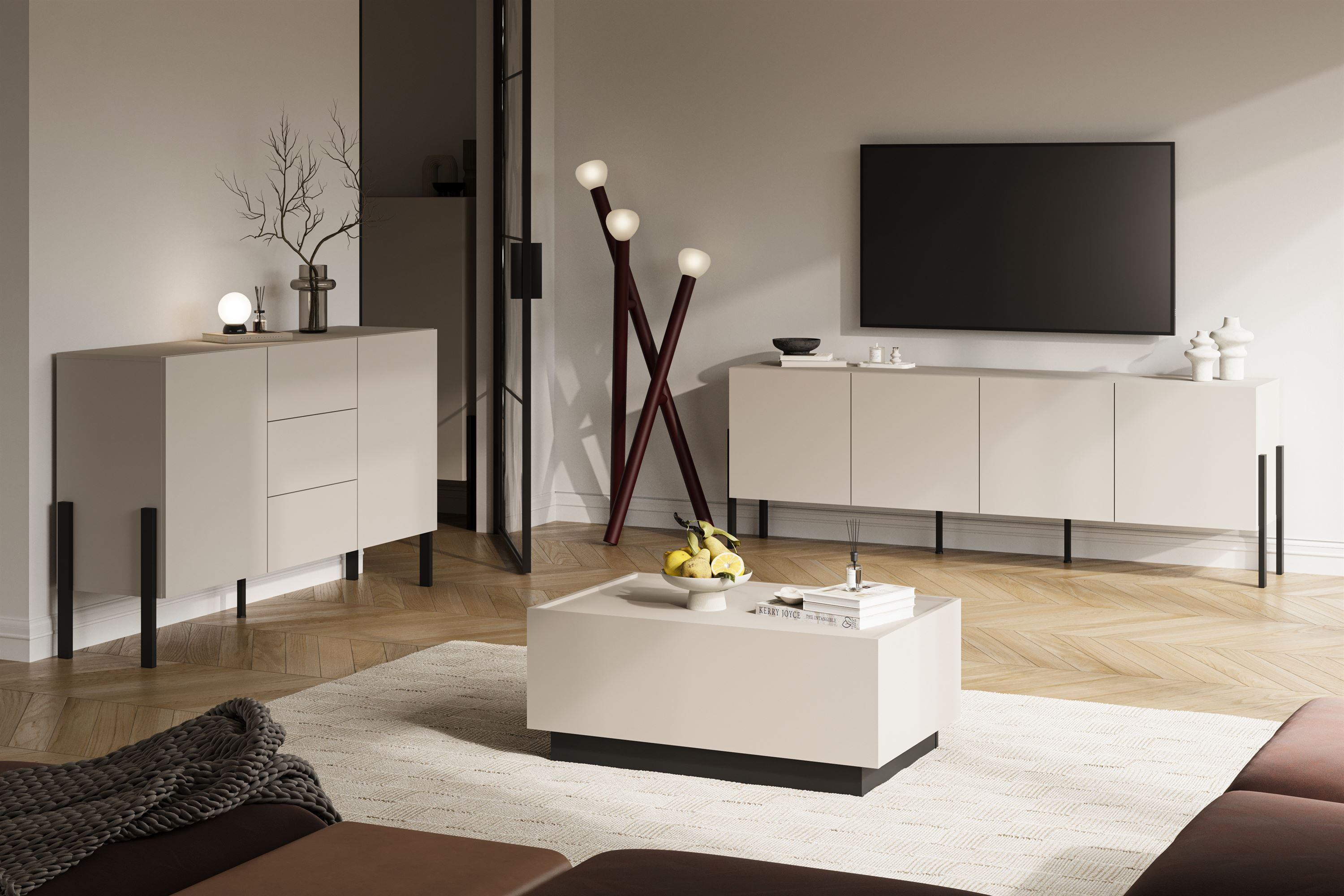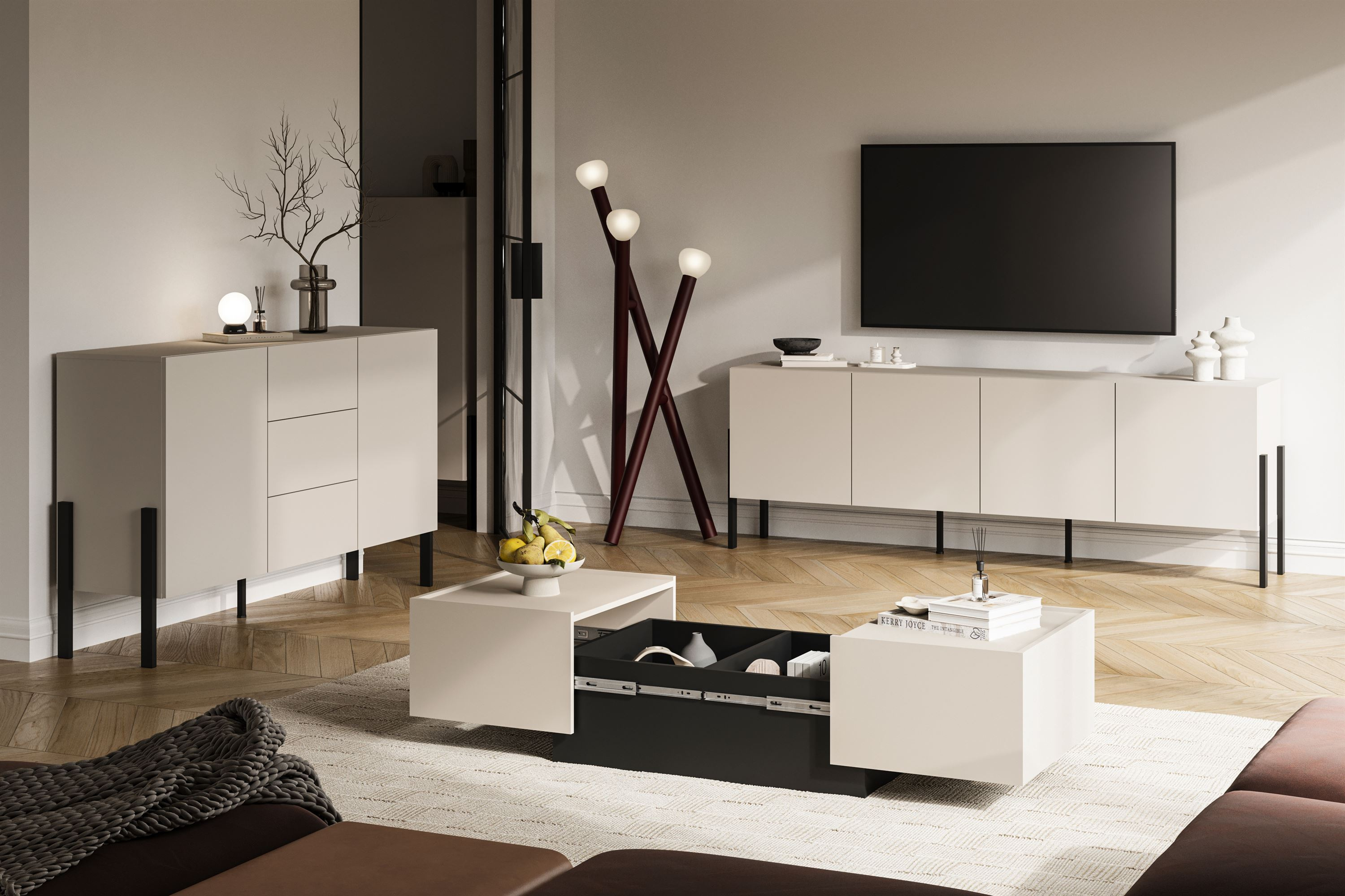 Stolik kawowy Eko to połączenie elegancji i funkcjonalności. Wykonany z laminowanej płyty w kolorze kaszmiru i matowego czarnego metalu, rozsuwa się dla większej przestrzeni. Idealny do nowoczesnych wnętrz, doskonały na wieczory z przyjaciółmi!