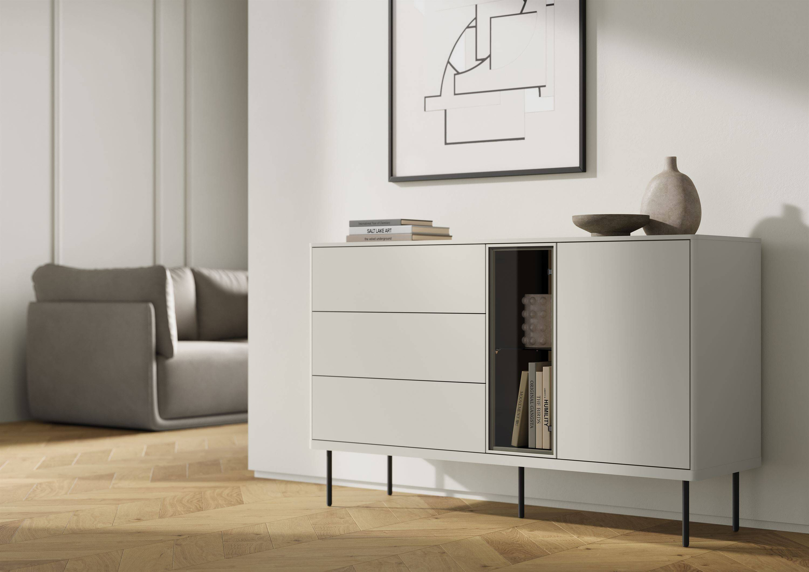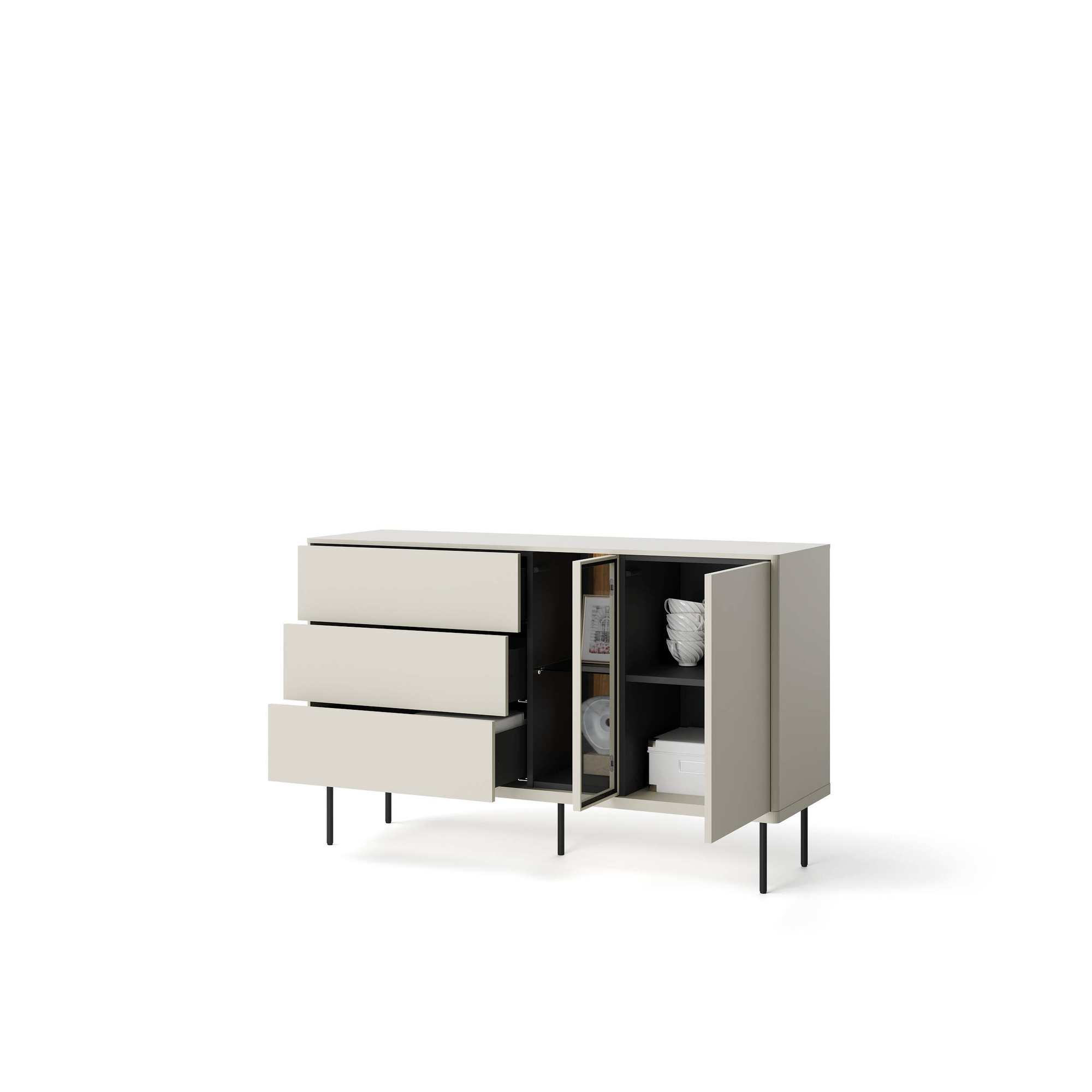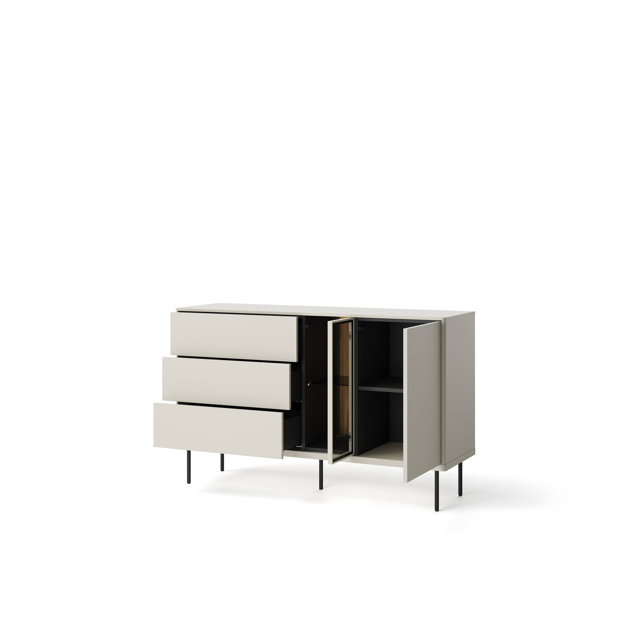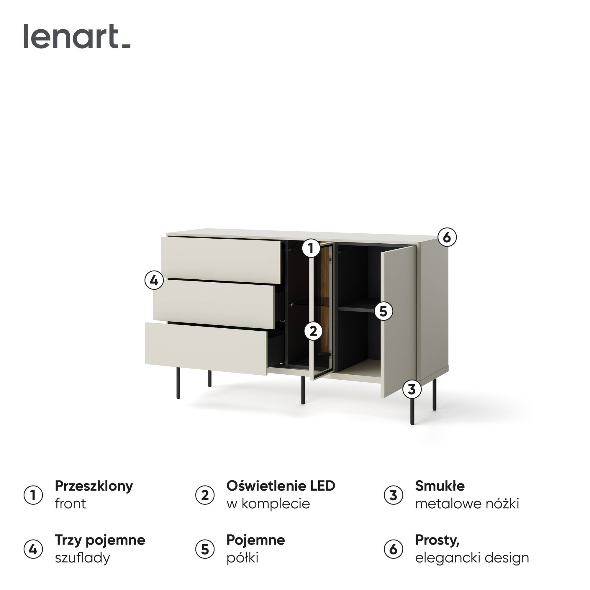 Kaszmirowe fronty oraz ciemny dąb to połączenie, które zyskuje uznanie wśród miłośników eleganckiego minimalizmu. Delikatny kolor frontu dodaje całej komodzie klasy, a przeszklone drzwi z czarnym, hartowanym szkłem stają się idealnym tłem dla eksponowanych elementów dekoracyjnych. Oświetlenie LED, które znajduje się w zestawie, wprowadza przyjemny nastrój, podkreślając unikalny styl mebla oraz akcentując piękno jego zawartości.