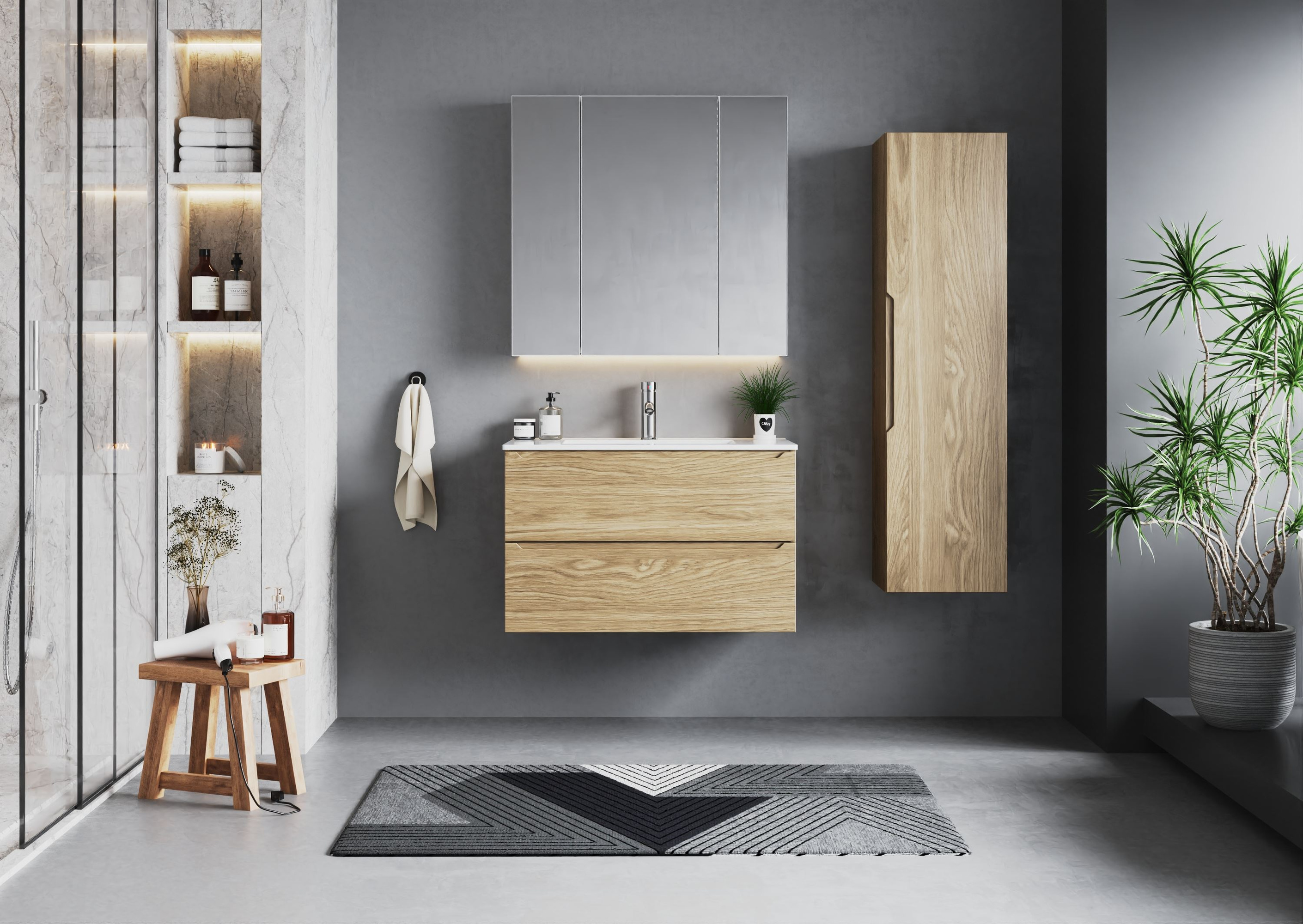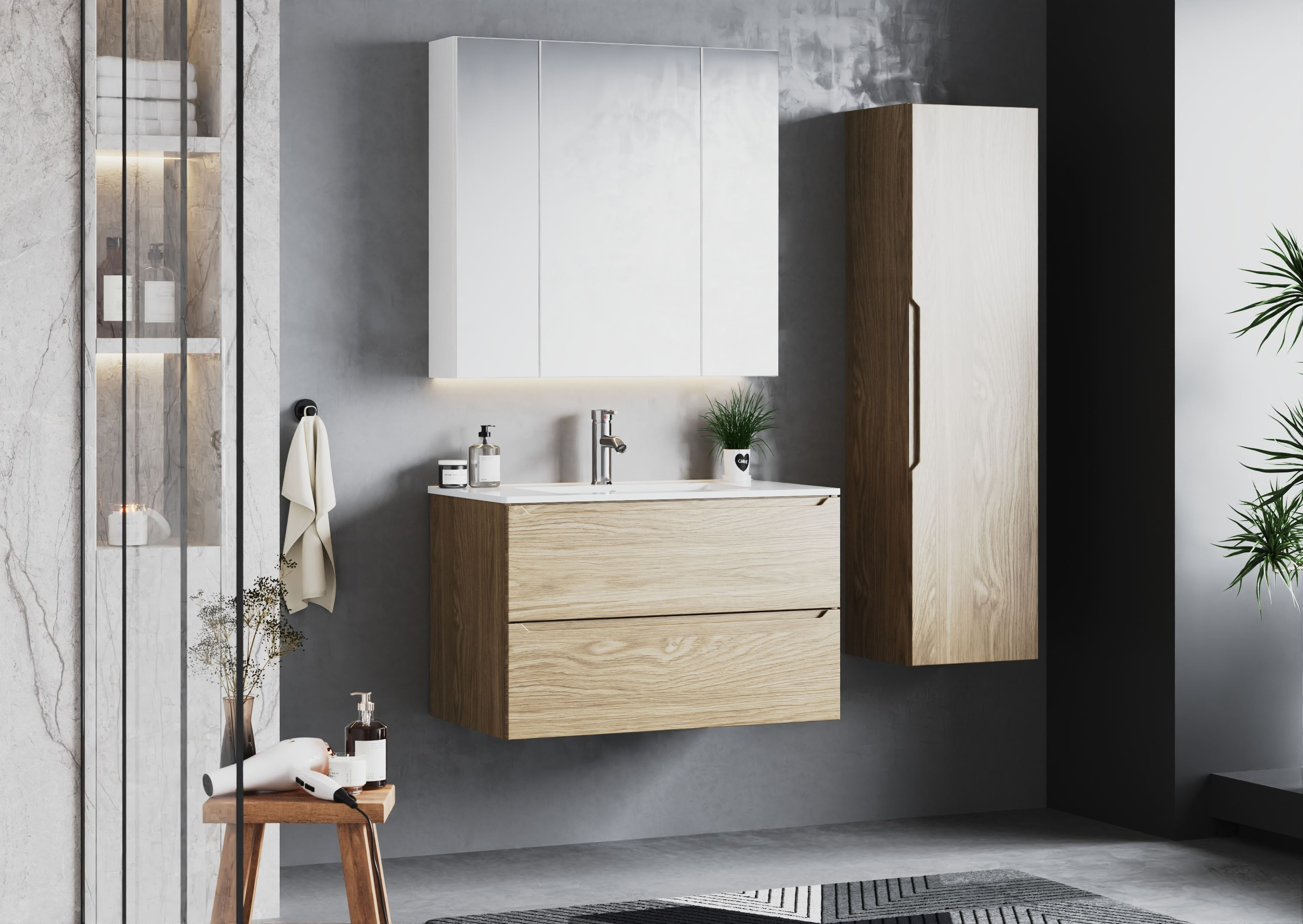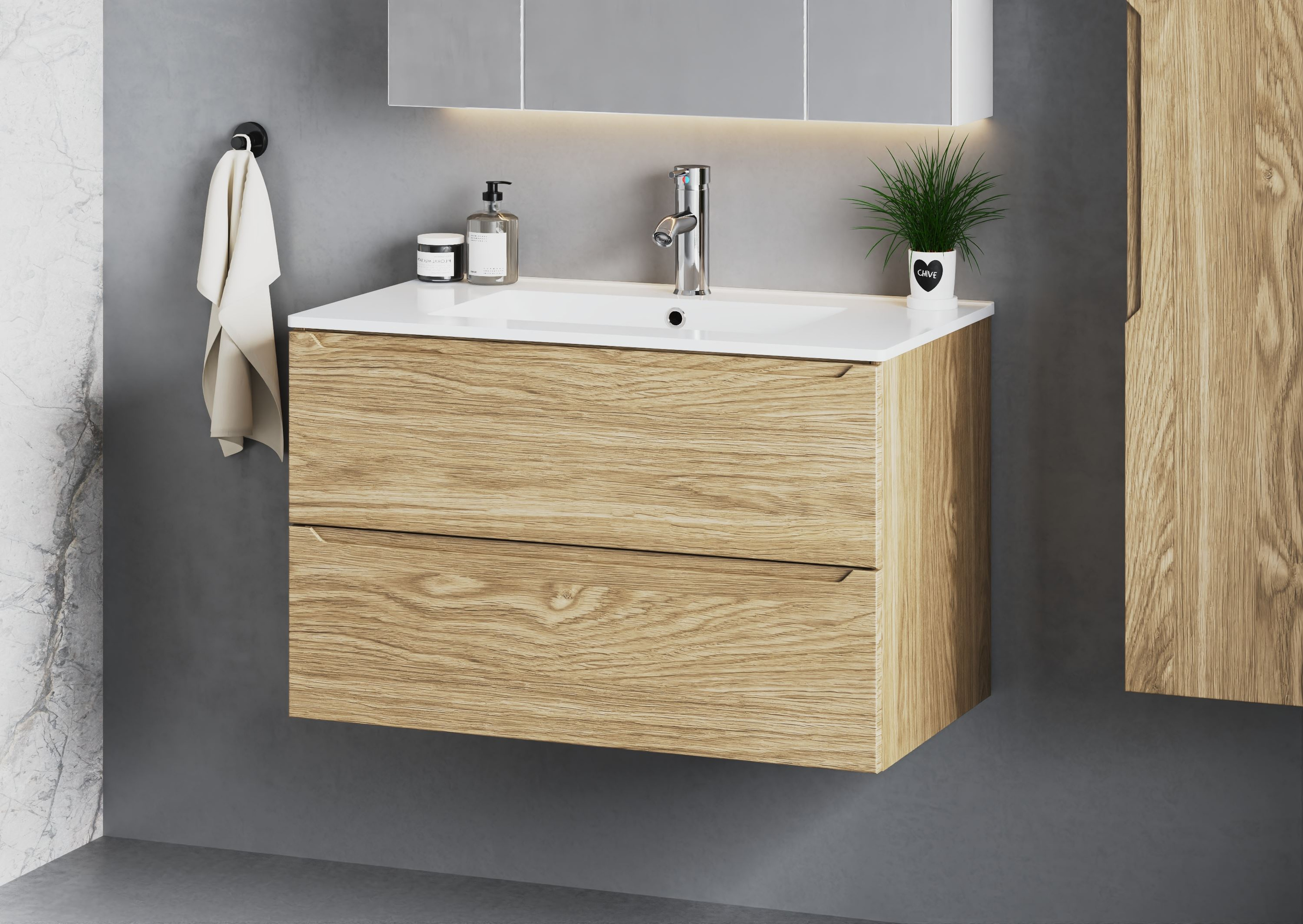 Szafka ETNA-01 to nie tylko **estetyczny detal**, ale także doskonałe rozwiązanie do przechowywania. Dzięki swojej minimalistycznej formie, wpisuje się w aktualne trendy, jednocześnie optymalizując przestrzeń w Twojej łazience. Zainstalowana na ścianie, **uwalnia podłogę**, co optycznie powiększa wnętrze, a także ułatwia utrzymanie czystości. Jej matowe wykończenie frontów dodaje elegancji i subtelności, a ciepły odcień dębu nadaje wnętrzu przytulny charakter.