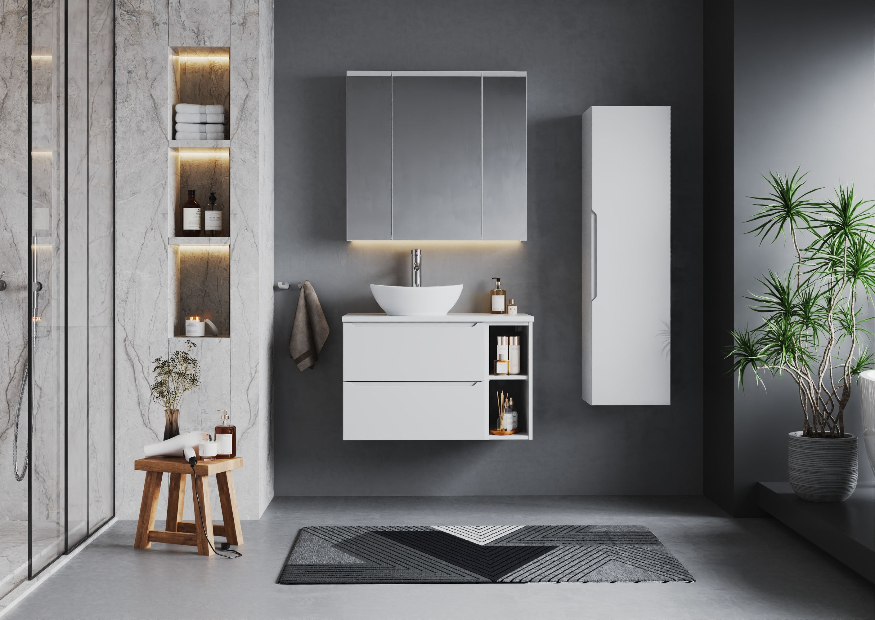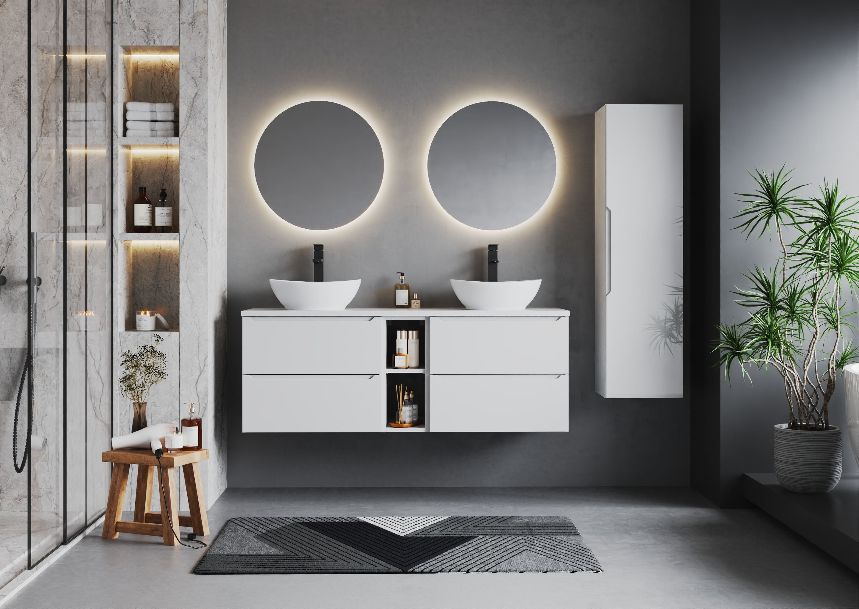 Słupek ETNA-03 wyróżnia się nie tylko estetyką, ale przede wszystkim **praktycznością**. Jego smukła budowa (szerokość 34,5 cm, wysokość 130 cm, głębokość 32 cm) pozwala na efektywne wykorzystanie przestrzeni, co jest nieocenione w mniejszych pomieszczeniach. Z powodzeniem pomieści różnorodne akcesoria, kosmetyki czy ręczniki, a dzięki zamykanej drzwiczkom z cichym domykiem, utrzymasz porządek i estetykę wnętrza w należnym stylu.