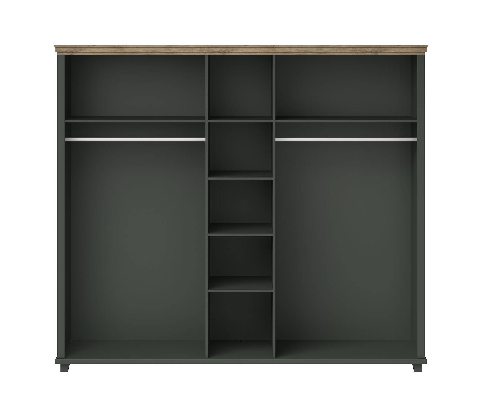 Główne wyróżniki szafy "Evora S" to jej imponujące wymiary: szerokość 246 cm, wysokość 216 cm oraz głębokość 62 cm, co pozwala na komfortowe przechowywanie dużej ilości garderoby. Kolorystyka - zielony w połączeniu z ciepłymi odcieniami Dąb Lefkas - dodaje szafie oryginalnego charakteru i sprawia, że będzie ona dominującym elementem każdej aranżacji.