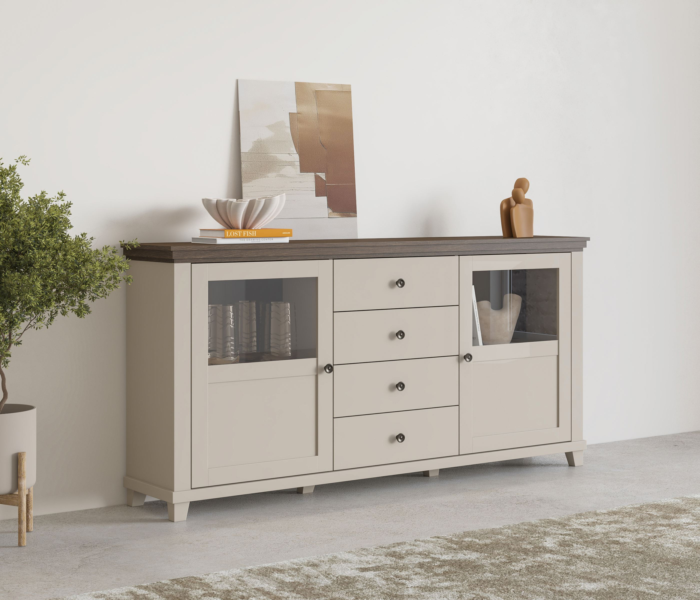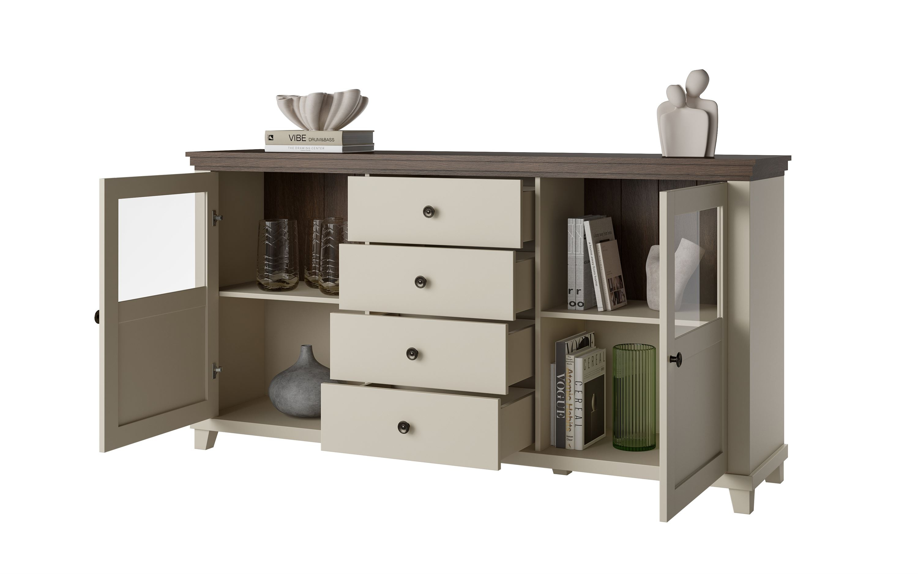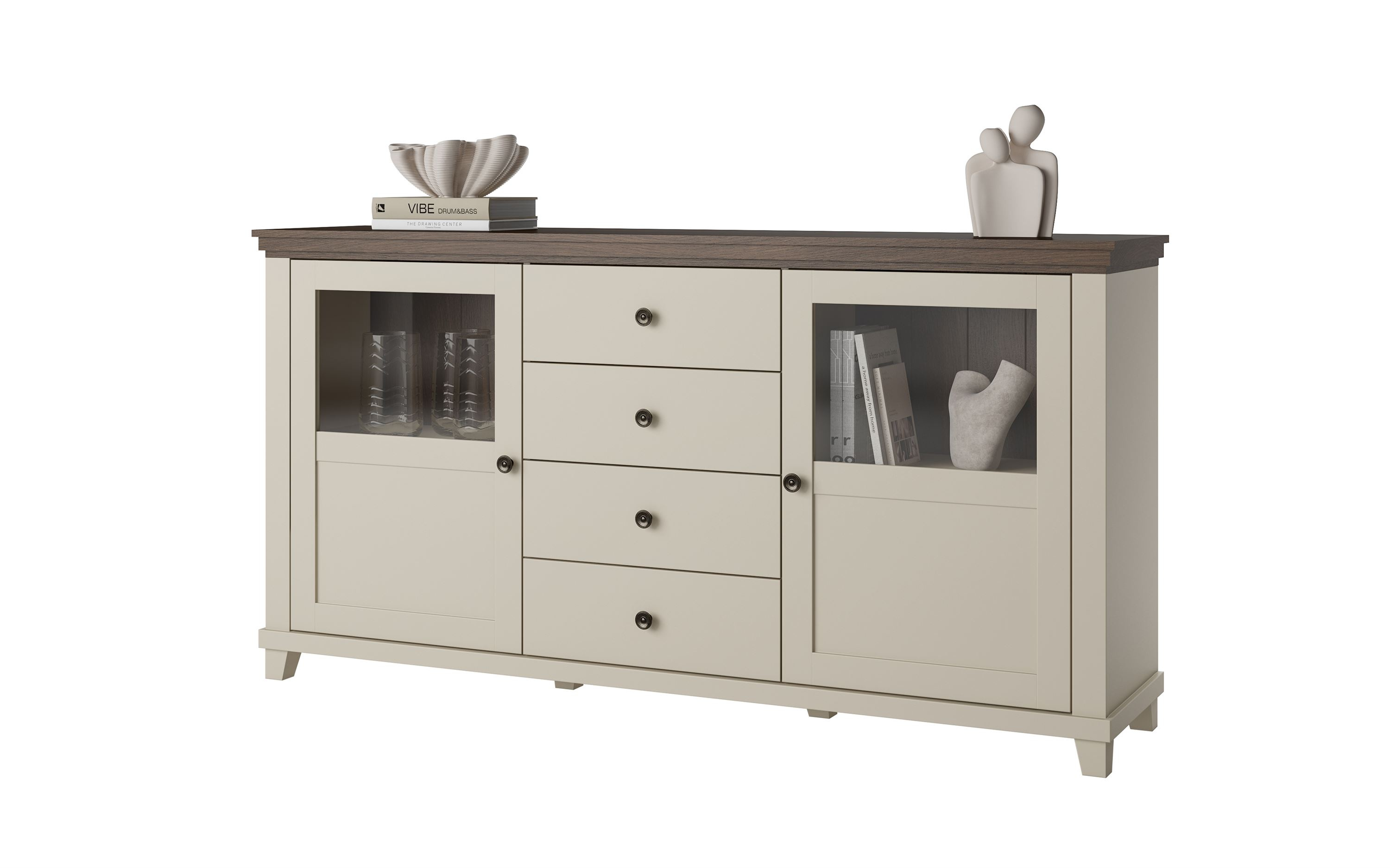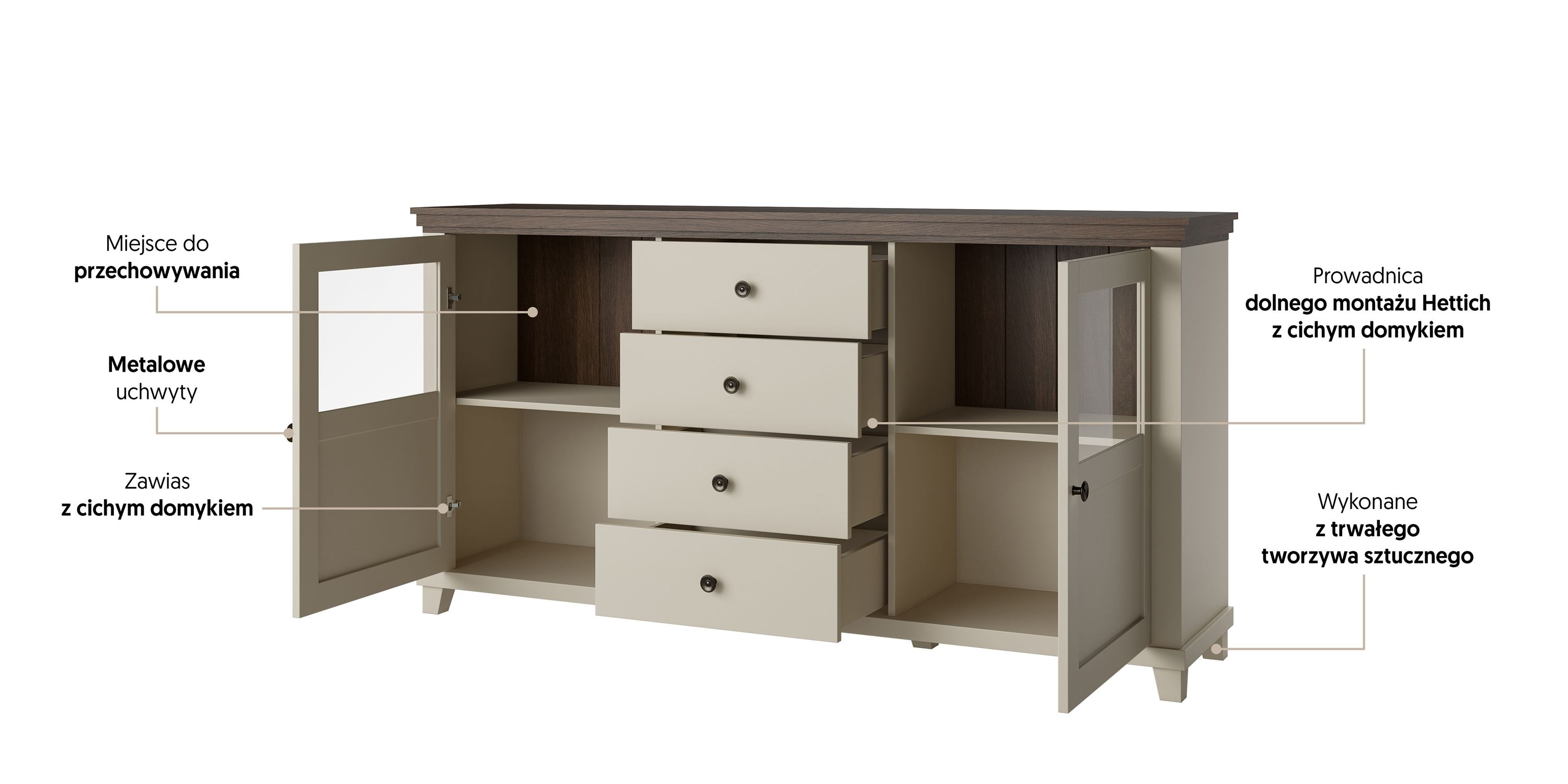 Korzystając z komody Evora, zyskujesz nie tylko estetyczny element wystroju, ale także niezwykle praktyczne rozwiązanie do organizacji przestrzeni. Jej cztery pojemne szuflady i dwie szafki pomogą Ci w utrzymaniu porządku, oferując odpowiednie miejsce na ubrania, bieliznę czy drobiazgi. Dzięki cichym domykowym prowadnicom, otwieranie i zamykanie szuflad staje się przyjemnością, a nie uciążliwością.
