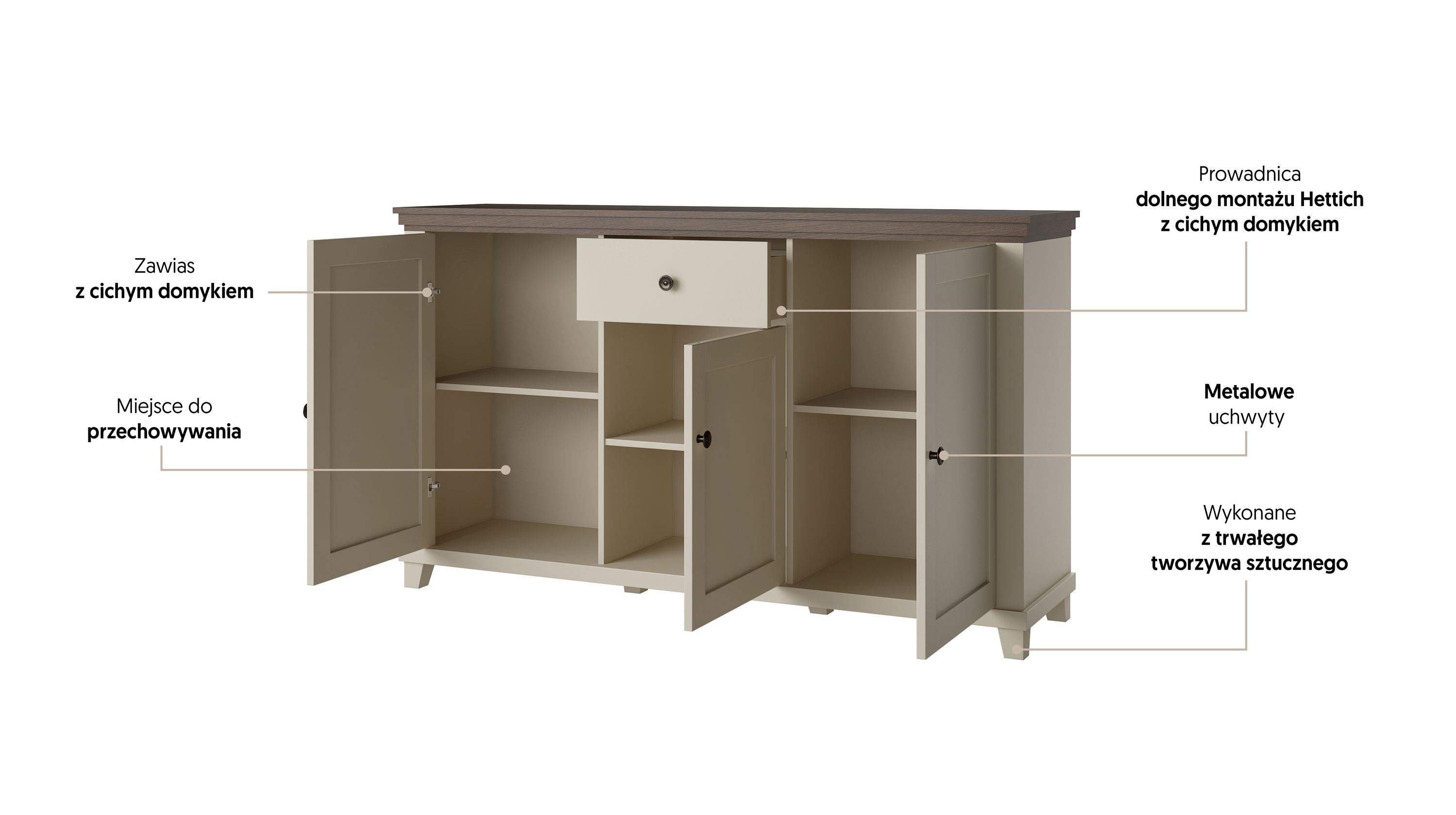 Komoda o wymiarach 160 cm szerokości, 93 cm wysokości i 42 cm głębokości jest nie tylko przestronna, ale również wyjątkowo praktyczna. Trzy przestronne szuflady oraz dodatkowa półka pomogą Ci w uporządkowaniu wszystkich niezbędnych przedmiotów - od dokumentów po ulubione książki. Dzięki cichym domkom i zawiasom, korzystanie z niej staje się komfortowe i przyjemne, a jednocześnie zachowuje się elegancki wygląd mebla.