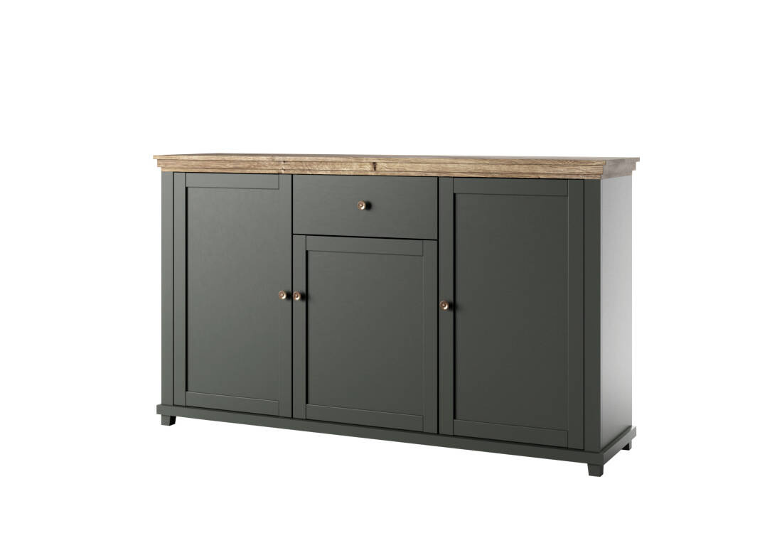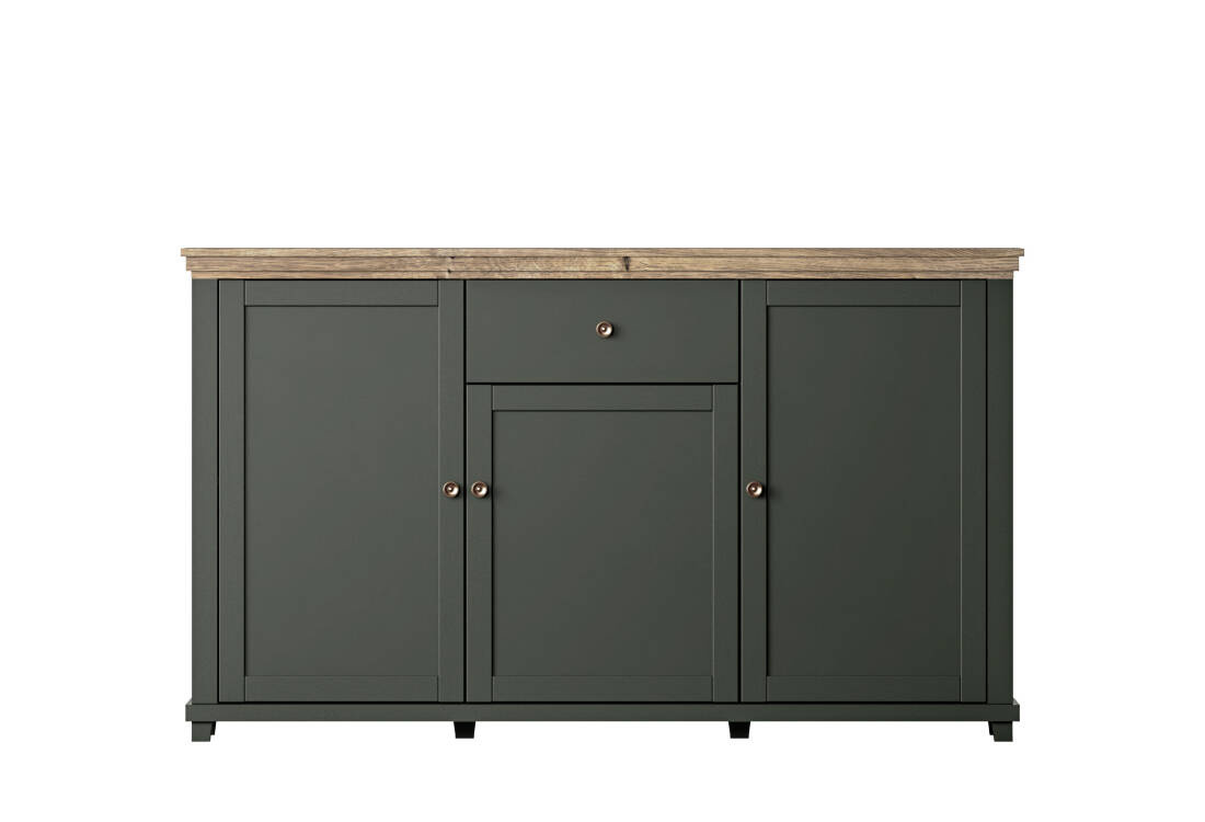 Stworzona z myślą o tych, którzy cenią sobie styl i funkcjonalność. Komoda posiada trzy przestronne drzwi oraz jedną pojemną szufladę, umożliwiające zapewnienie porządku i estetyczne przechowywanie różnorodnych przedmiotów. Klasyczne, matowe fronty z MDF pokryte są folią w odcieniu zielonym, które doskonale kontrastują z korpusami o wyglądzie naturalnego dębu Lefkas.
