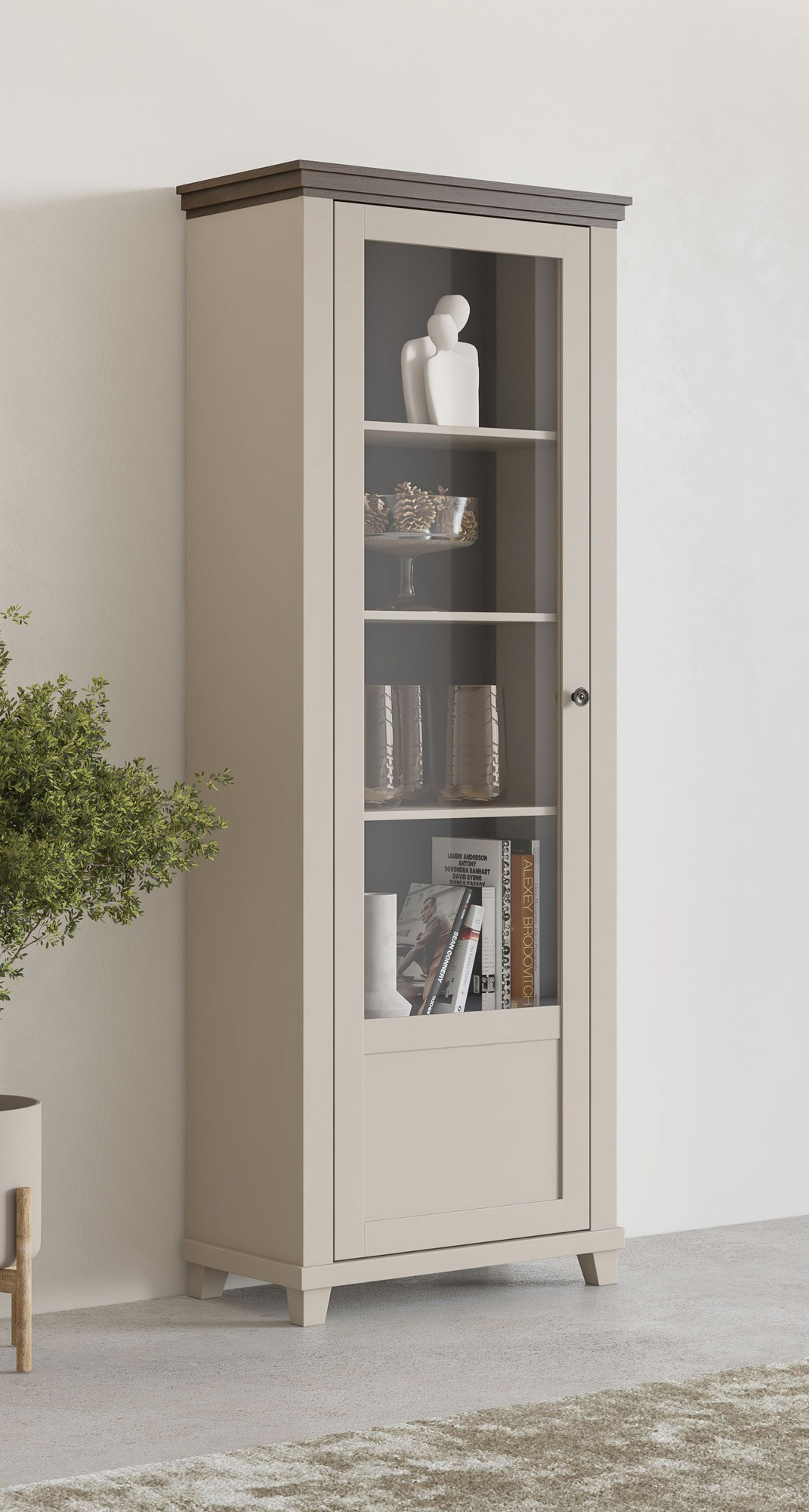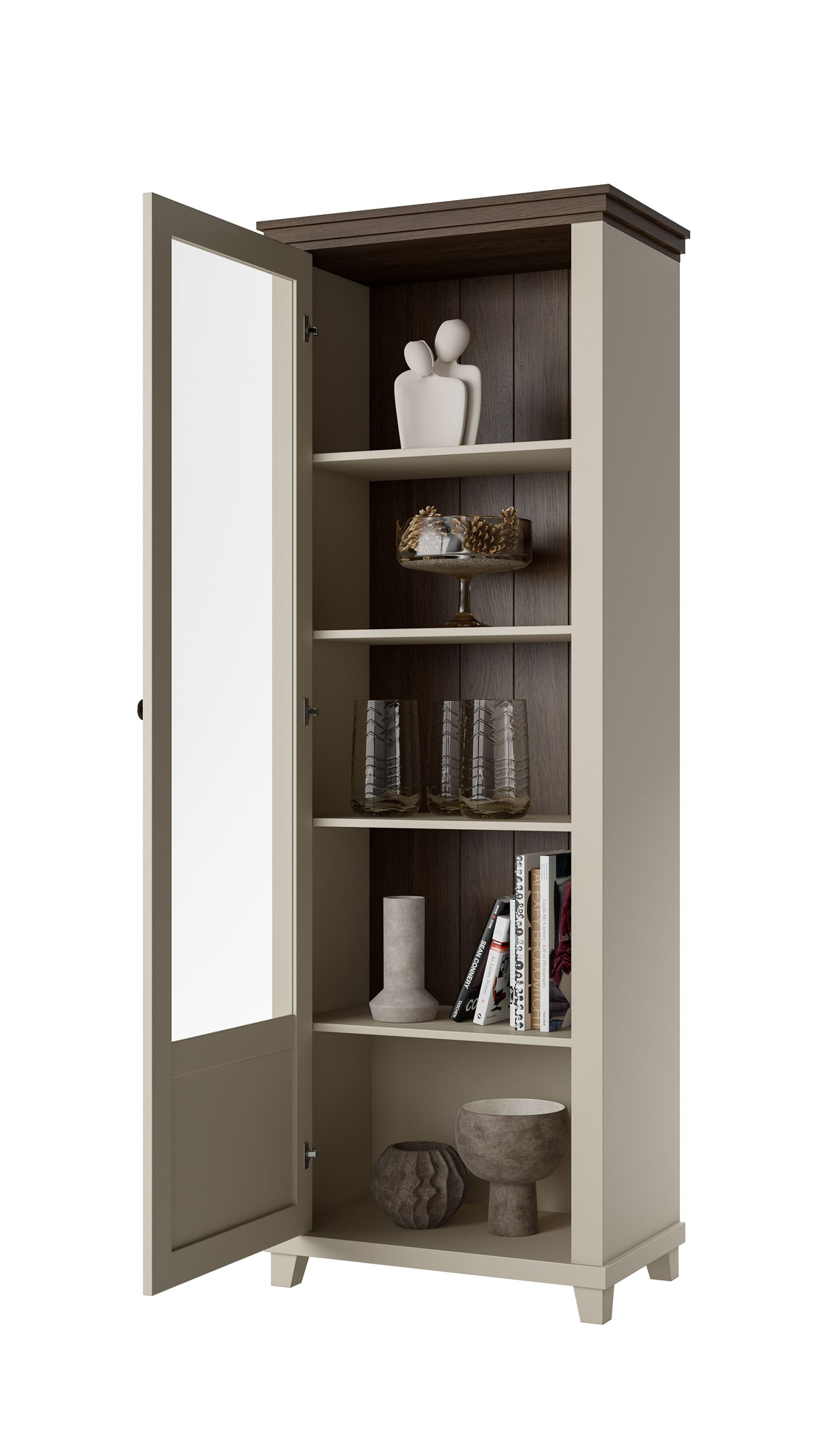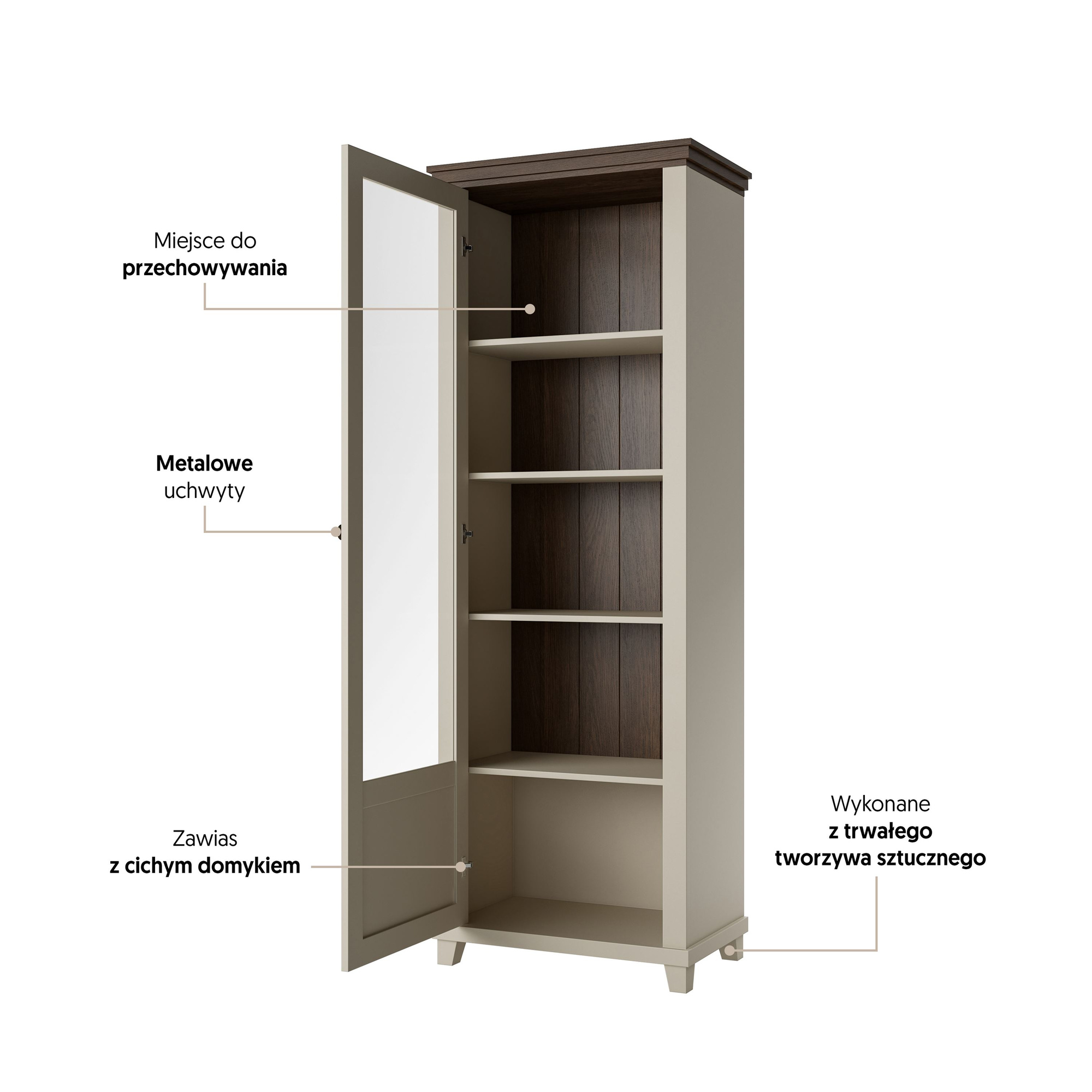 Beżowy jasny kolor korpusu i frontu sprawia, że witryna Evora WM wpasuje się w różnorodne palety kolorystyczne, dodając lekkości i świeżości Twojemu wnętrzu. Głębokość wynosząca 42 cm sprawia, że mebel jest praktyczny, a jednocześnie zajmuje niewiele miejsca, co jest szczególnie ważne w mniejszych pomieszczeniach. Metalowe uchwyty w czarnym macie to interesujący akcent, który podkreśla nowoczesny charakter mebla.