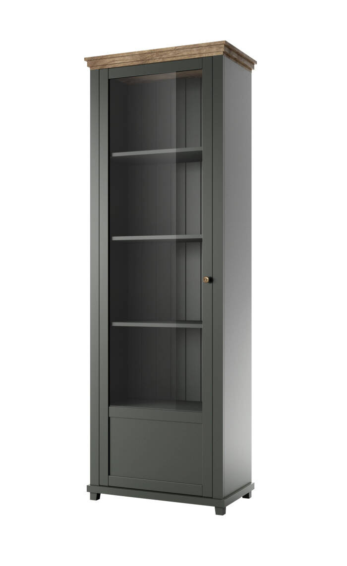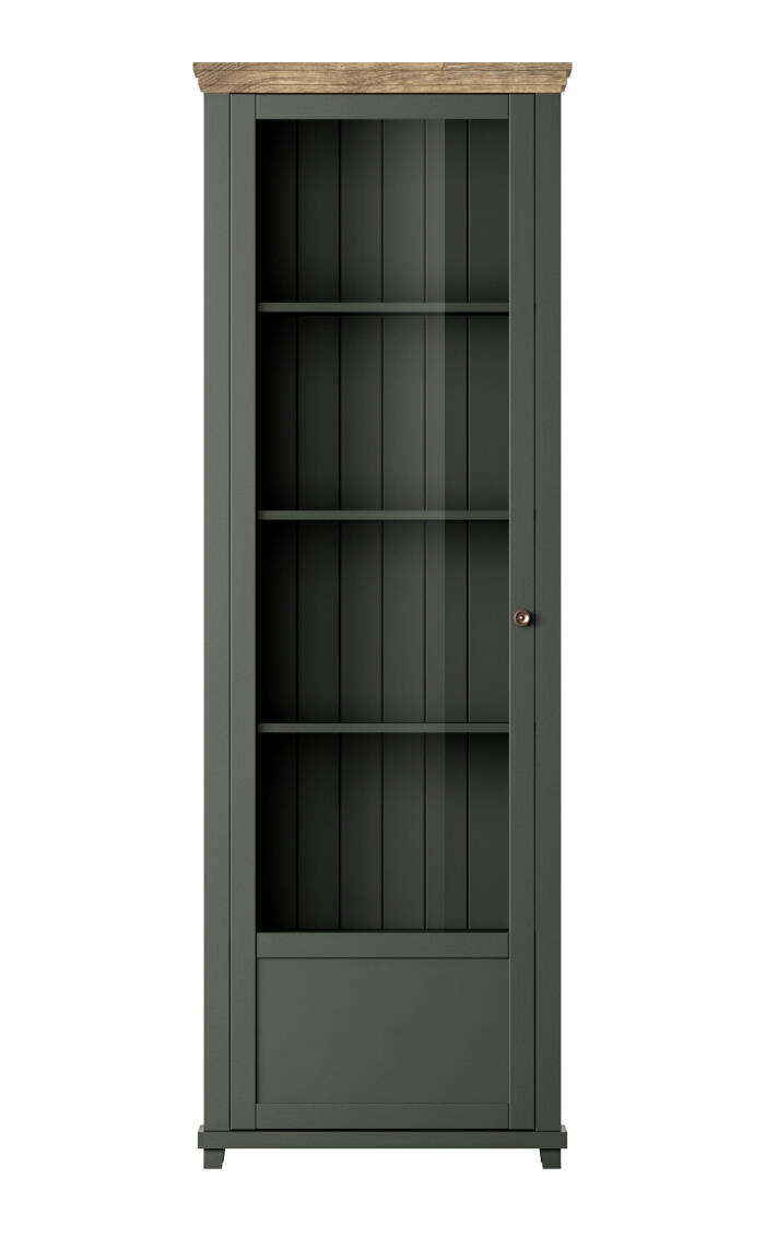 - Elegancka witryna Evora WM w odcieniach zieleni i dębu Lefkas. Szer.: 71 cm, Wys.: 200 cm, Głęb.: 42 cm. MDF z folią, płyta laminowana, 1 drzwi, 4 półki, opcja LED. Do samodzielnego montażu.