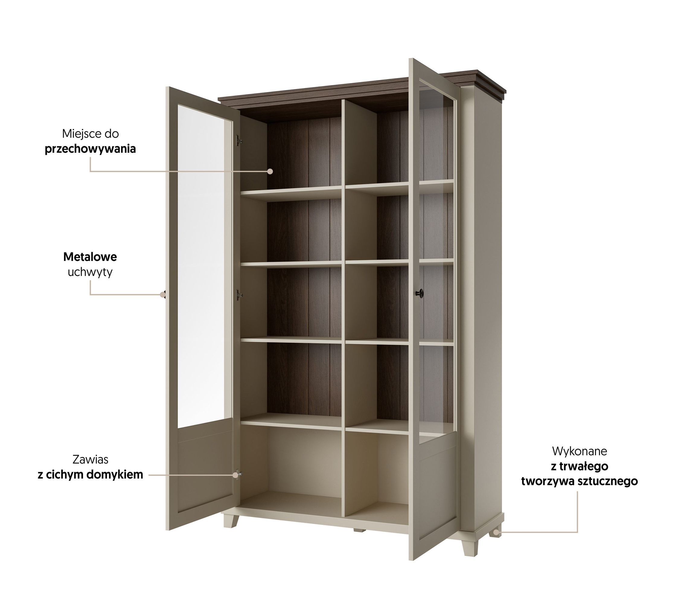 Nie tylko estetyka przyciąga uwagę, ale także praktyczność tego mebla. Witryna wyposażona jest w przestronne półki, które pomieszczą Twoje ulubione książki, kolekcję ozdobnych filiżanek czy rodzinne zdjęcia. Dzięki systemowi cichego domyku możesz być pewny, że każdy otwierany i zamykany front będzie działał płynnie i bezgłośnie, co z pewnością umili czas spędzany w jej towarzystwie.