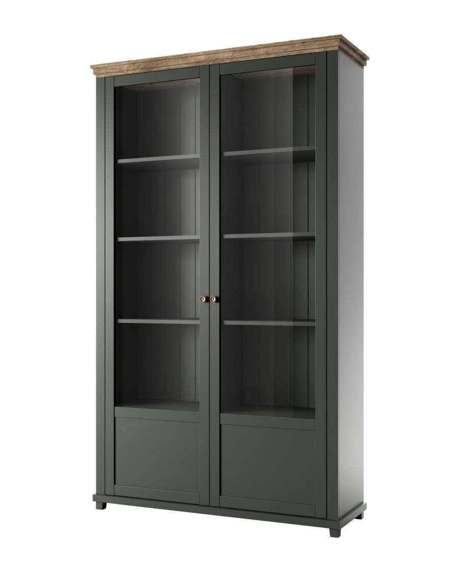 - "Evora WM - elegancka 2-drzwiowa witryna w kolorze zielonym i dębu Lefkas. Wymiary: 126x200x42 cm. Materiały: front z MDF, korpus laminowany. Zawiera 6 półek, opcjonalne oświetlenie LED. Do samodzielnego montażu."