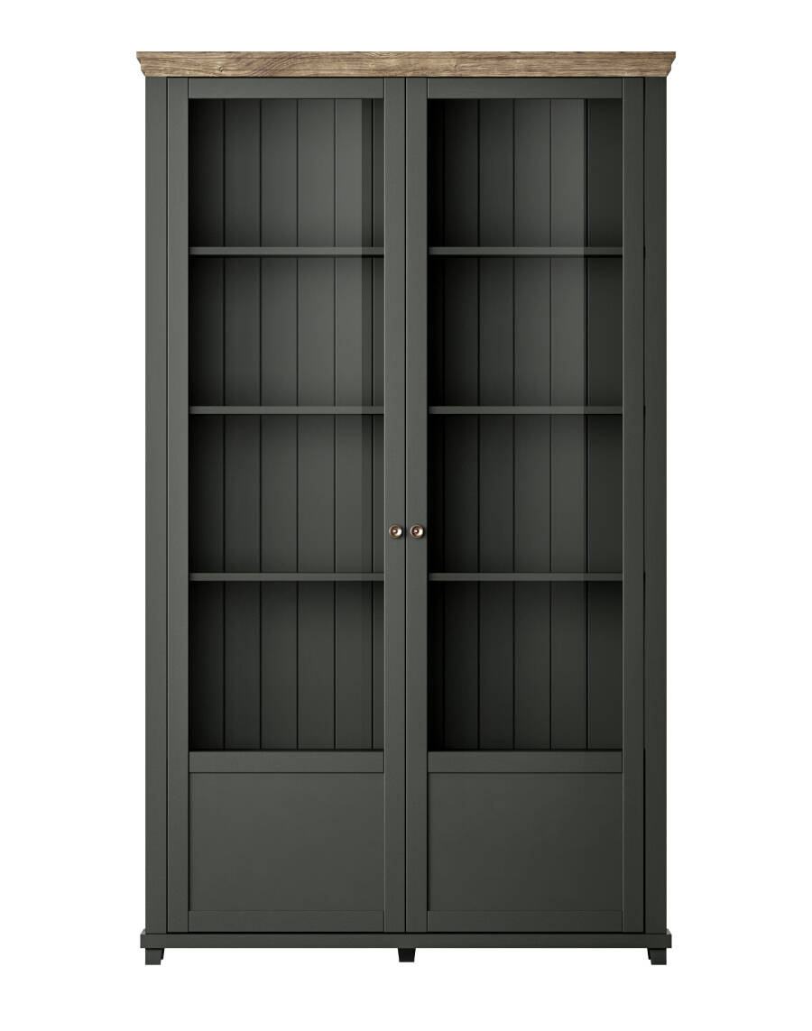Szafa zapewnia mnóstwo przestrzeni dzięki dwóm dużym drzwiom oraz sześciu półkom, co pozwala na eleganckie wyeksponowanie dekoracji, zbiorów książek czy zastawy stołowej. Do indywidualnej organizacji przestrzeni, możesz dostosować układ półek, tworząc idealne miejsce dla swoich przedmiotów. Dodatkowo, witryna oferuje możliwość zamontowania oświetlenia LED, które nie tylko podkreśli wygląd eksponowanych rzeczy, ale także doda przytulności pomieszczeniu.
