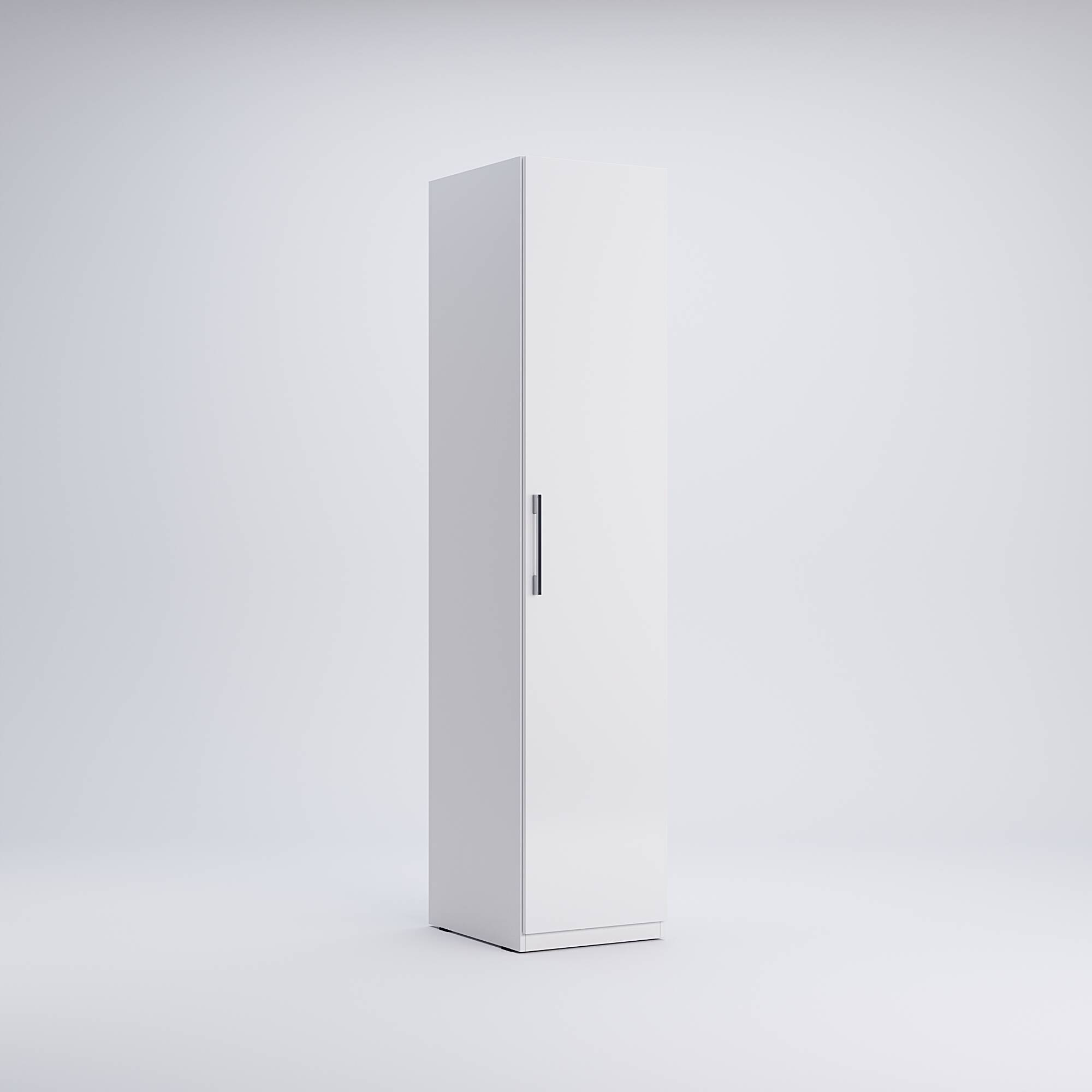 Minimalistyczna szafa 1-drzwiowa Family FM-11-WB marki MiroMark w białym macie i połysku. Wykonana z laminowanej płyty, idealna do nowoczesnych wnętrz. Elegancka i pojemna, z półkami na eksponowanie ulubionych dodatków. Styl i funkcjonalność w jednym.