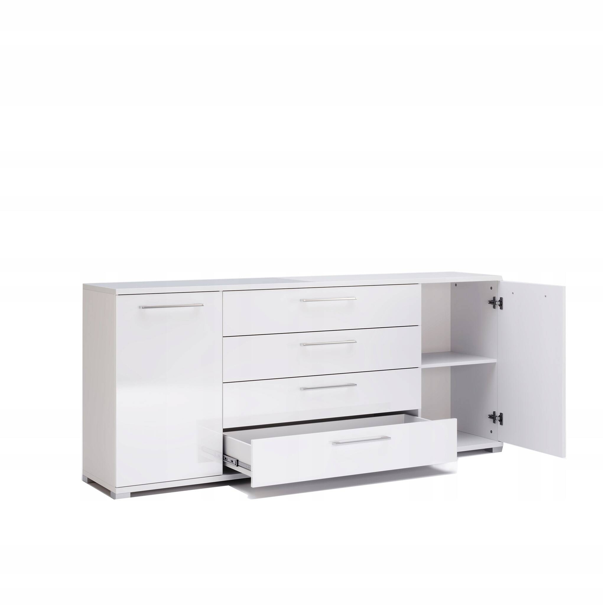 Elegancka komoda Family FM-169-WB od MiroMark, łączy biały mat z wysokim połyskiem. Wykonana z płyty laminowanej, idealna do nowoczesnych wnętrz. Minimalistyczny design, 2 drzwi i 4 szuflady zapewniają funkcjonalność i styl. Doskonała do przechowywania.