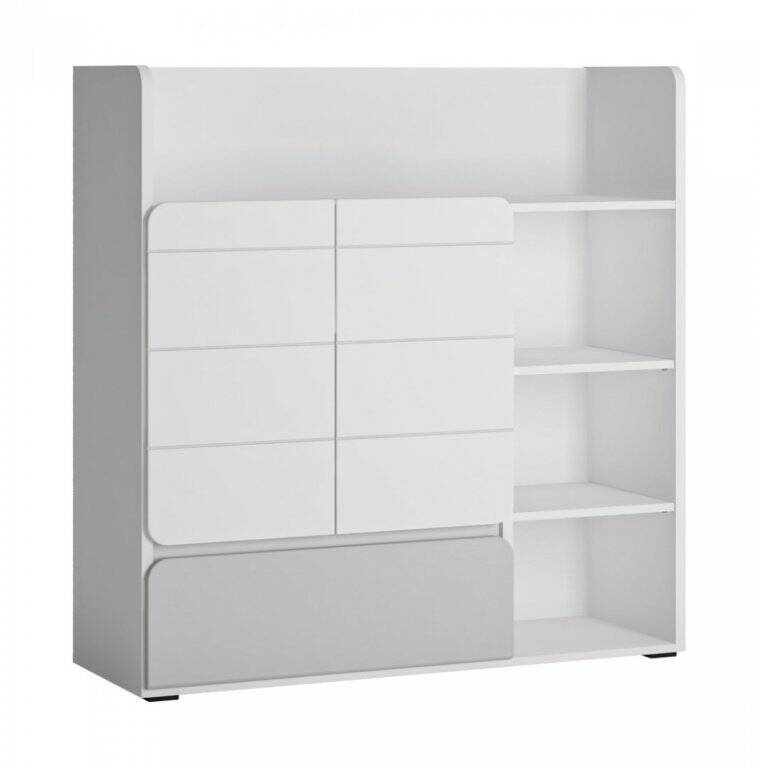 Regał Flexi FLXR03 łączy elegancję z funkcjonalnością – oferuje półki z drzwiami, pełnowysuwną szufladę i otwarte przestrzenie. Bezpieczny system bezuchwytowy i zaokrąglone boki to idealny wybór dla rodzin.